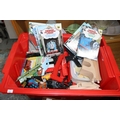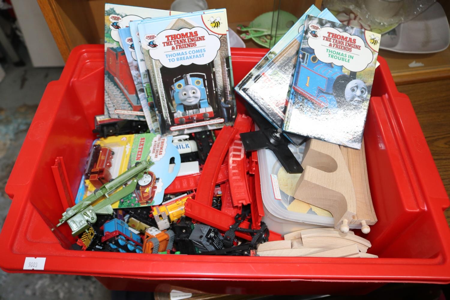 A box of assorted ertl Thomas the Tank Engine items, brio, books etc