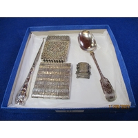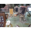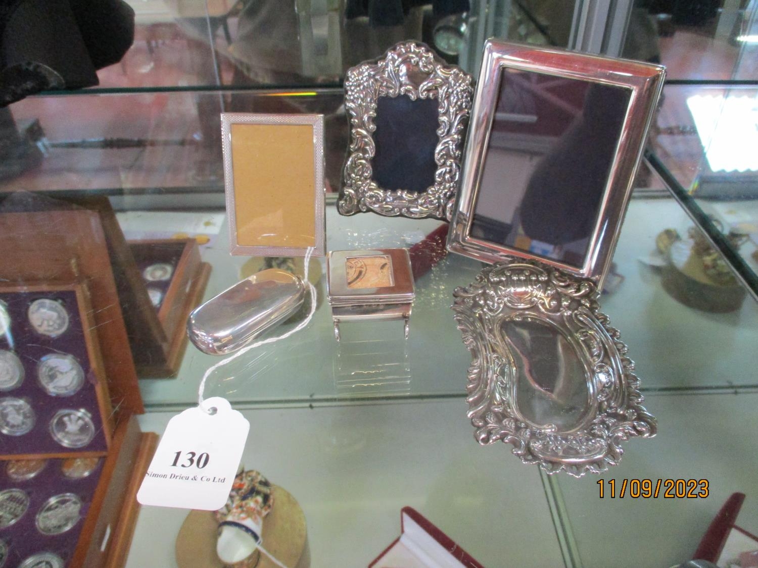 Three silver picture frames, a kidney shaped dish with foliate decoration, a stamp box and a coin case