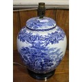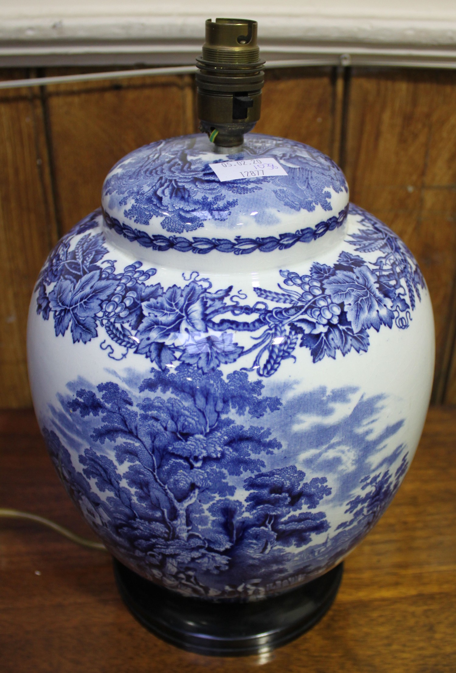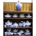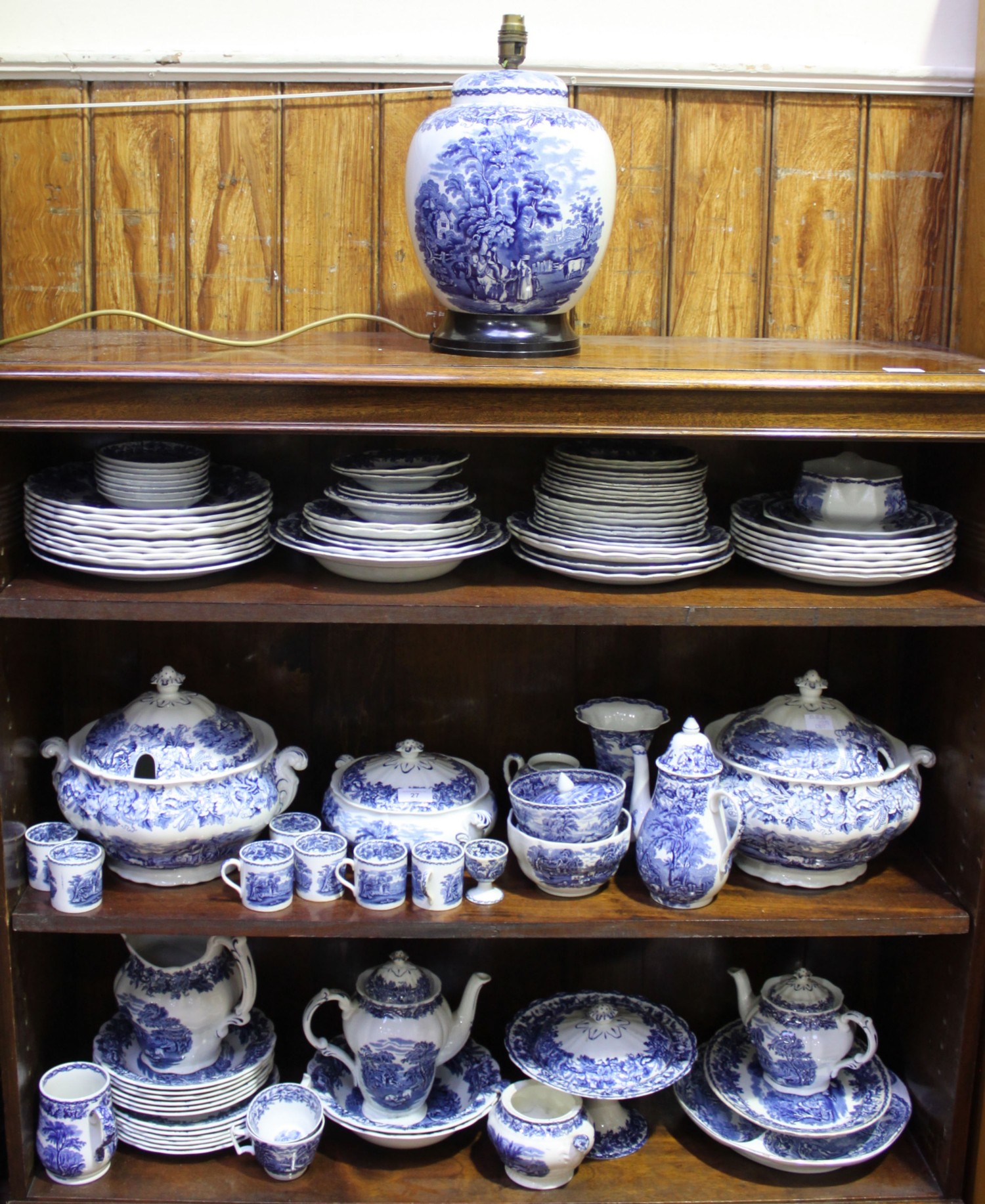 A large quantity of Booths 'British Scenery' blue and white pottery dinner and tablewares including two large tureens and covers, hors d'oeuvres dish, tea and coffee pots, six coffee cans and saucers, water jug, bowls, dinner and side plates, cake stand, gravy boat and lamp etc. (96 pieces)