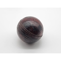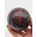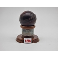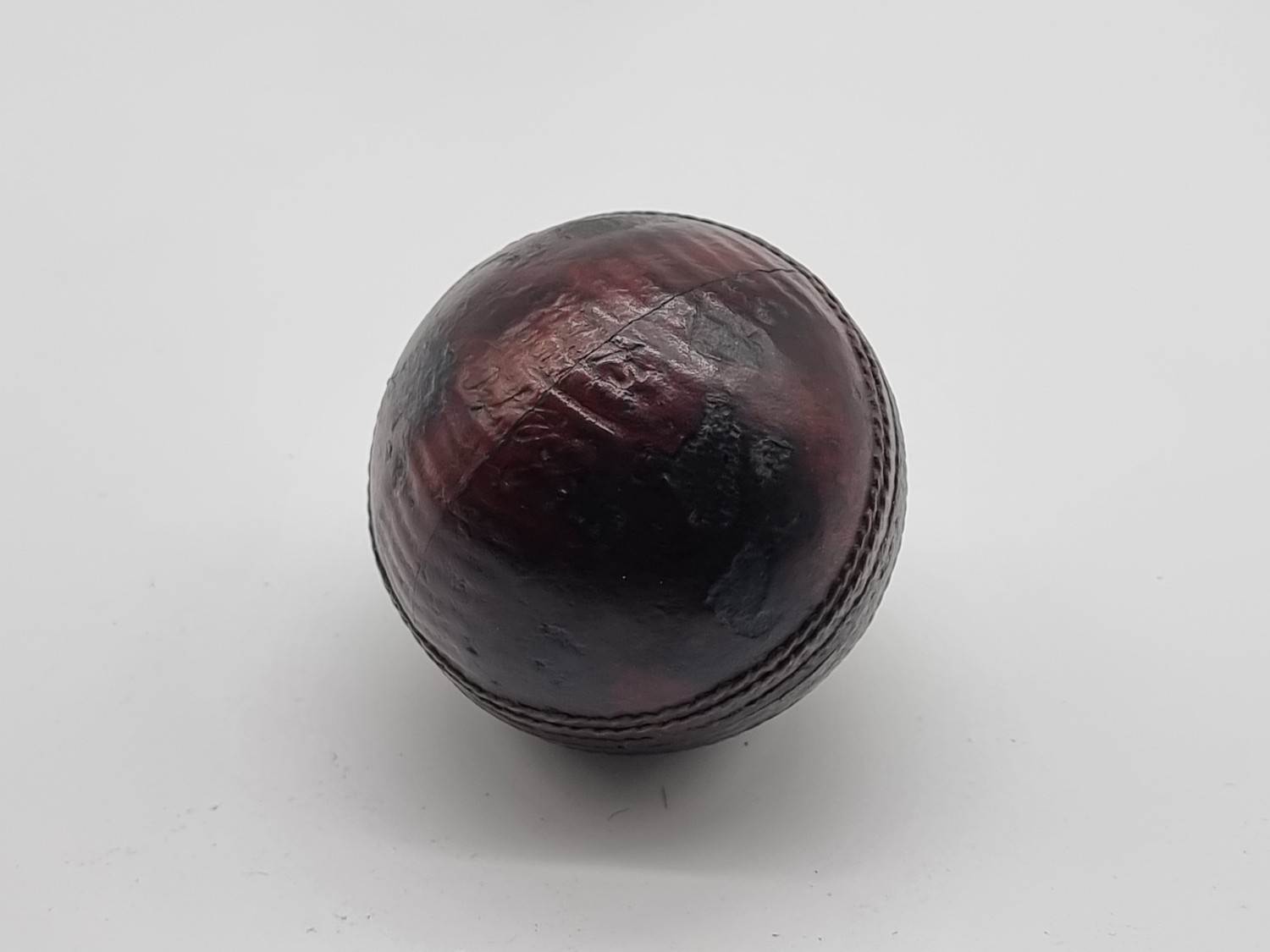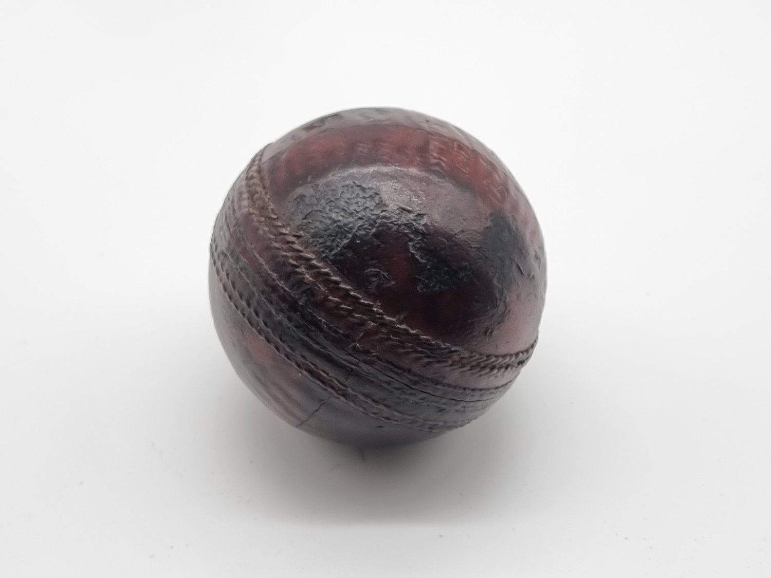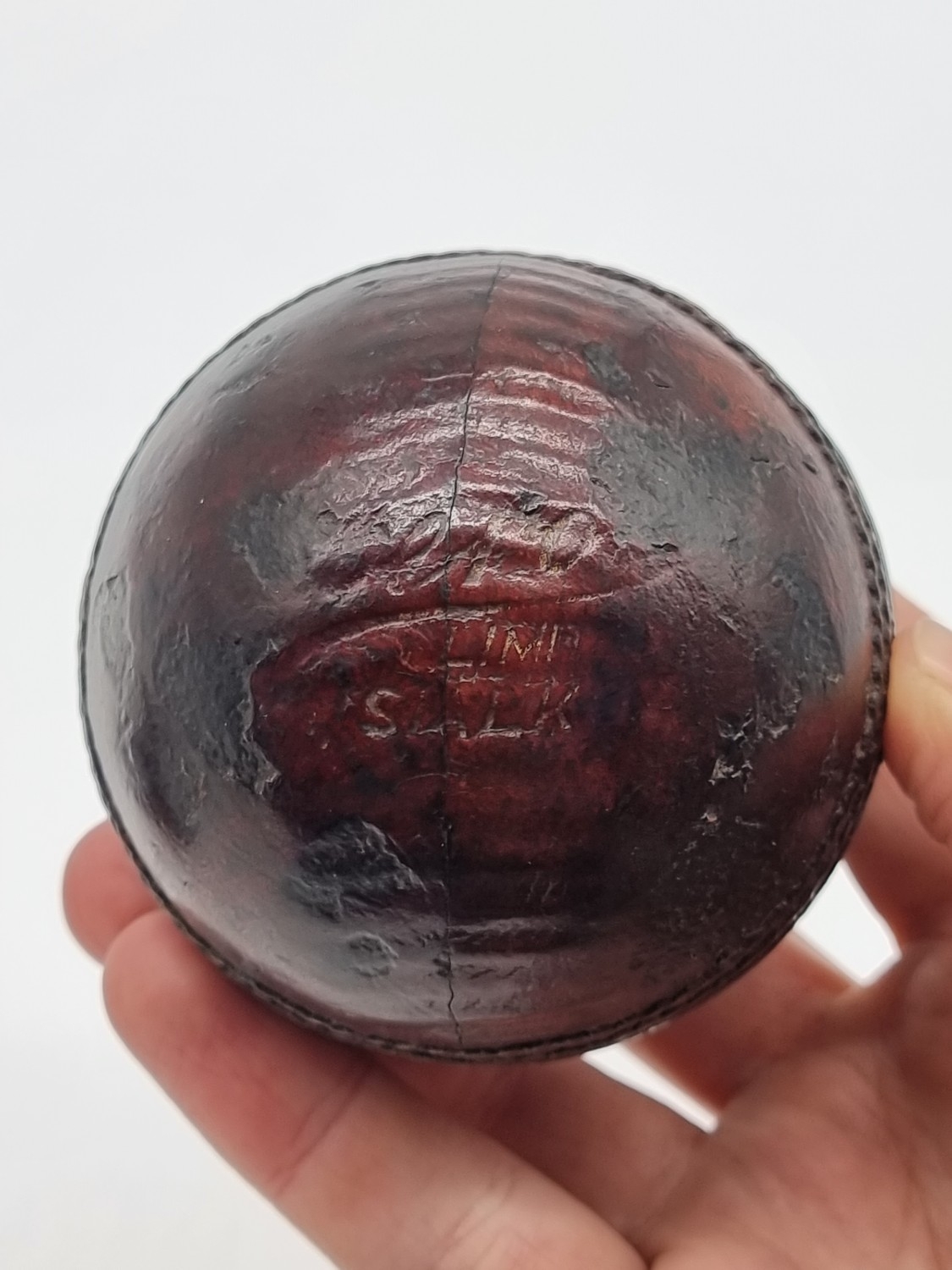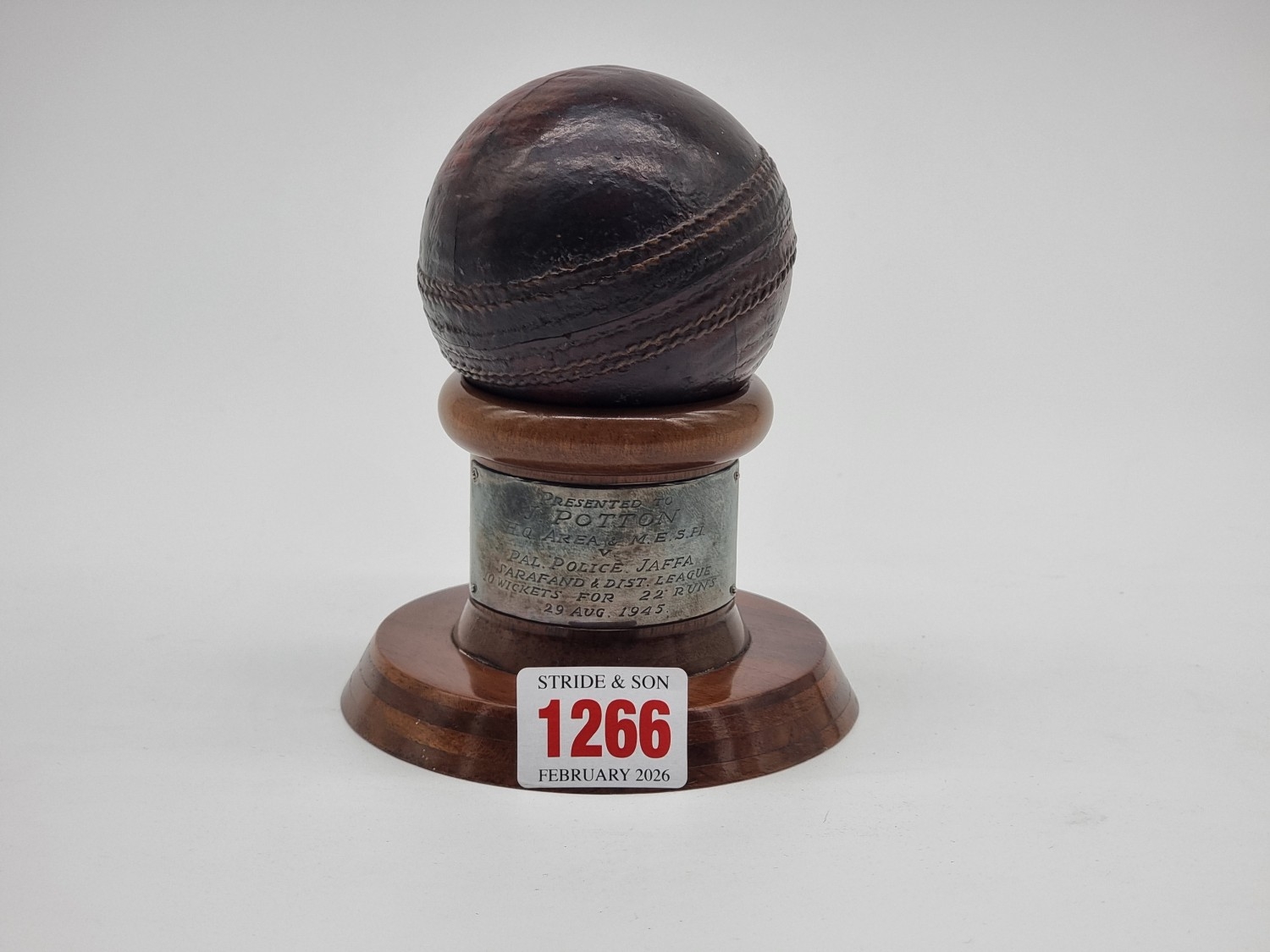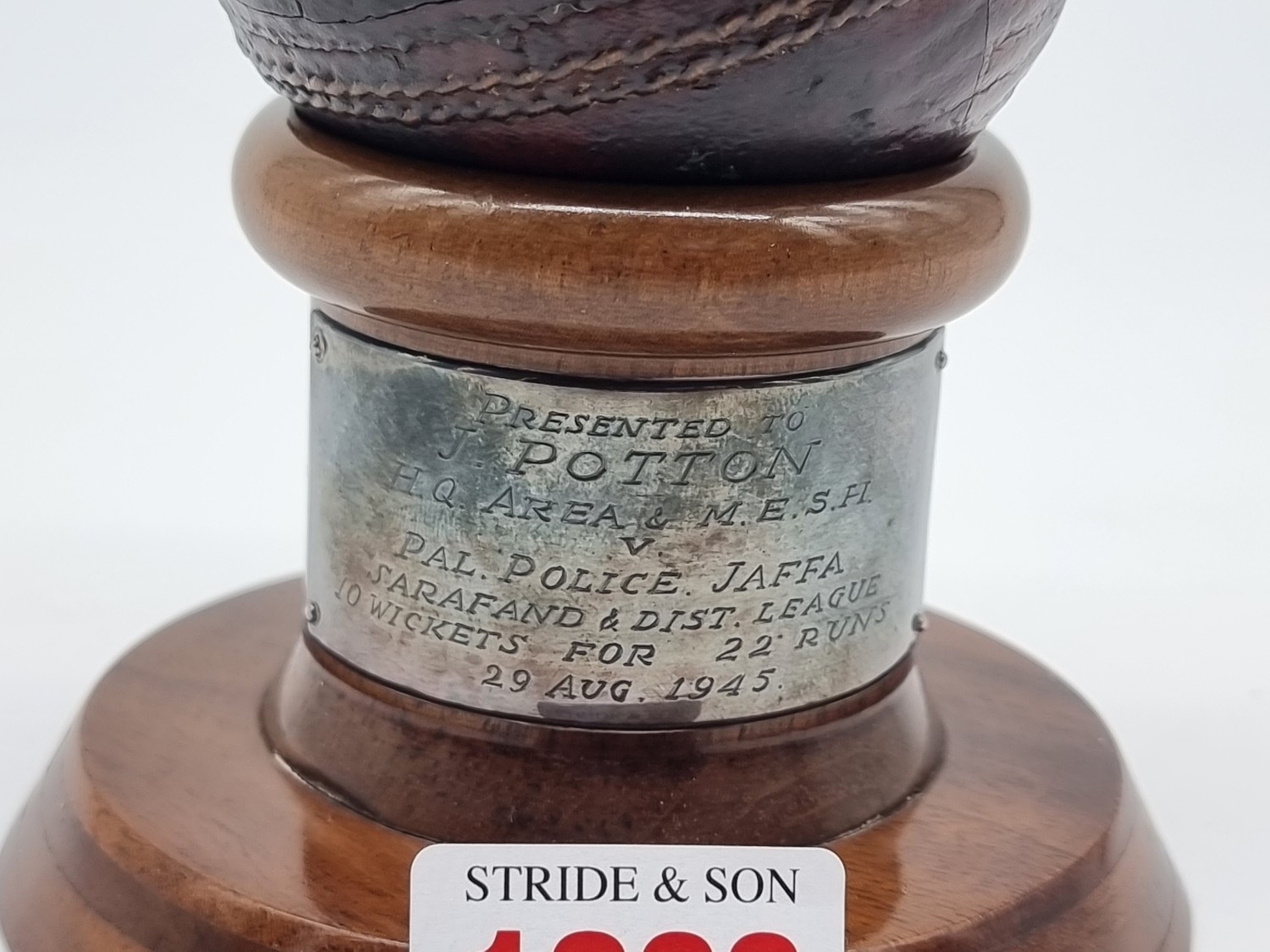 A vintage cricket ball, on mahogany stand with electroplated plaque inscribed 'Presented to J Potton,... Sarafand & District League, 10 Wickets for 22 Runs, 29 Aug 1945'.