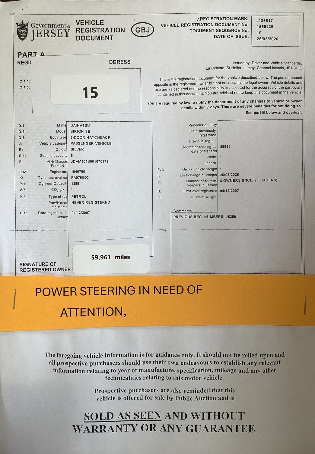 A 2007 Daihatsu Sirion SE 1.3 five door hatchback J136817 (petrol/manual), odometer reading 59,961 miles
