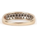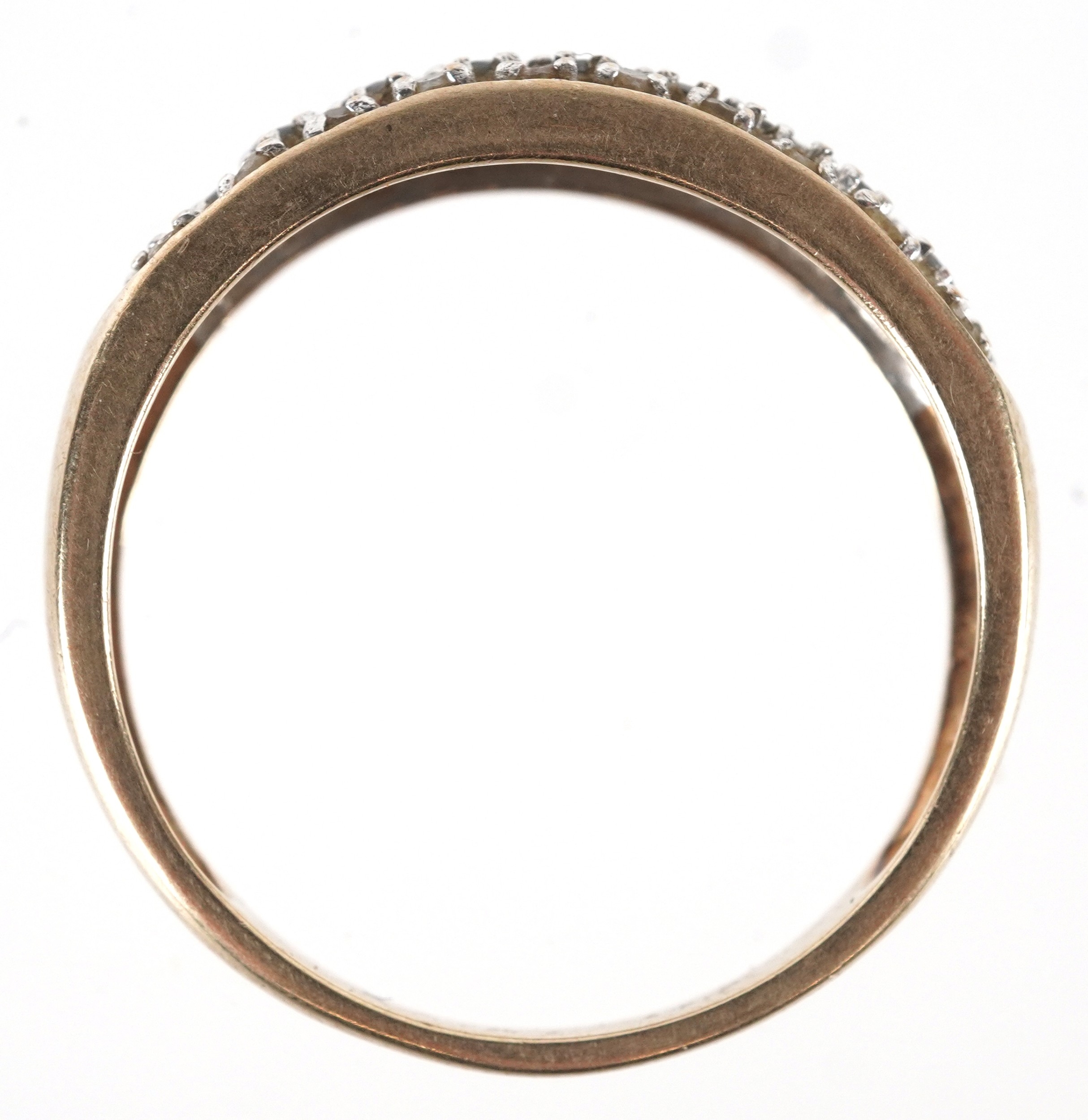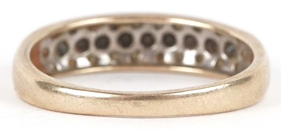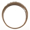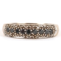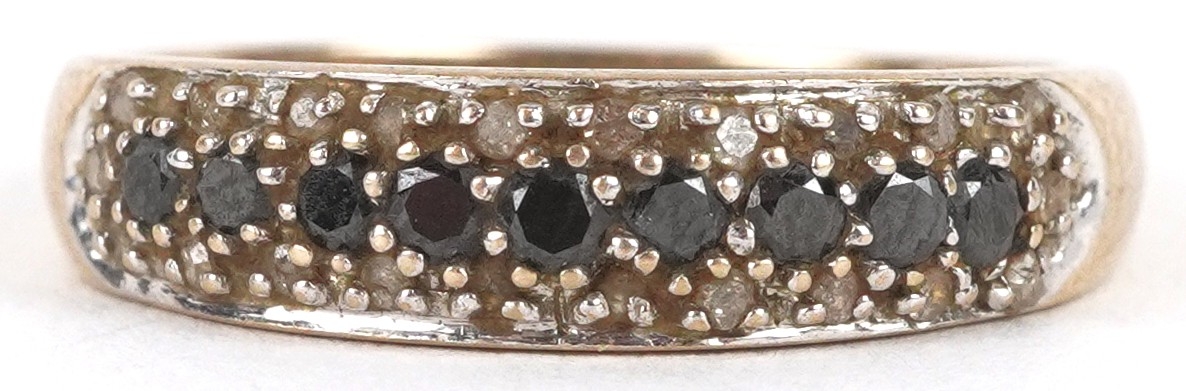 A 9ct gold black and white diamond three row half eternity ring, size P, 2.1g.