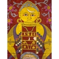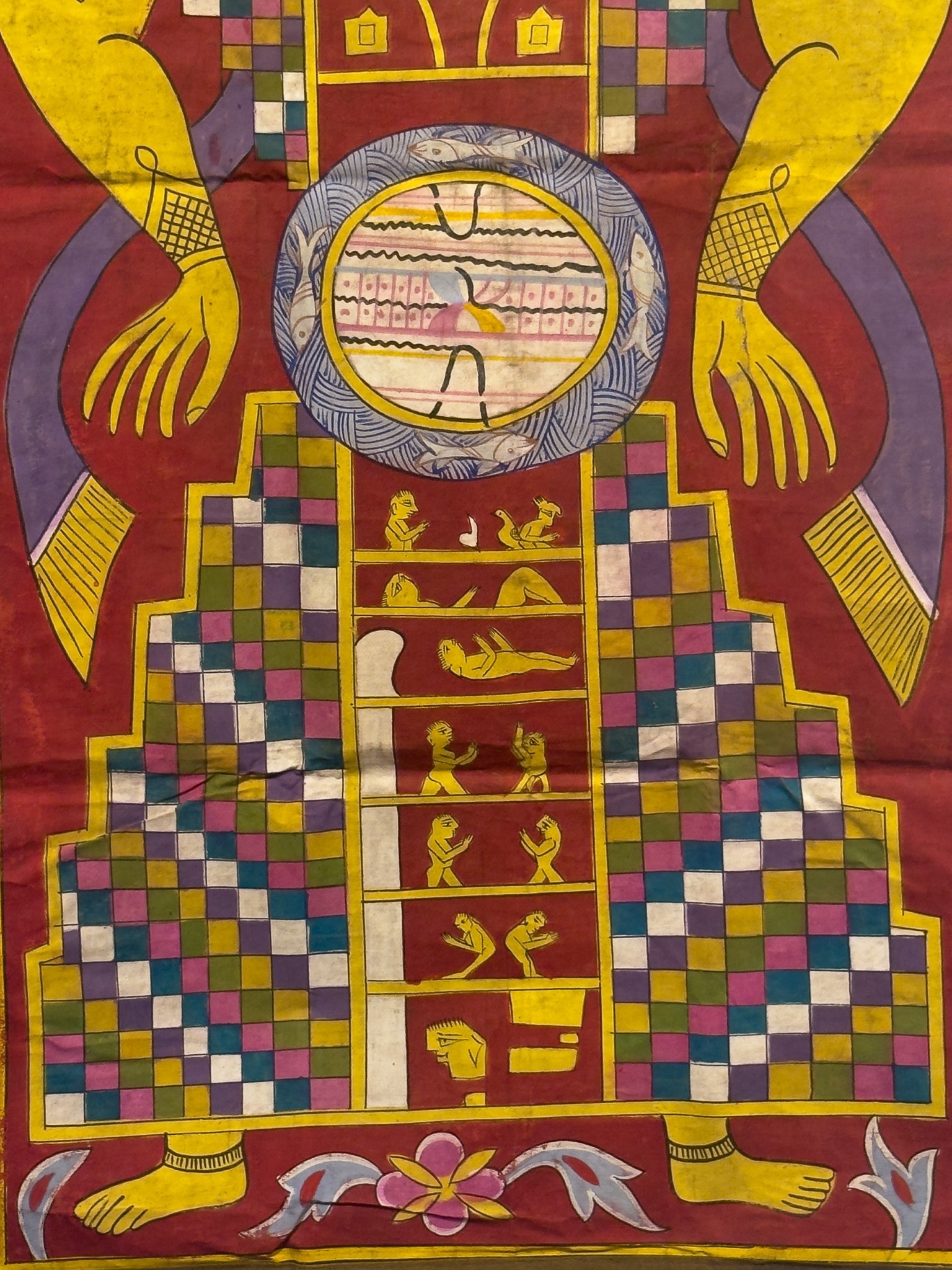 A Jain Cosmic Diagram (Lokapurusha), 19th Century - A vertically oriented painting depicting a Jain cosmic diagram, known as Lokapurusha. The highly stylized anthropomorphic figure is rendered in a folk art style, characteristic of South Asian tradition. The central figure, predominantly yellow, features a crescent moon on its forehead, prominent earrings, necklace, and armbands. Its body is distinctly compartmentalized, showcasing small, illustrative scenes within a central vertical column, and a prominent circular motif at the abdomen which features elements resembling Indic script. The lower body is rendered as a checkered skirt-like structure, all set against a rich red background adorned with simplified floral motifs and framed by a dark brown border.
