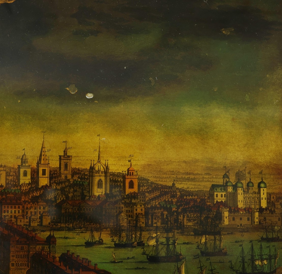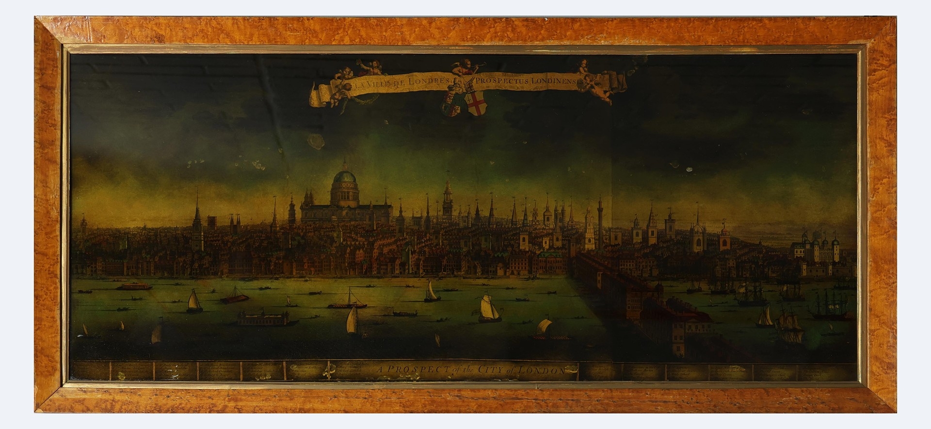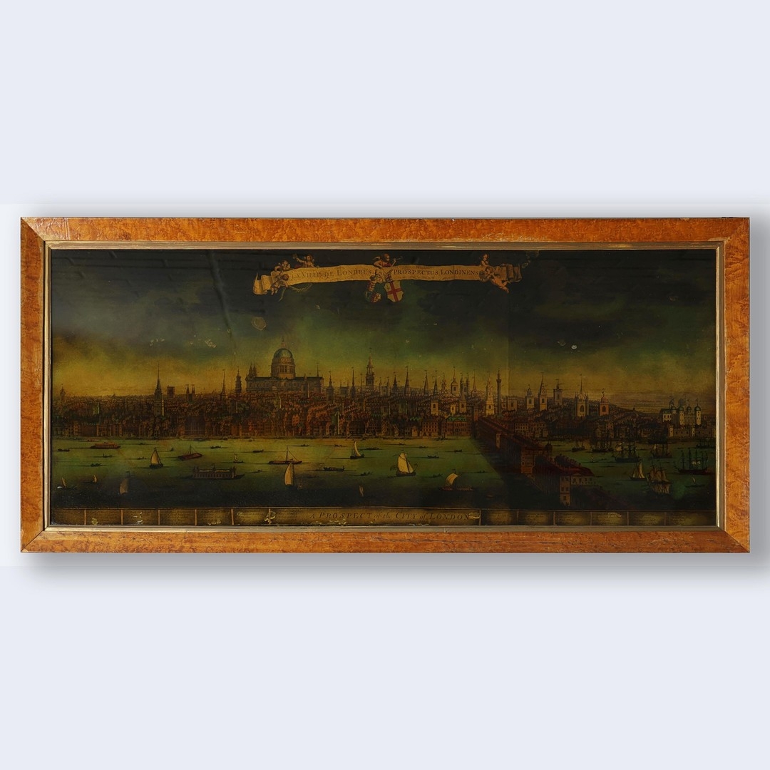 A PROSPECT OF THE CITY OF LONDON. a 19th century Crystoleum depicting 18th century London overlooking the River Thames, titled to top edge in Latin and titled to bottom edge in English, the bottom edge bearing names of landmarks number referenced in the picture, birds-eye maple veneered frame, 58cm high, 126cm long.