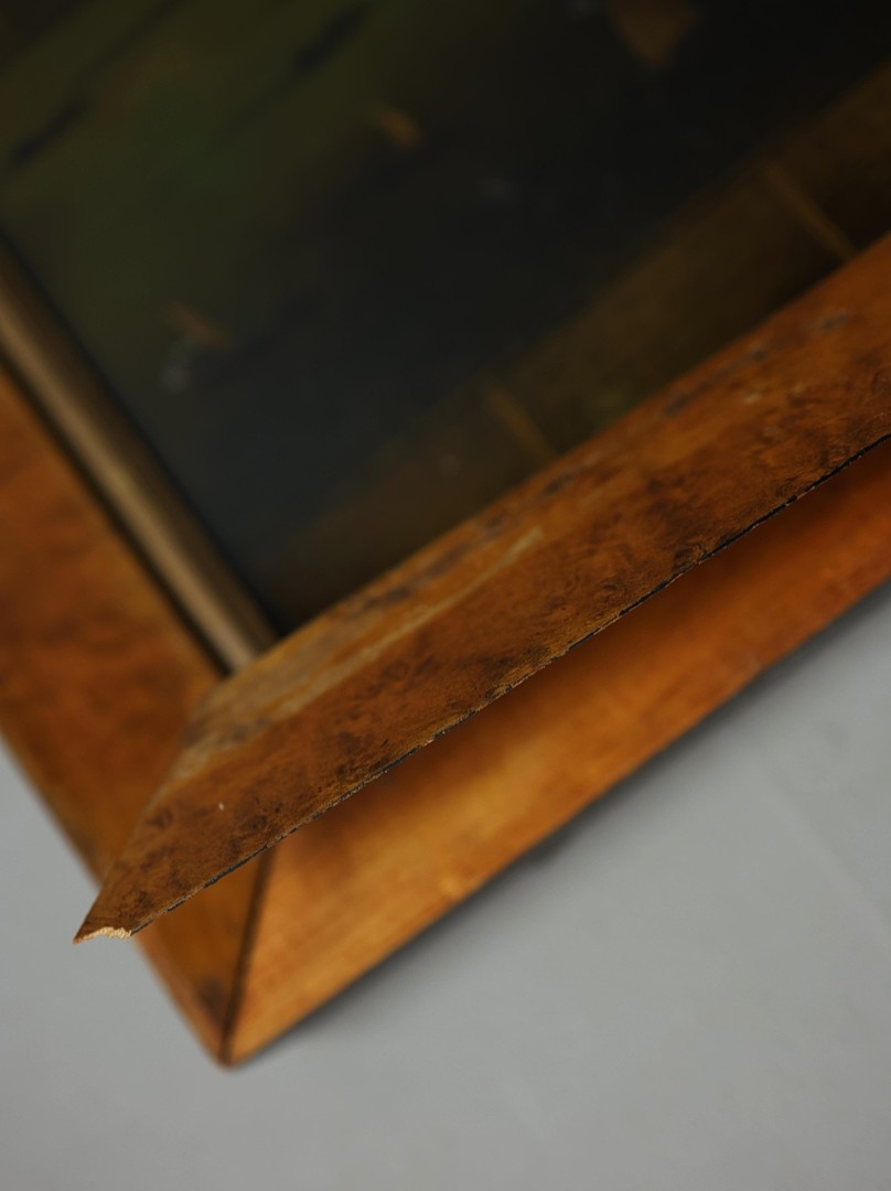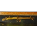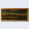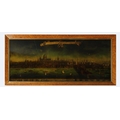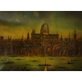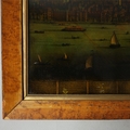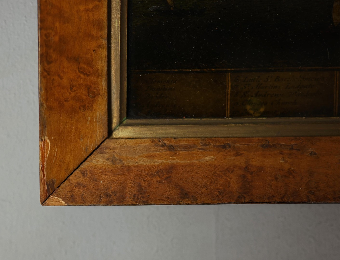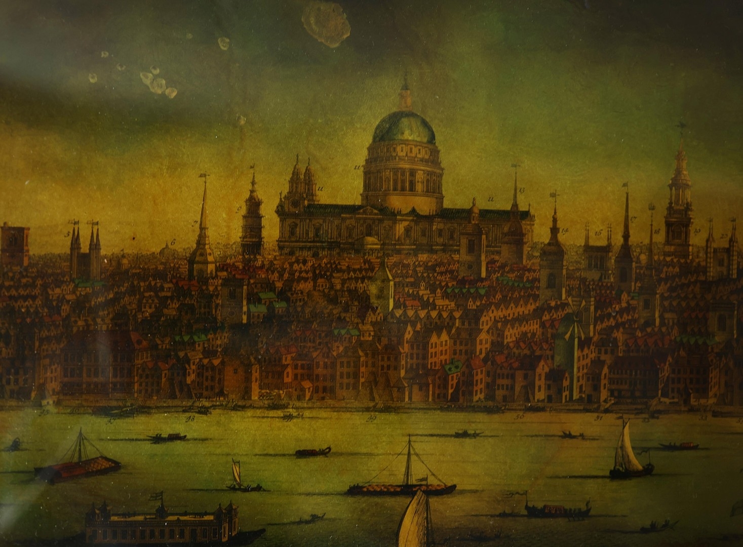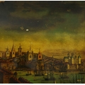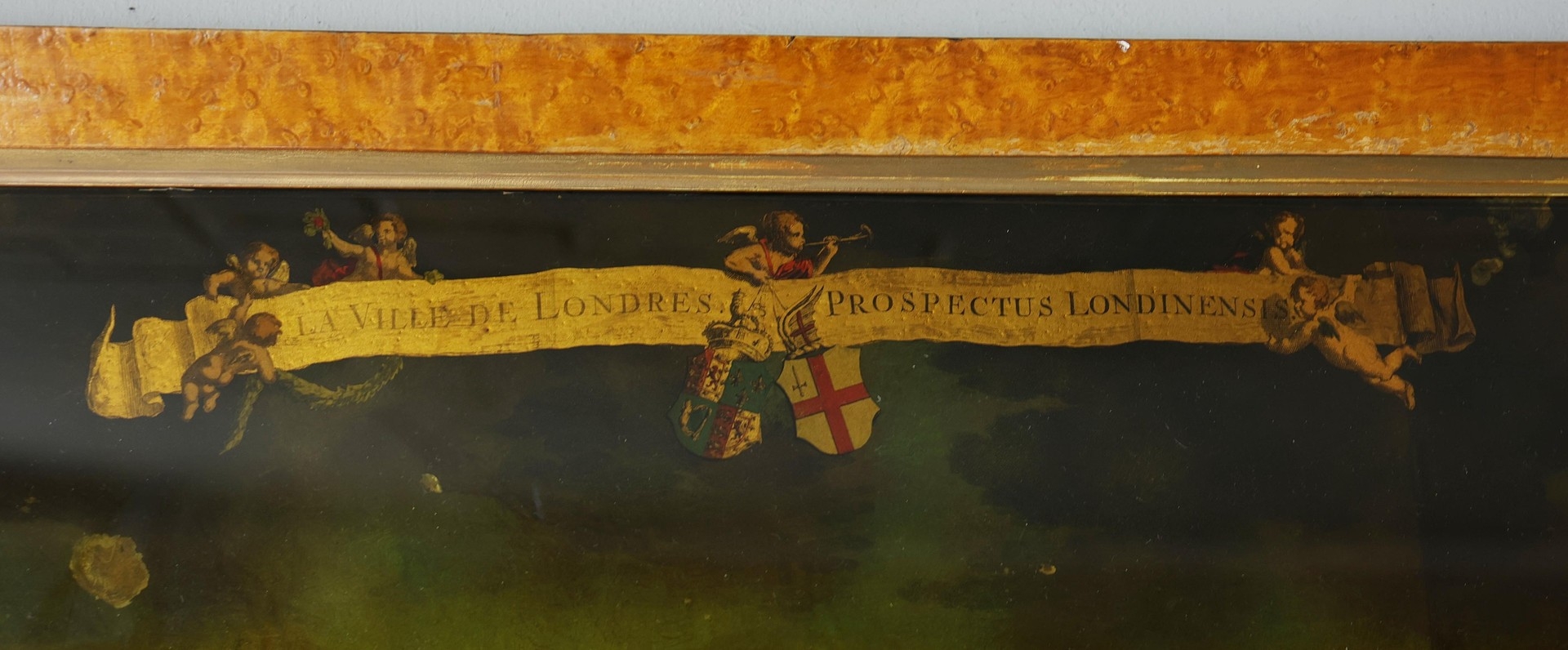 A PROSPECT OF THE CITY OF LONDON. a 19th century Crystoleum depicting 18th century London overlooking the River Thames, titled to top edge in Latin and titled to bottom edge in English, the bottom edge bearing names of landmarks number referenced in the picture, birds-eye maple veneered frame, 58cm high, 126cm long.