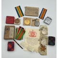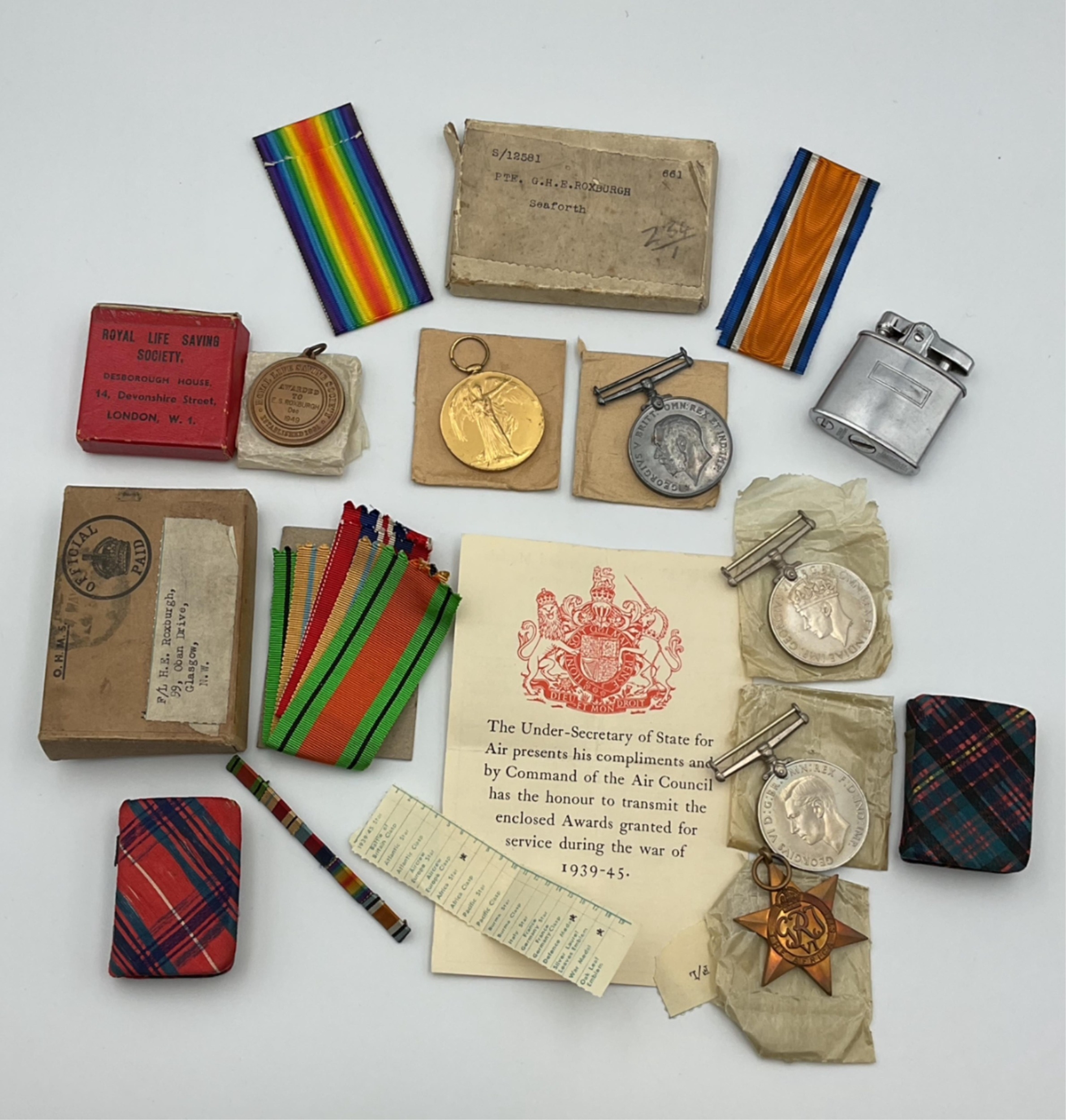 Same participant medal group - to include a pair of WWI medals awarded to S / 12581 Pte. G. H. E. ROXBURGH SEAFORTH, not worn, original packaging, together with a WWII trio awarded to the same, boxed with original packing; Royal Life Saving Society medal awarded 1949, boxed; two tartan cloth miniature books and a lighter.