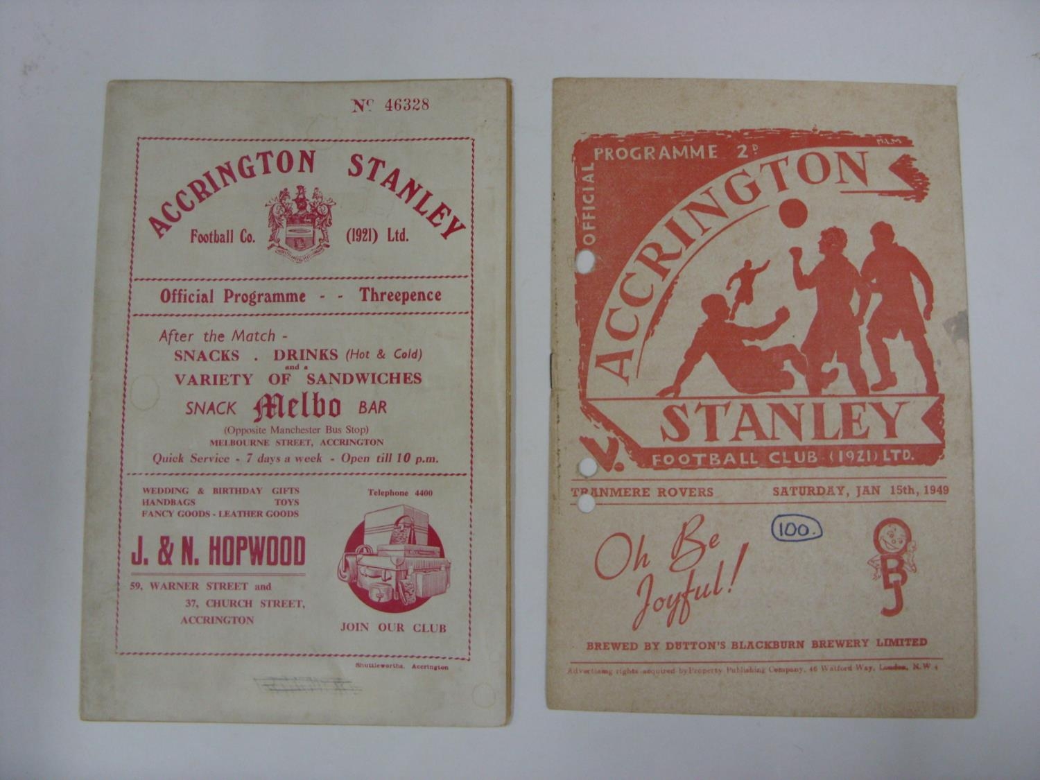 ACCRINGTON STANLEY, 1949-1955, two football programmes for games versus Tranmere Rovers, played 15/01/1949 (punched holes, writing to front, foxing) & 26/03/1955 (staple removed with slight damage where staple was, marking to front cover). Estimate: £10/£12 - Opening Bid: £8