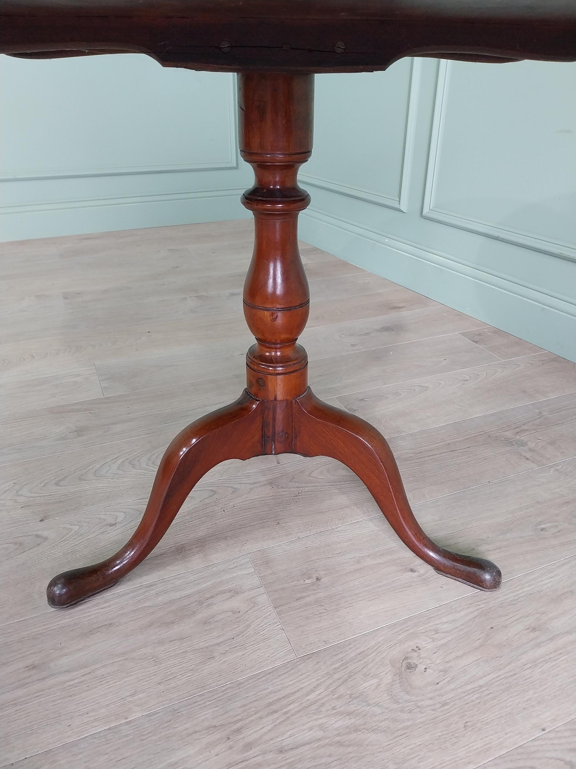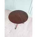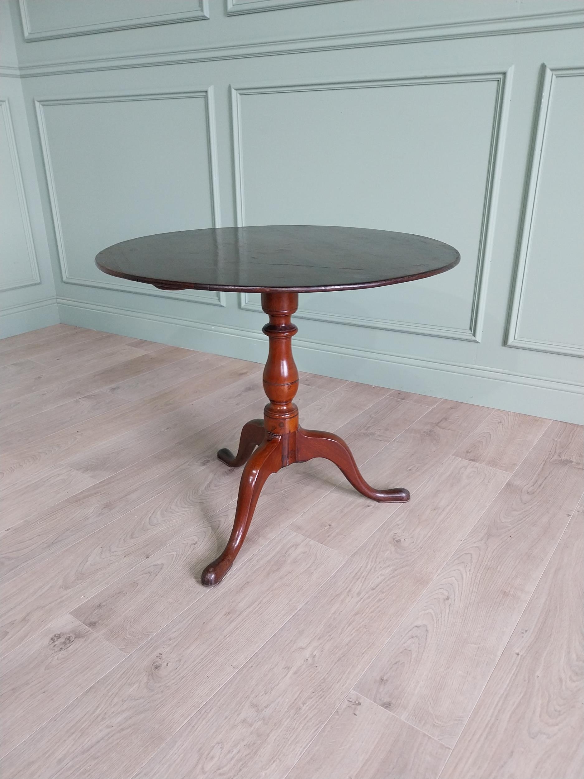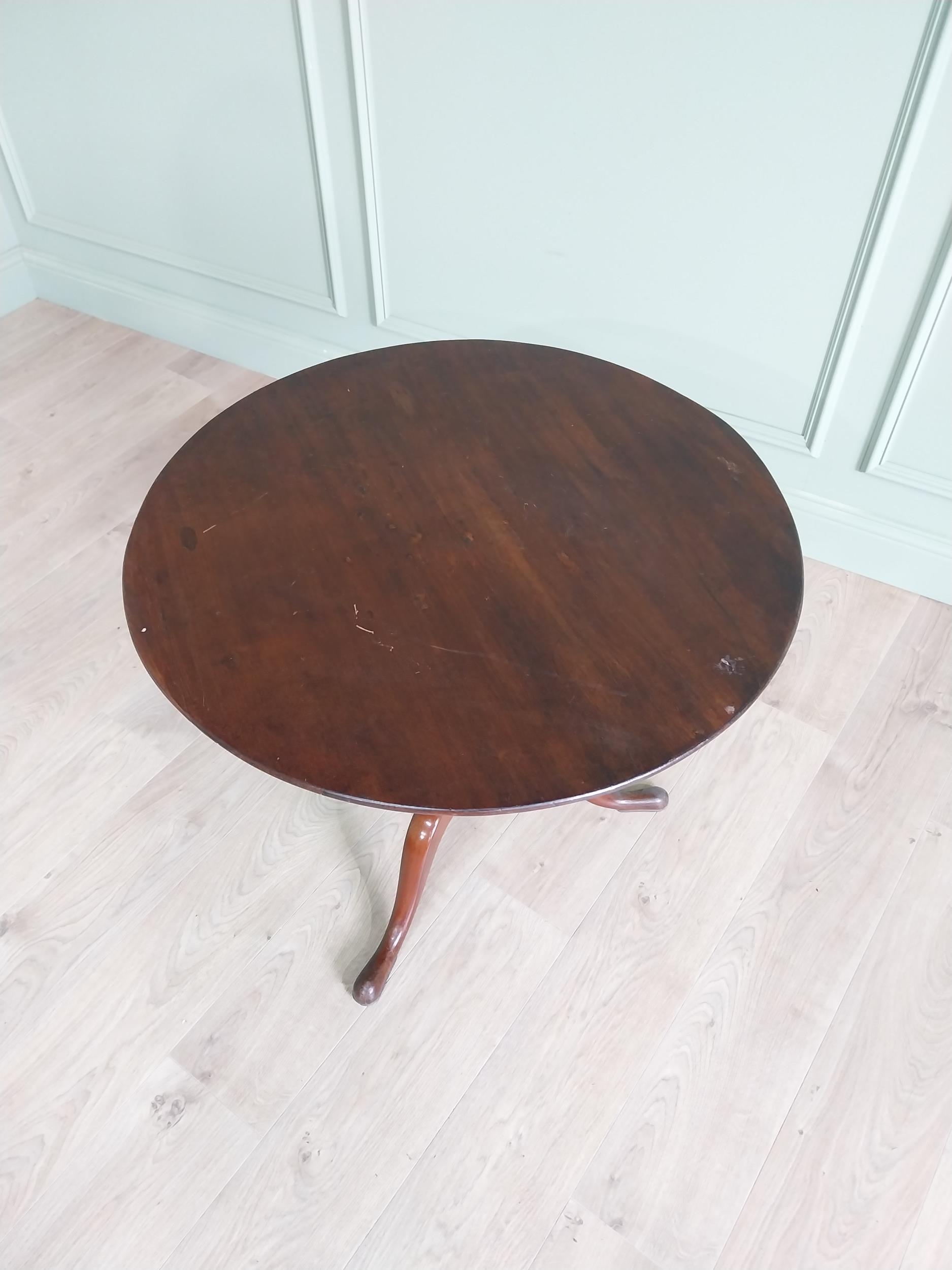 Irish Georgian mahogany tilt top centre table raised on turned column and three outswept feet {68 cm H x 77 cm Dia.}.