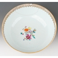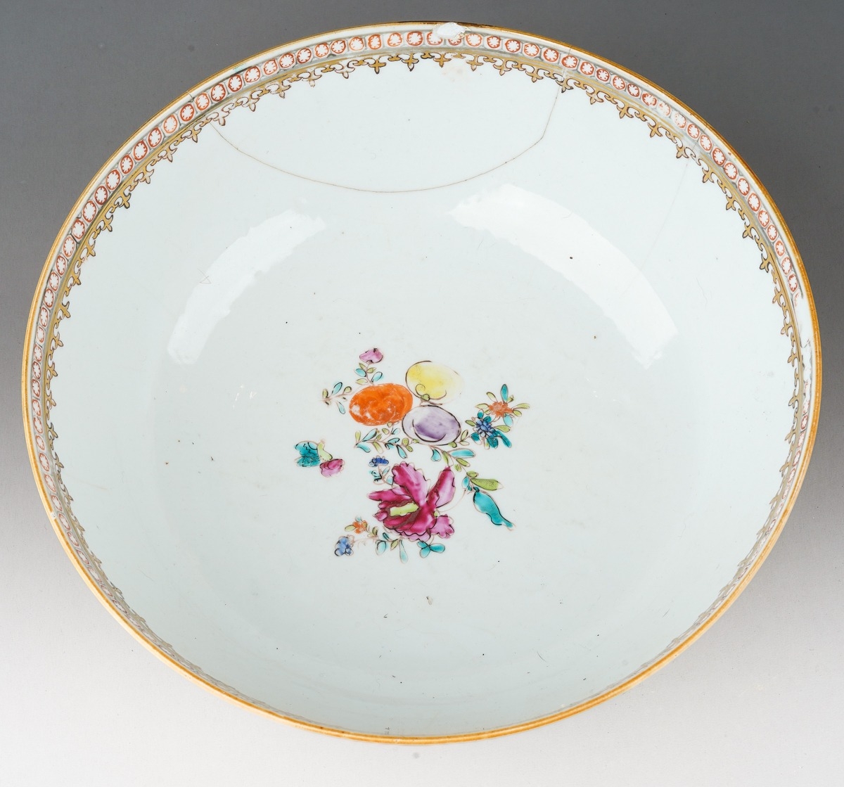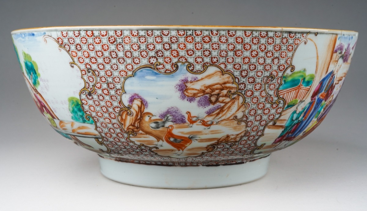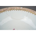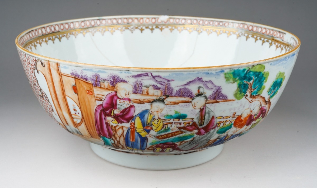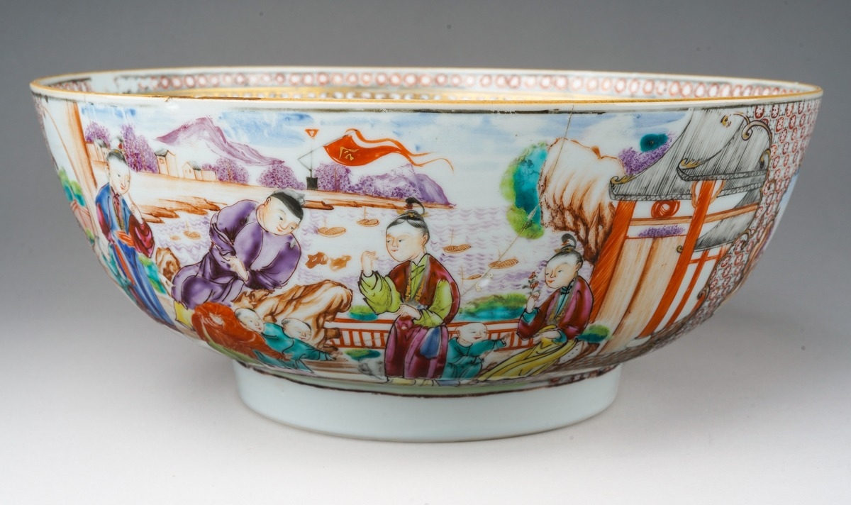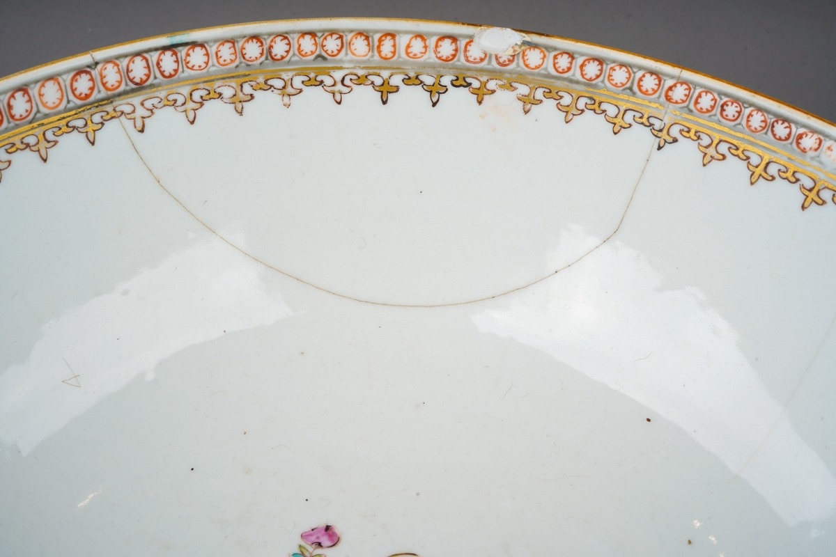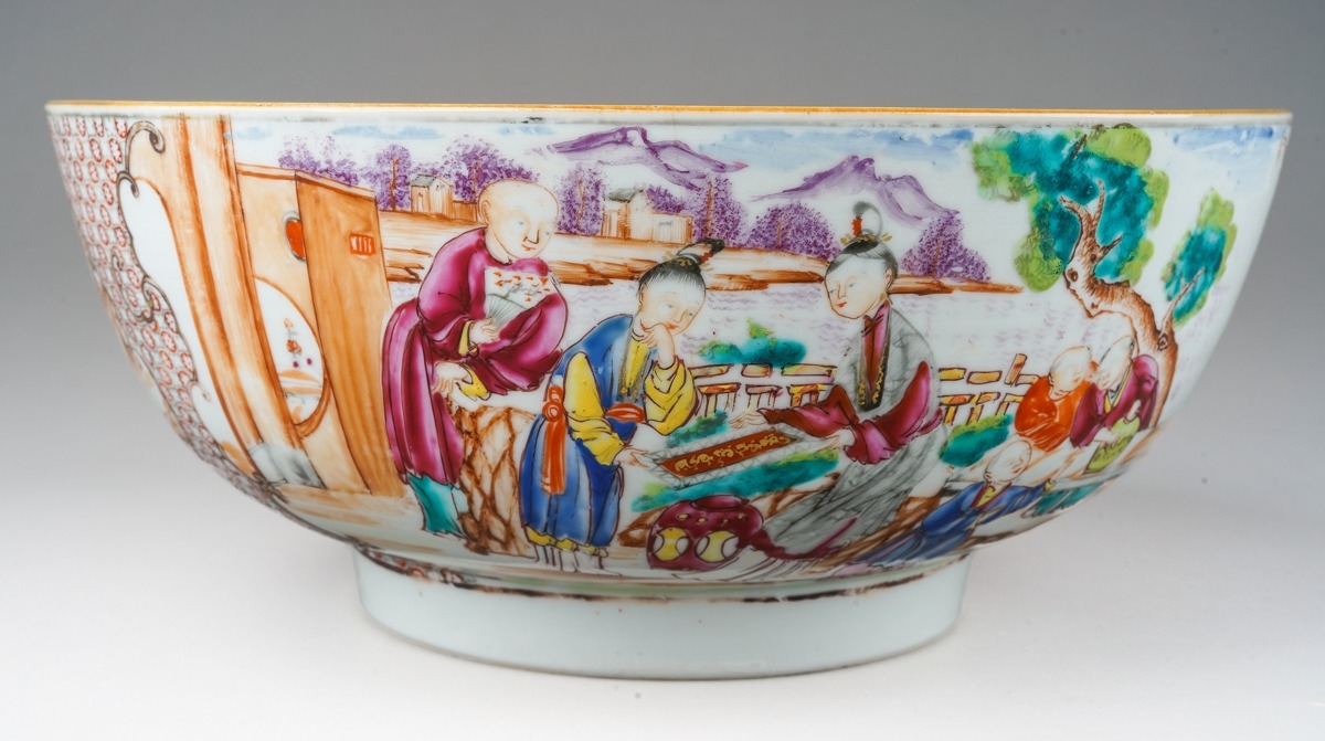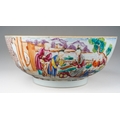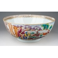 A late 18th / early 19th century Chinese export porcelain Famille Rose bowl, decorated with vignettes of figures and birds surrounded by geometric designs, on a short foot, unmarked, bears paper label for T.G. & Co (London) Ltd, a.f., diameter 25.7cm x height 10.8cm