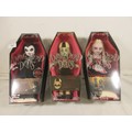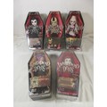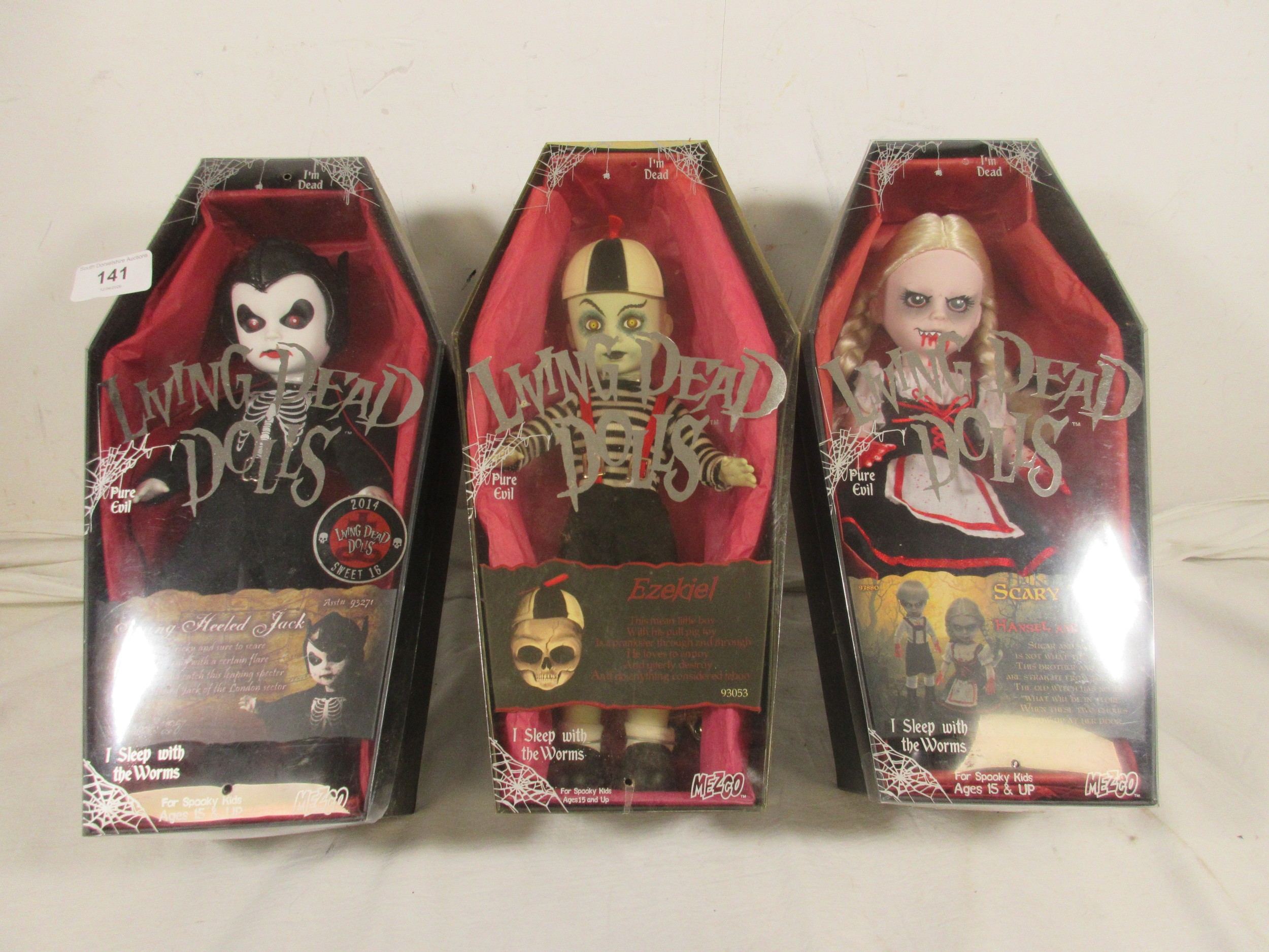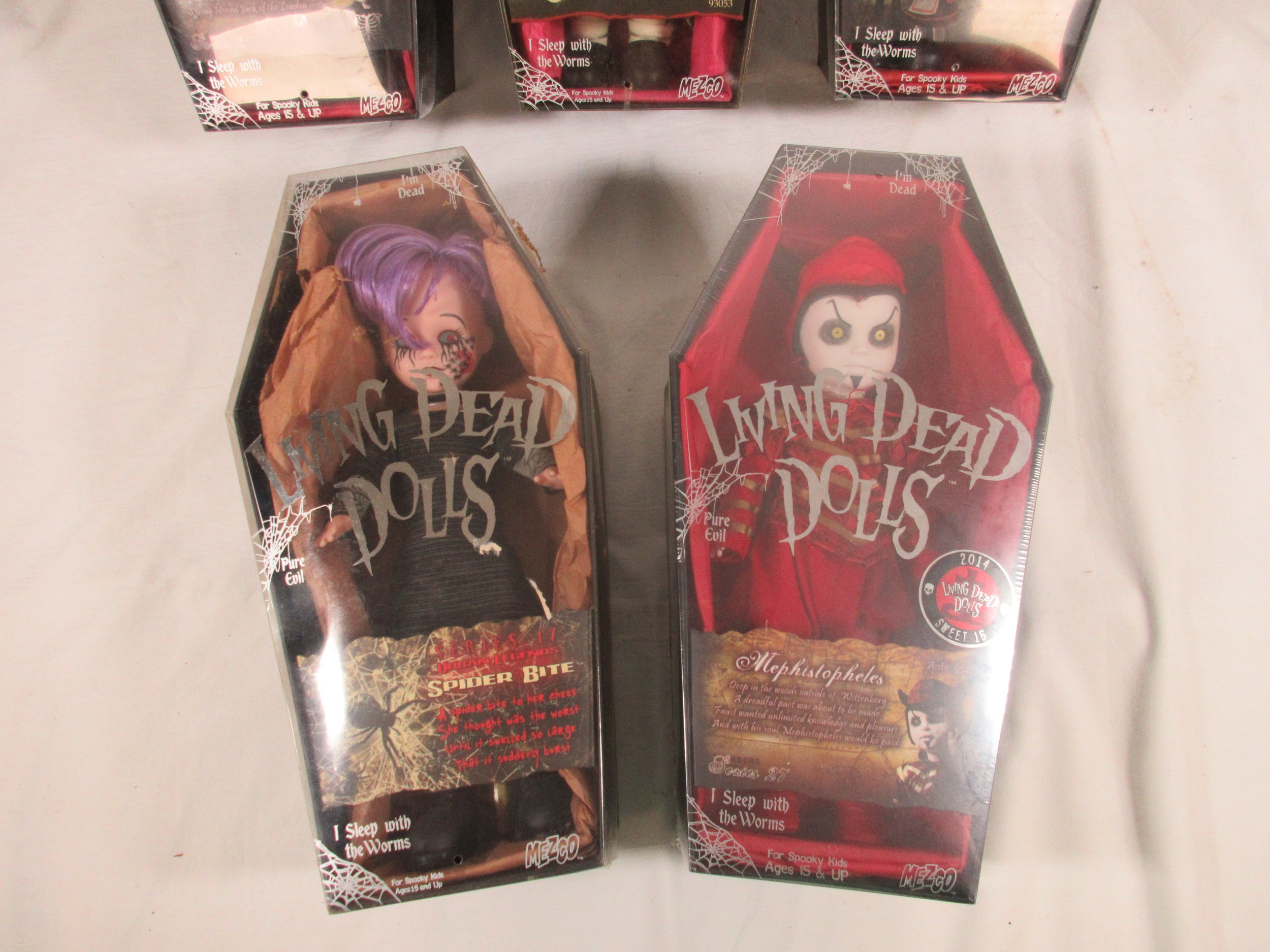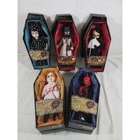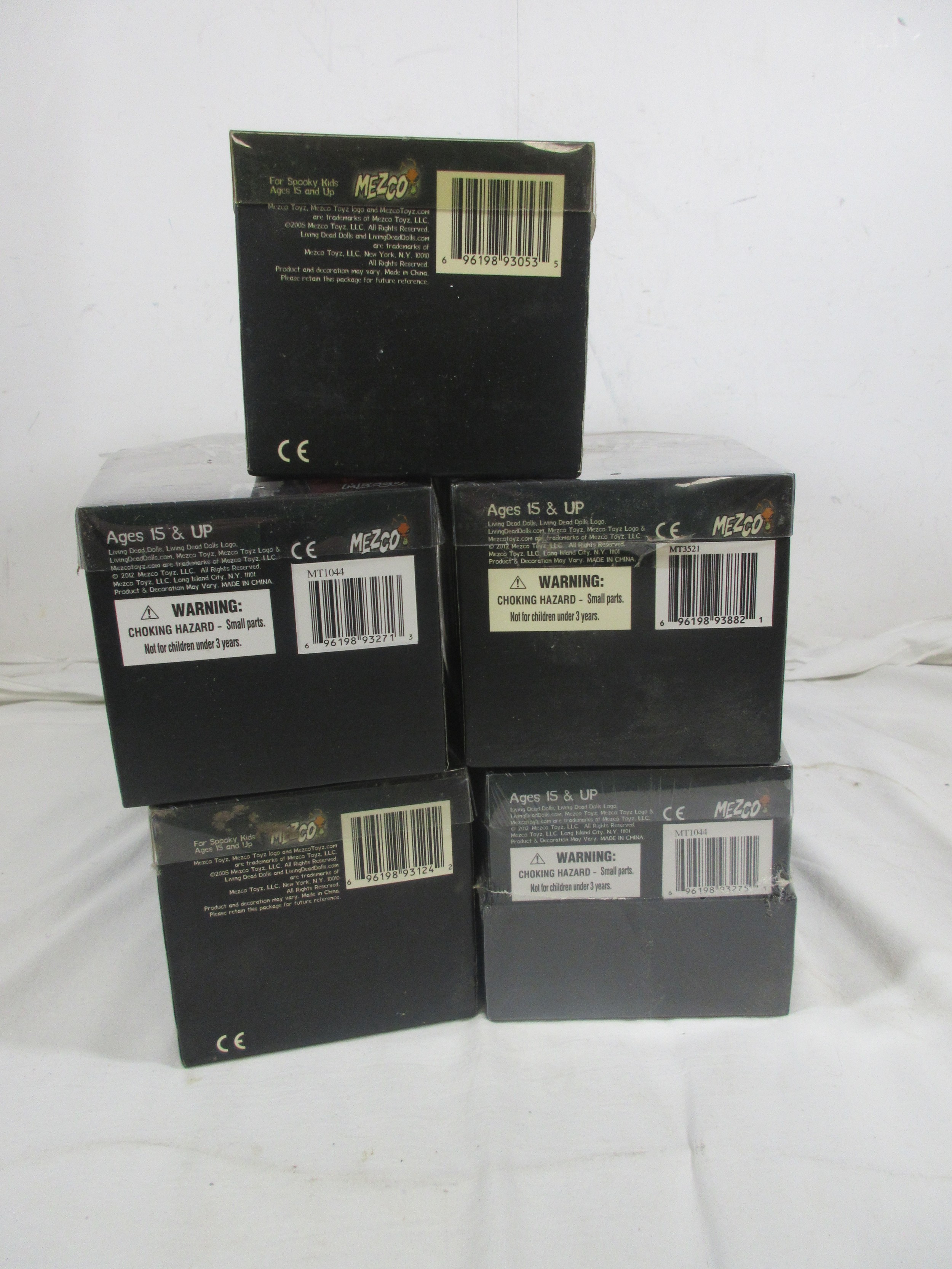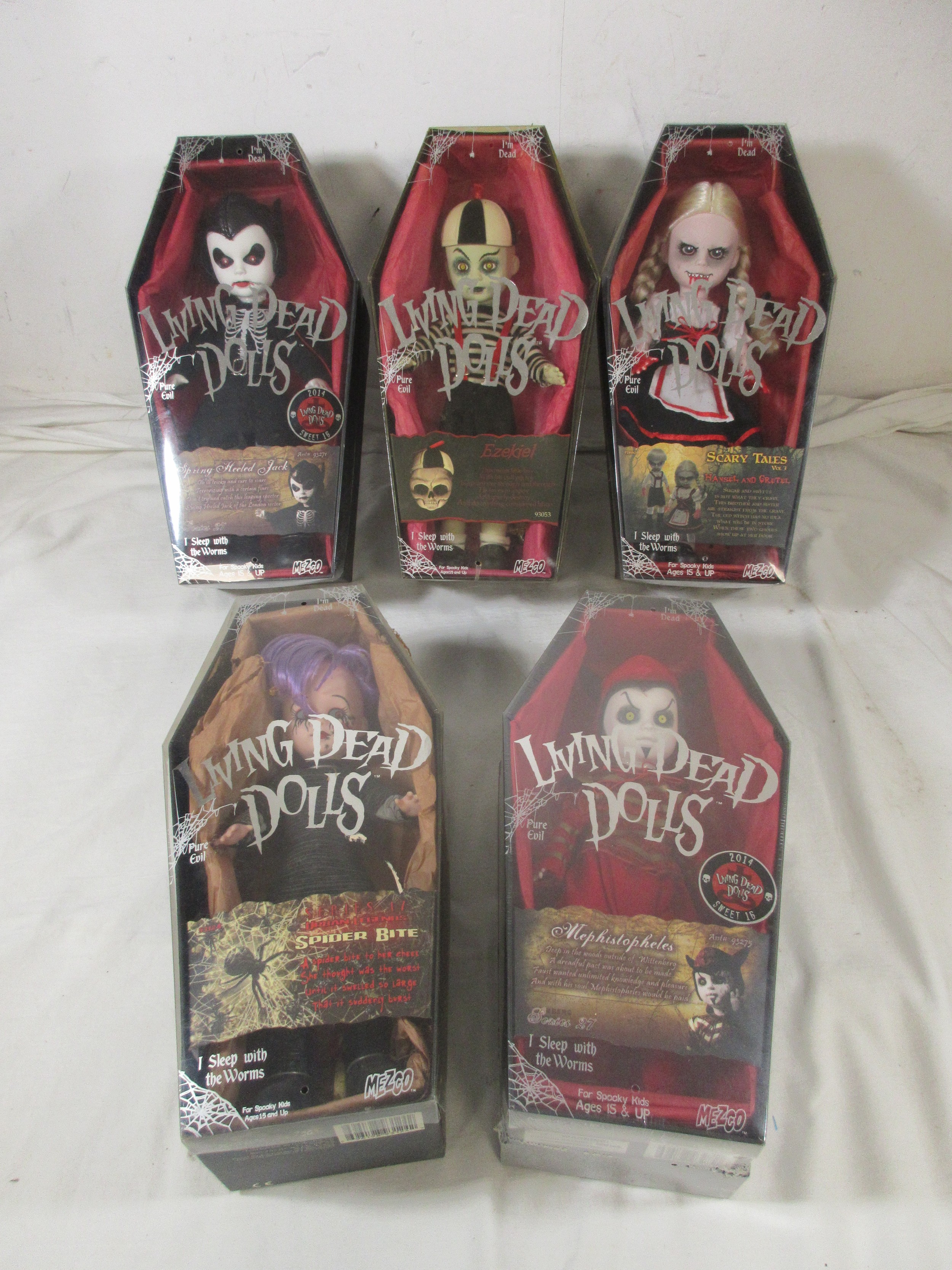 5 Mezco Living Dead Dolls comprising 93882 Scary Tales Vol 3 Gretel, 93275 Mephistopheles (sealed and unopened), 93124 Series 17 Urban Legends Spider Bite, 93053 Ezekiel and 93271 Spring Heeled Jack, all in original boxes, in good apparent condition. Storage wear/dust to boxes.