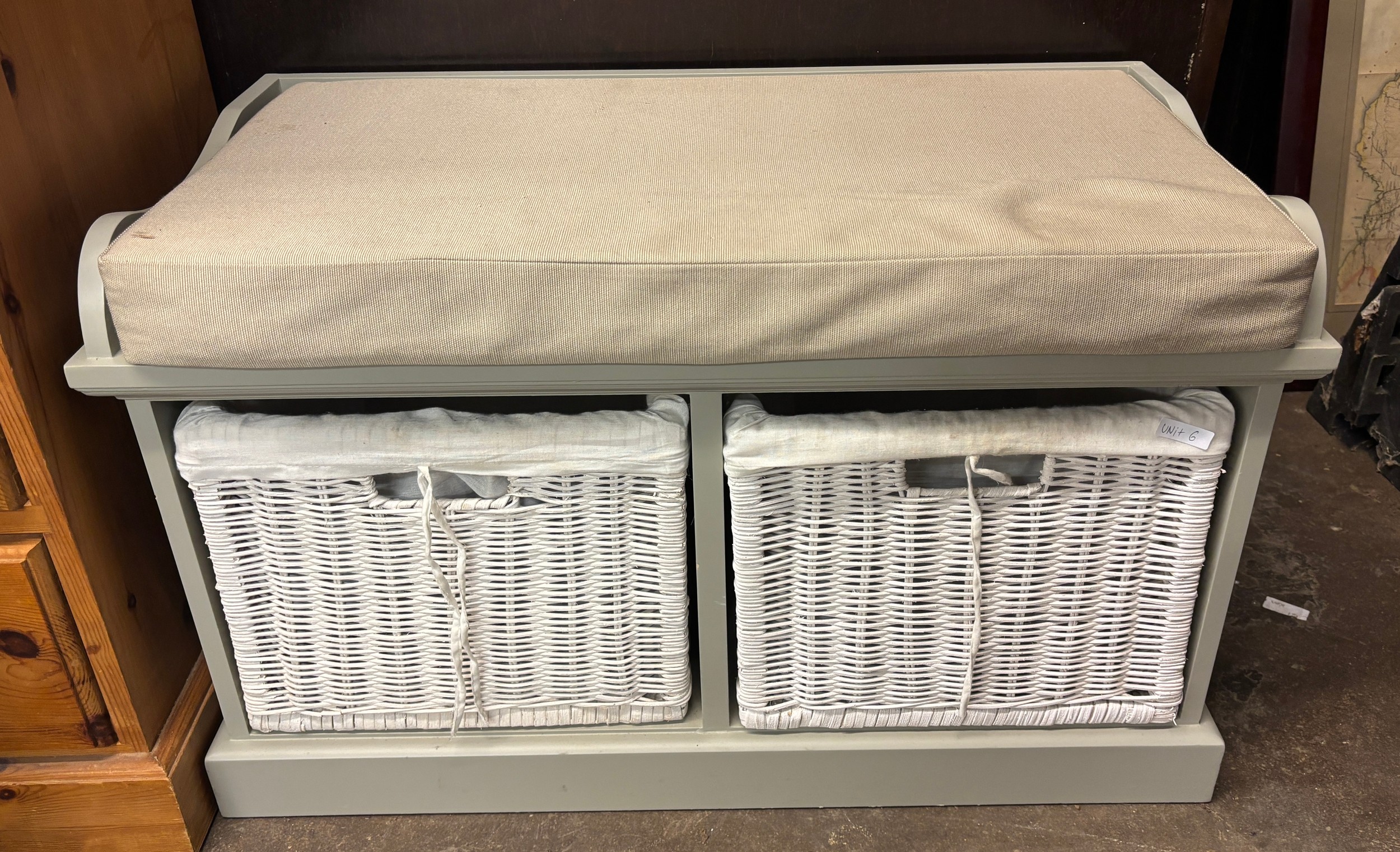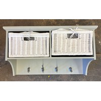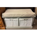 PAINTED HALL BECH SEAT WITH TWO WICKER BASKET STORAGE DRAWERS