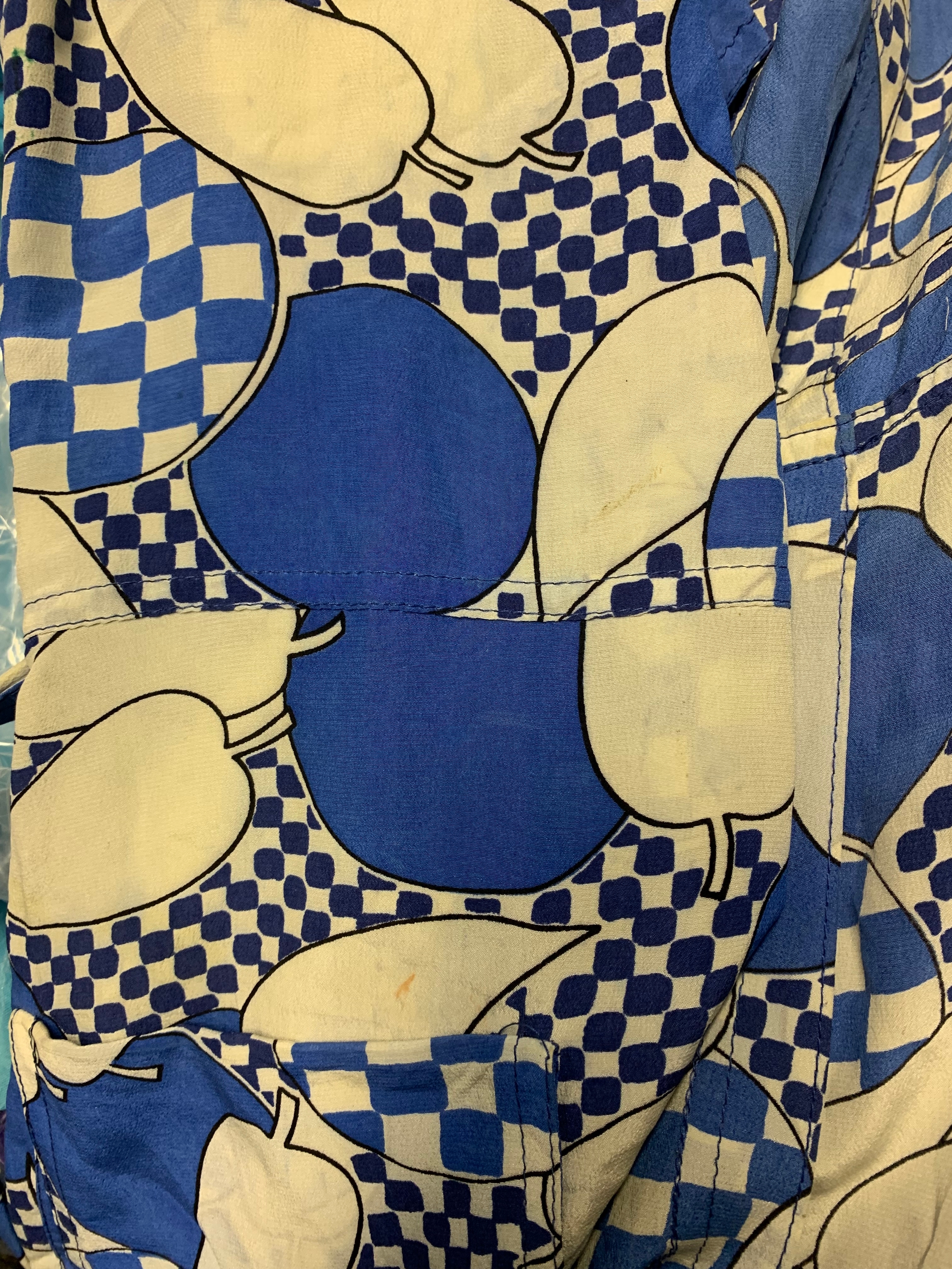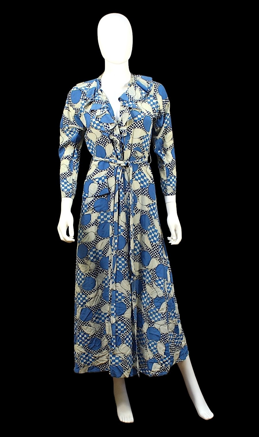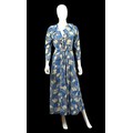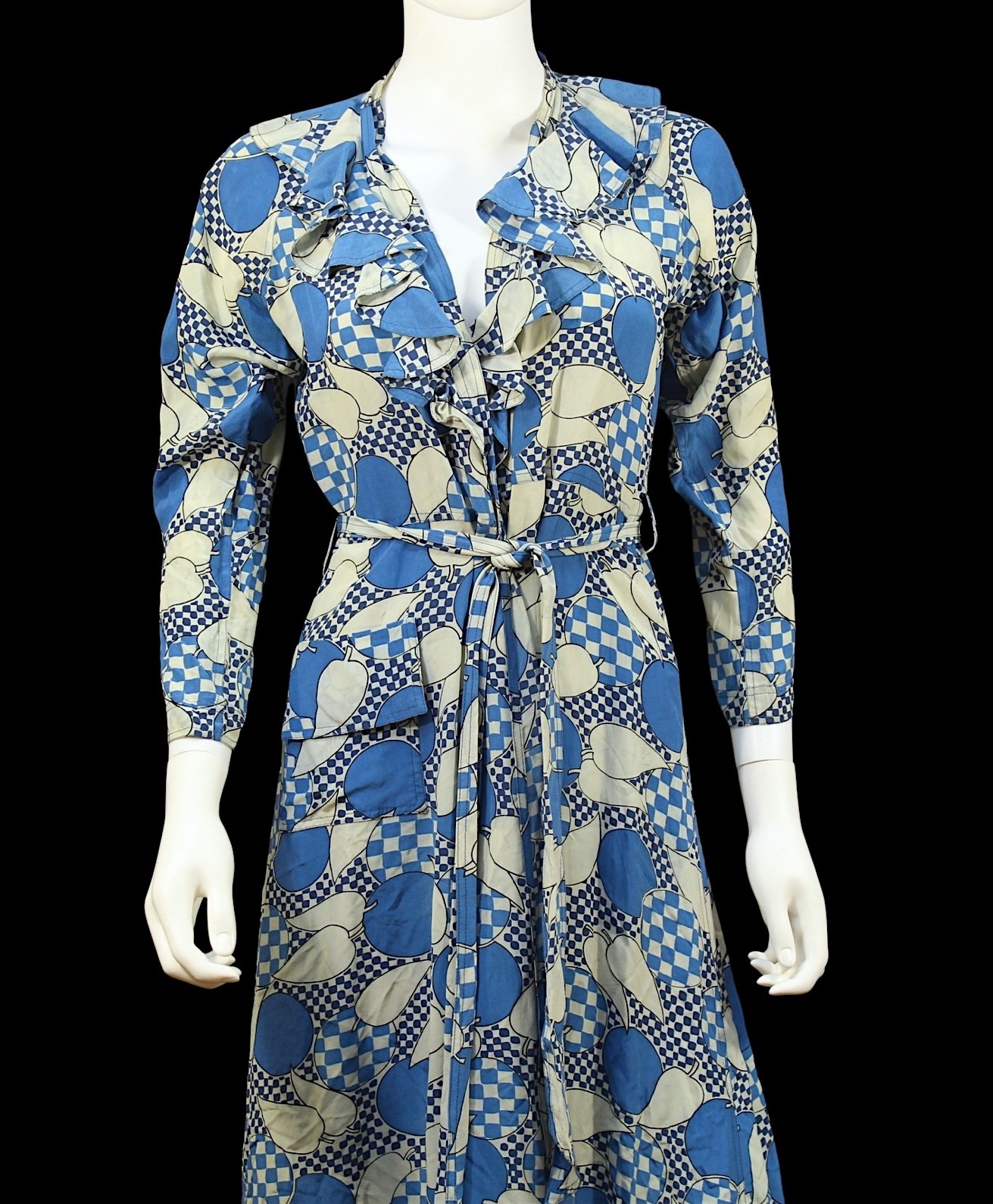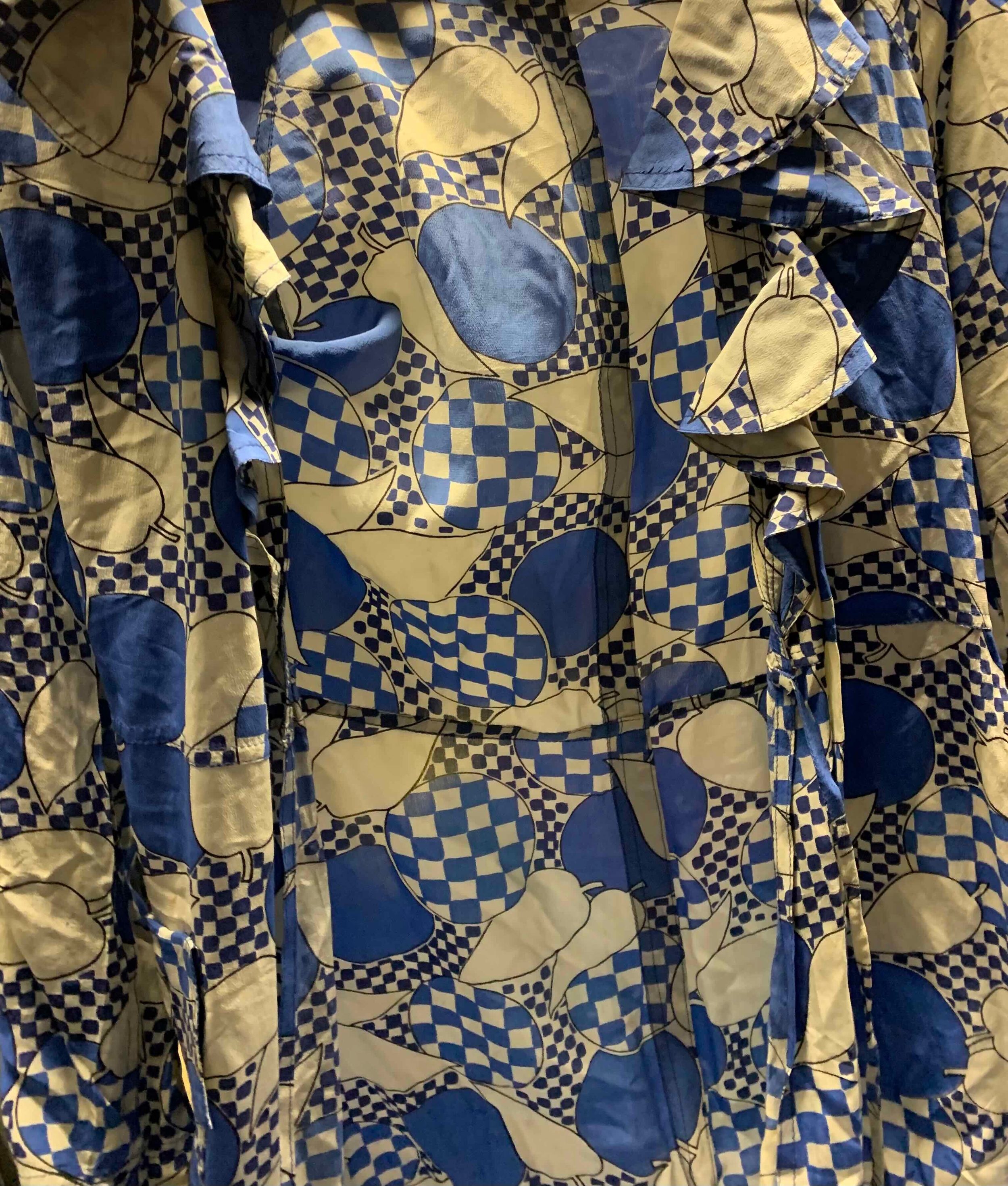 'Apples and Pears' type pattern, the fabric printed with blue and white checkerboard and stylised fruit design, shaped collar, tie fastening to waist, pockets to hips, bearing 'Jean Muir' label to inside collar, and additional cleaning labels, length approx 131cm