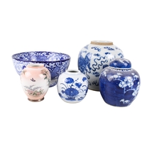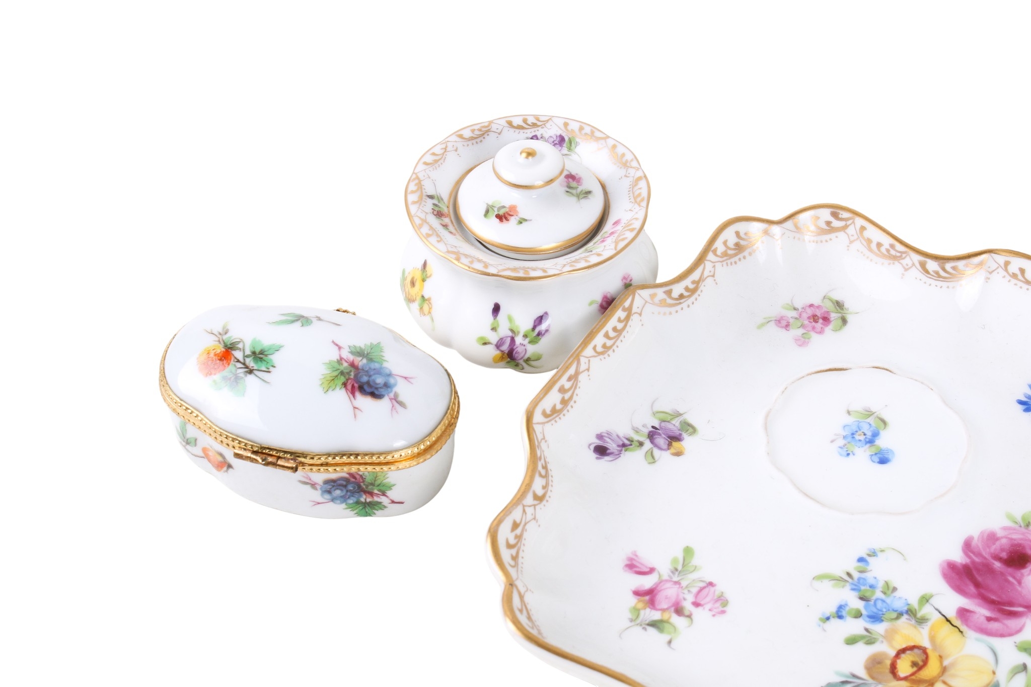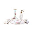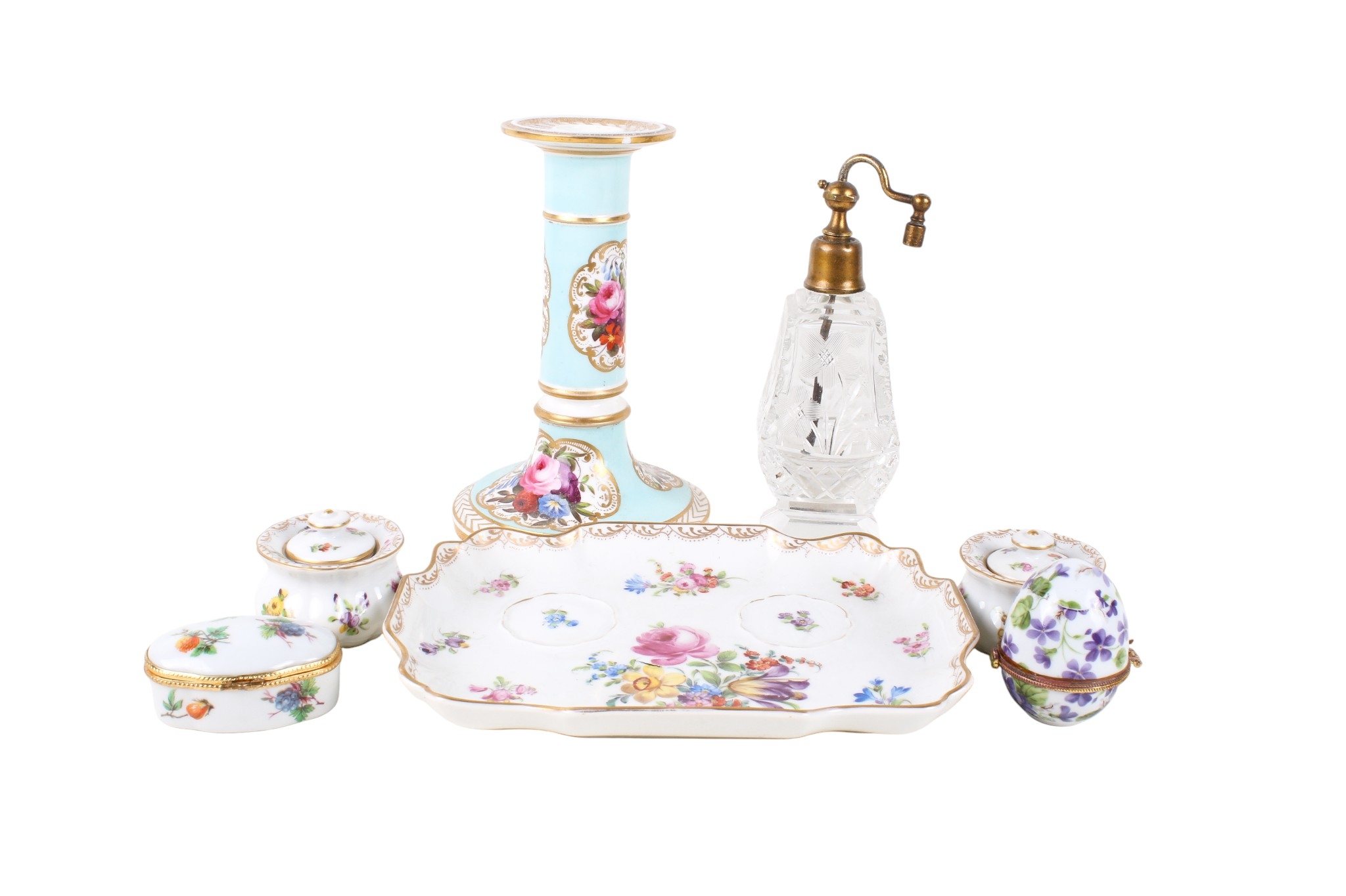 A group of five mostly porcelain items. Including a Dresden three piece porcelain pen and ink stand for Aprey, a candlestick signed 'C. Hayton, 1825', etc. Max. H18cm