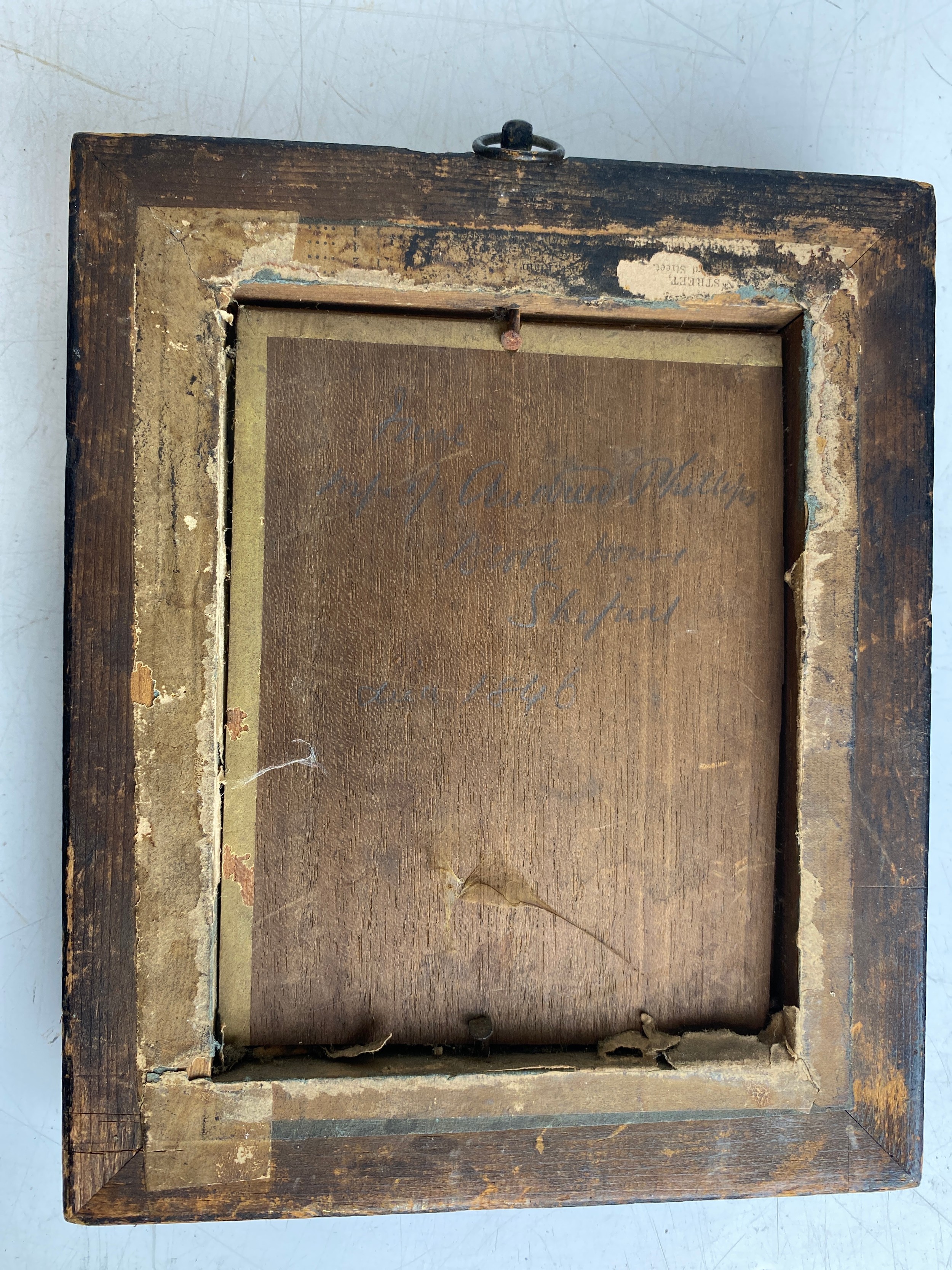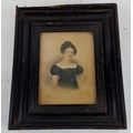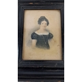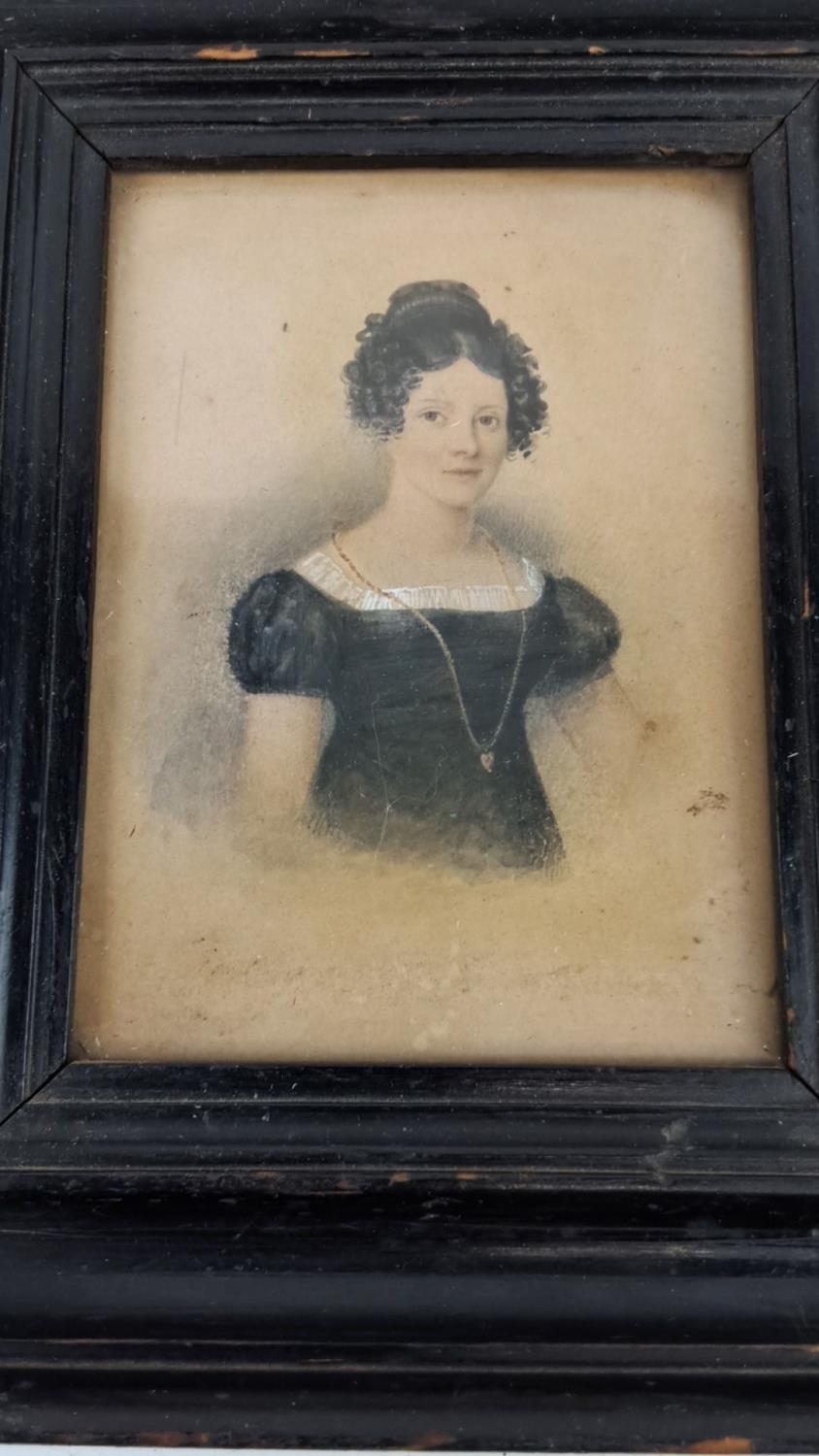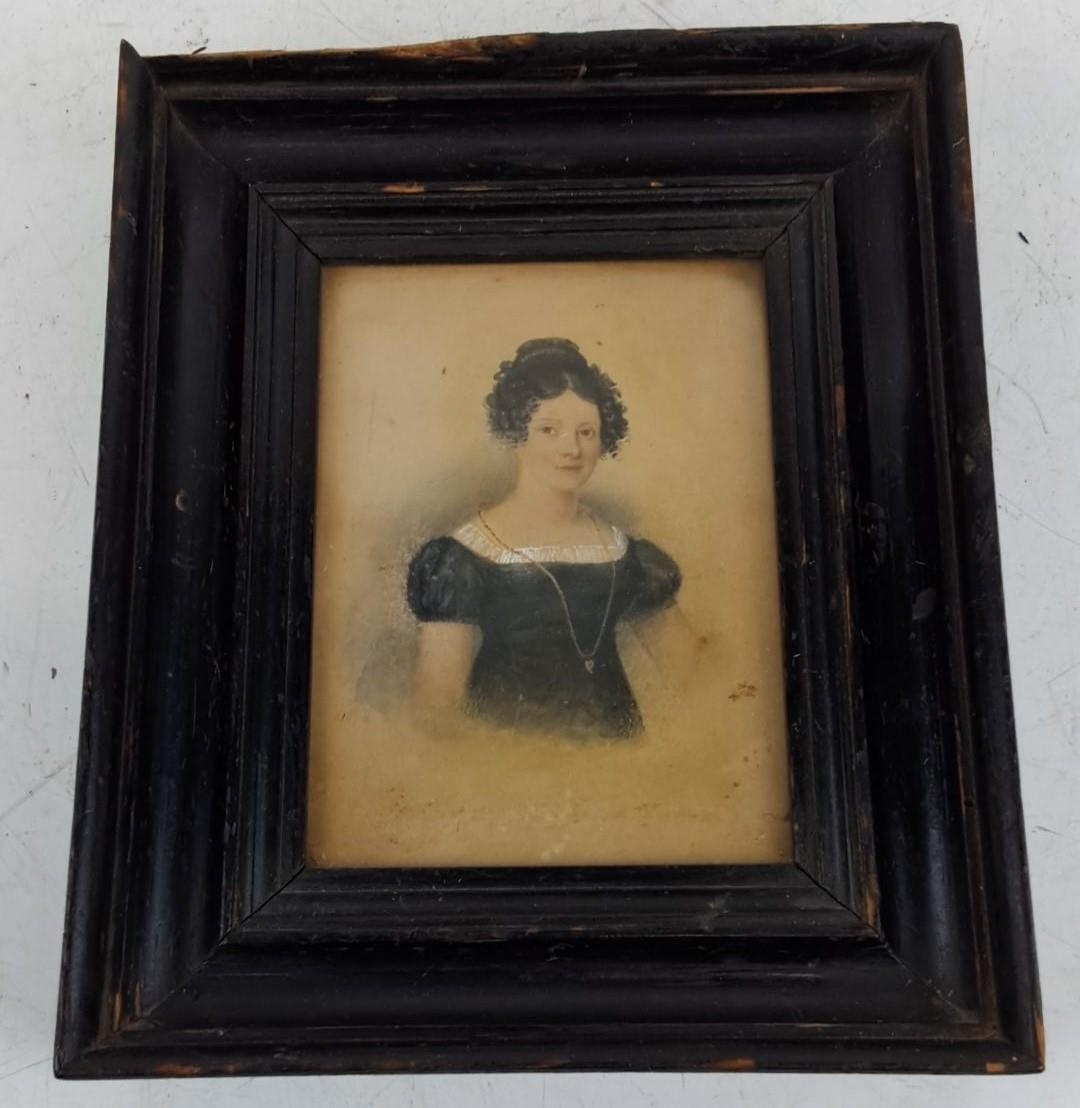 An antique framed watercolour portrait of a woman. The artwork features detailed attire and delicate facial expressions, inscribed on reserve and dated 1846, measuring 17cm x 20cm including frame.