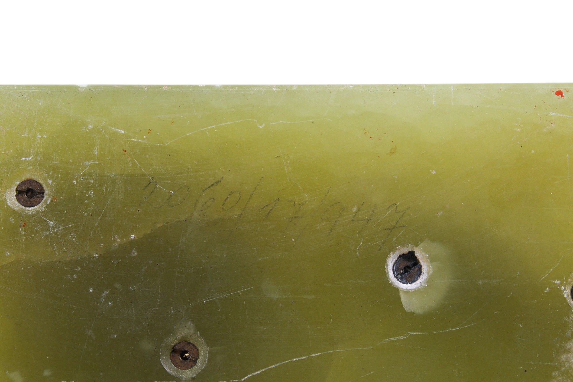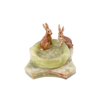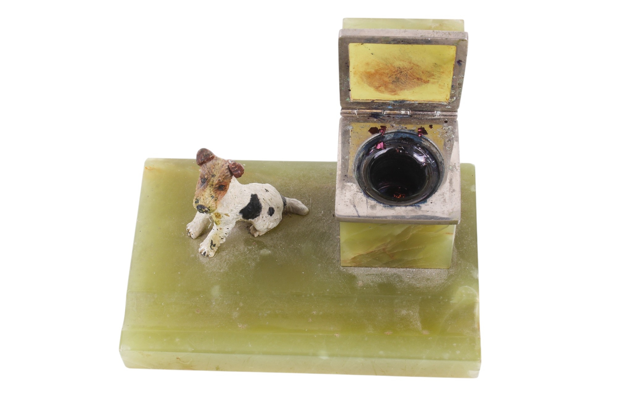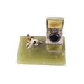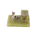 An Art Deco onyx desk stand. Featuring a pen dish, square inkwell with a chrome metal lining and featuring a painted cast metal model of a terrier dog in the style of Bergman, L15cm