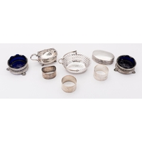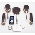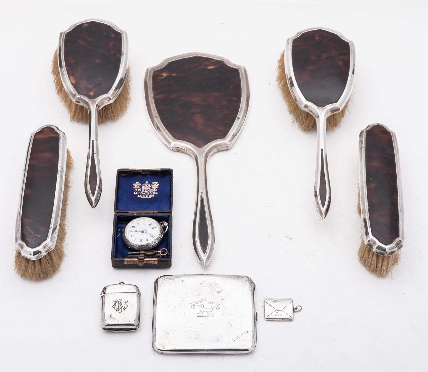 A mixed group of silver including; a five piece silver and tortoiseshell dressing table set comprising two long handled hairbrushes, two clothes brushes and a long handled mirror by Mappin & Webb Ltd, London 1912, with a Birmingham vesta case and a silver open cased pocket watch, (7)
