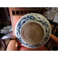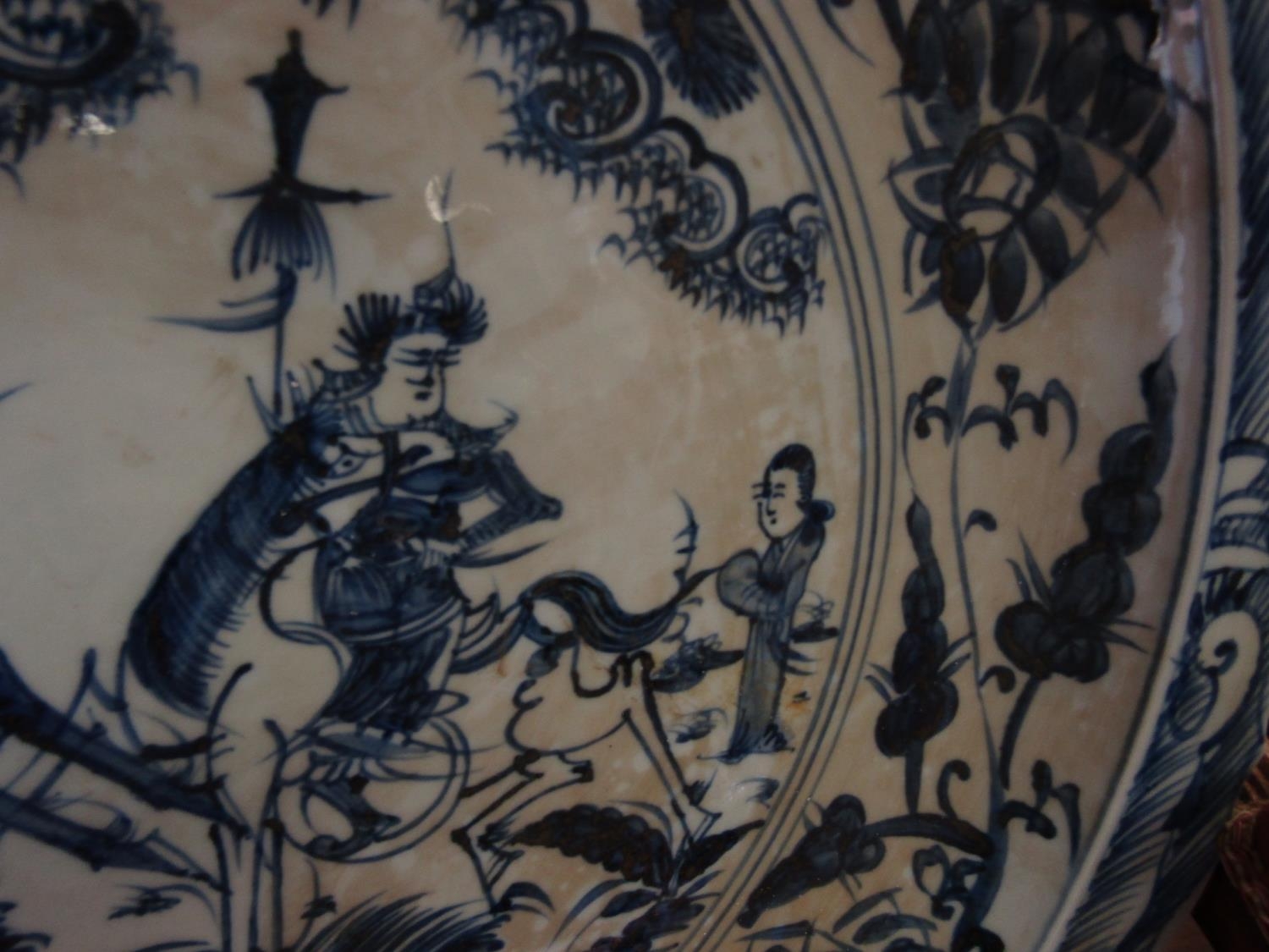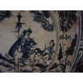 Large Blue and White Porcelain Charger Depicting Warriors with Decorated Surround Approximately 20 Inches Diameter