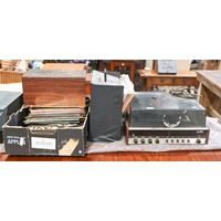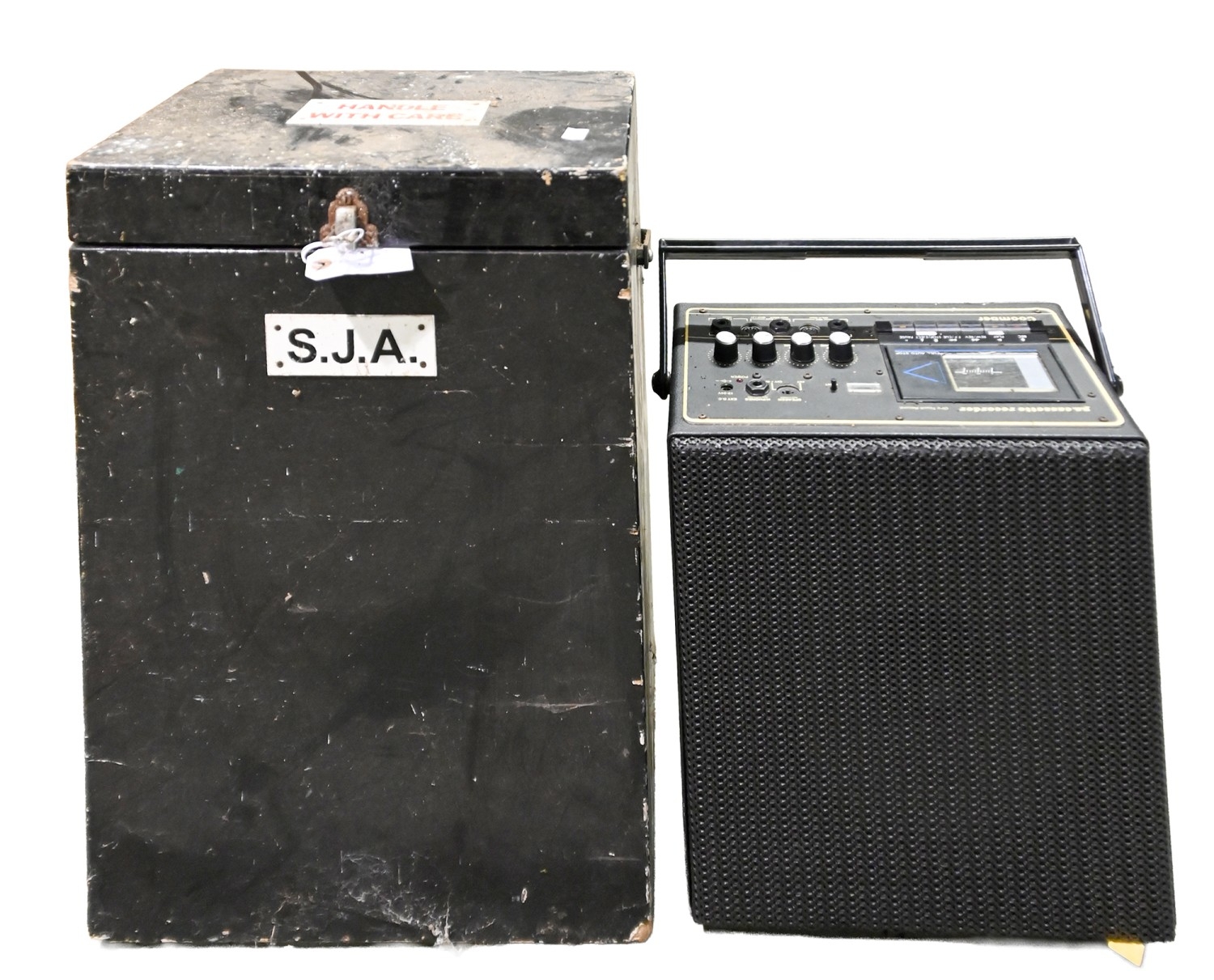 Vintage stereo equipment. A Coomber PA cassette recorder, in timber carry case, 52cm h; 39 x 26cm