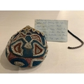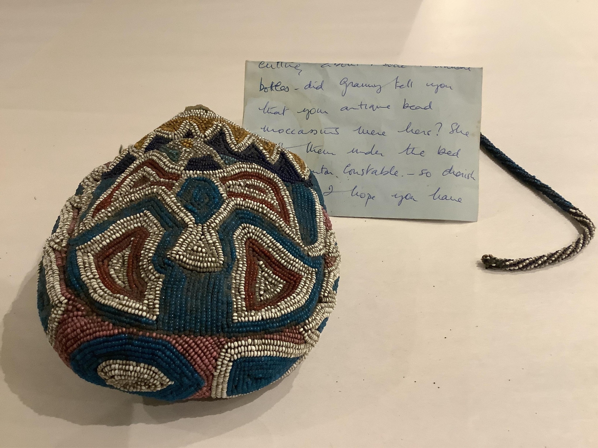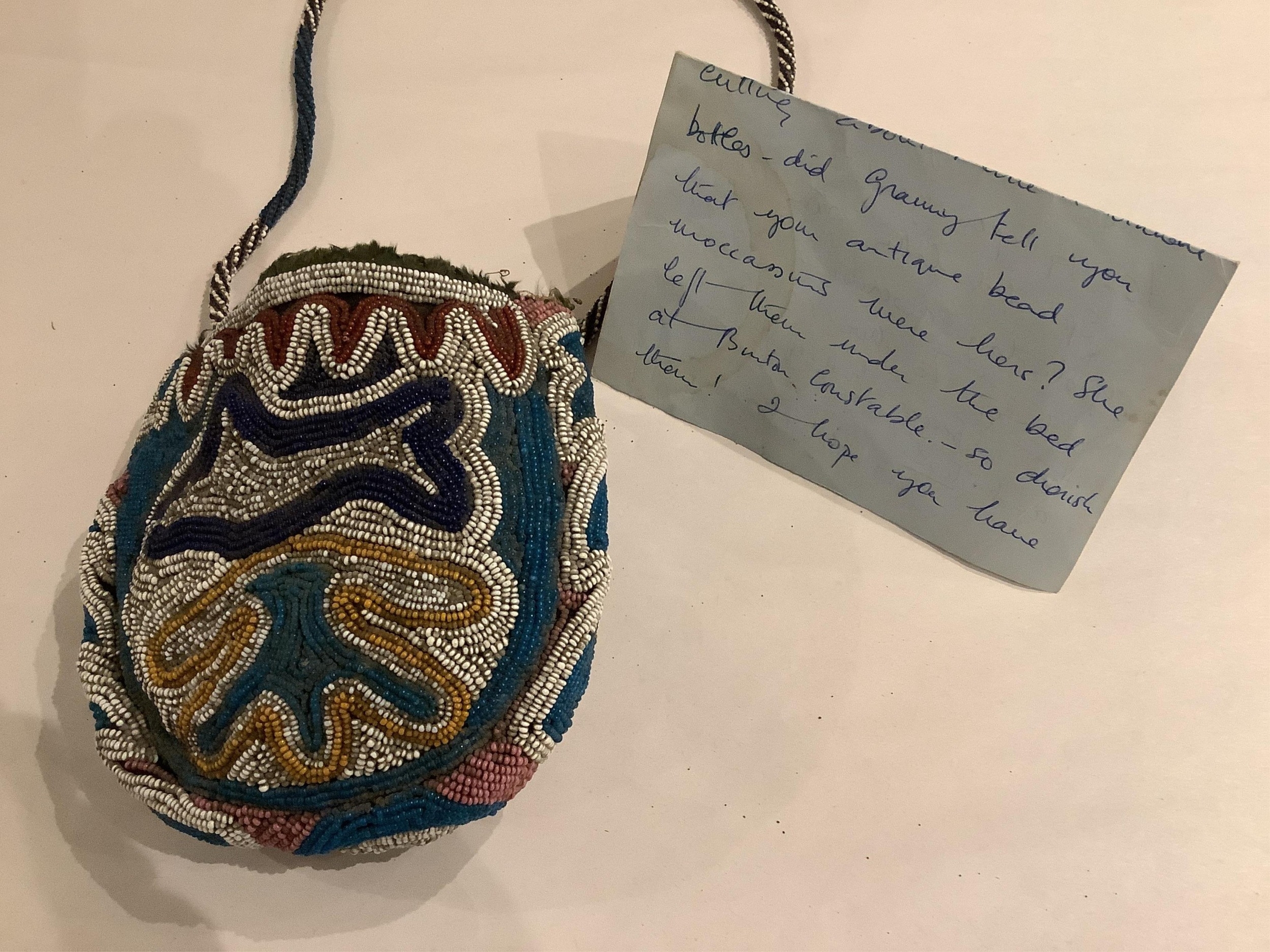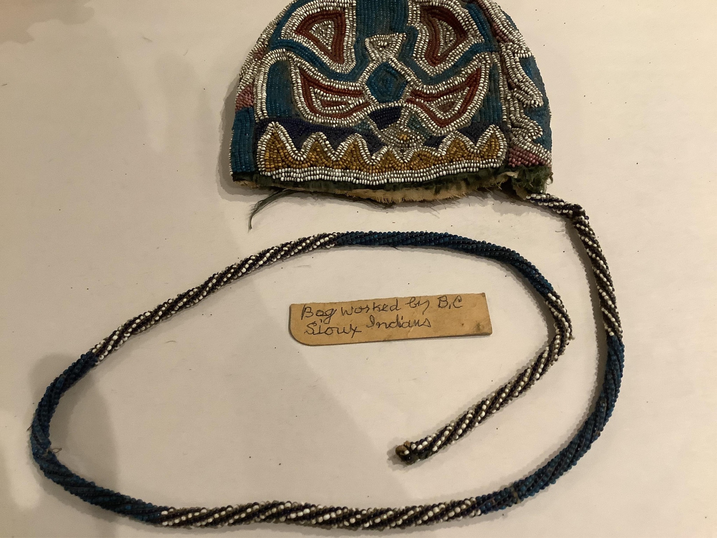 A 19th century Native North American, Iroquois horseshoe shaped multi-coloured beaded purse with central white outlined motif, 13cm high x 14cm wide, with 4cm beaded gusset, and long beaded handle, lined with printed cotton.