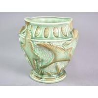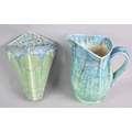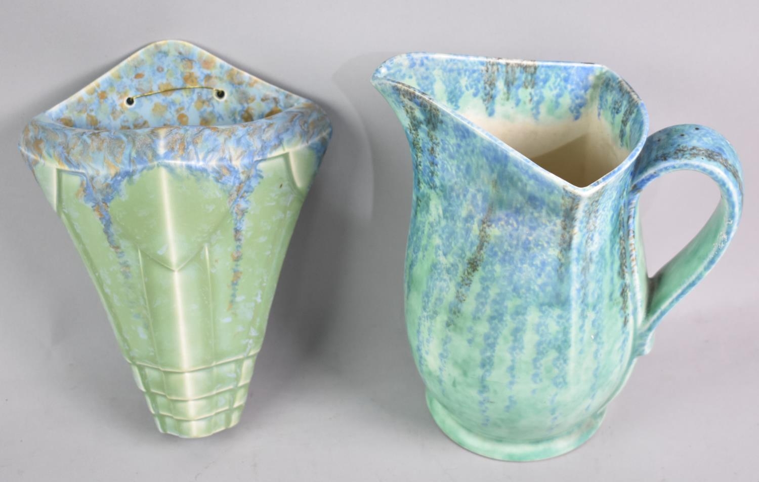 A Vintage Green and Blue Glazed Jug and a Similar Wall Hanging Pocket, 23cms High