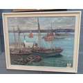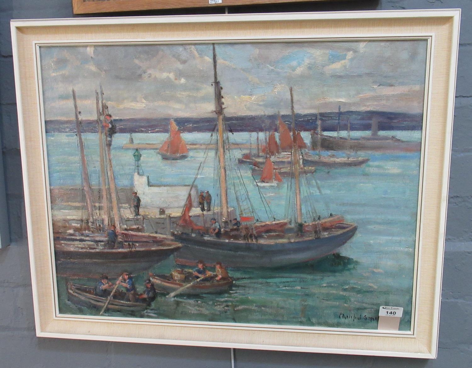 Phillip J Smith (20th century British), busy harbour scene with fishing smacks, oils on canvas. 50 x 65cm approx.