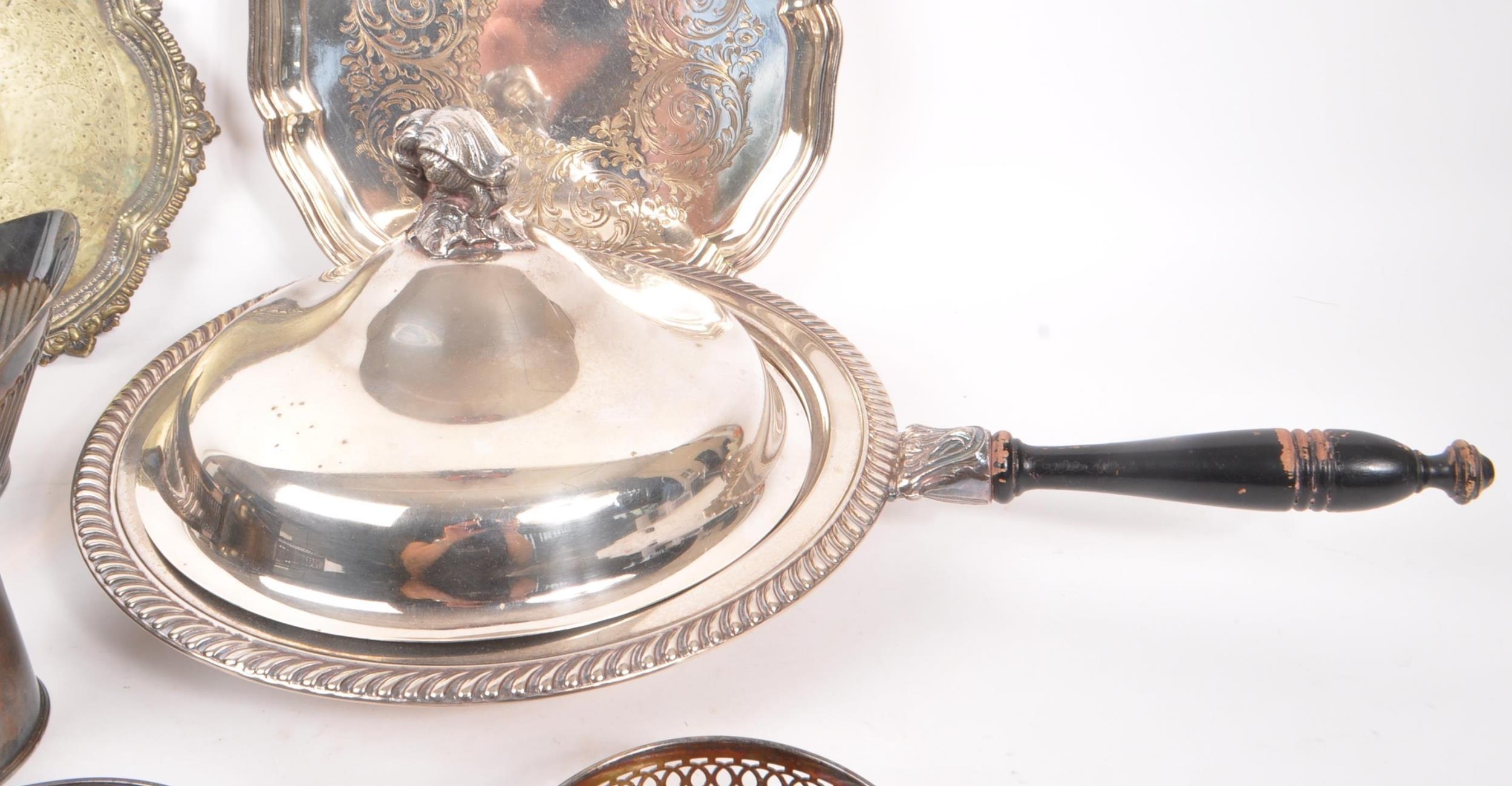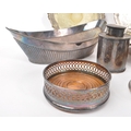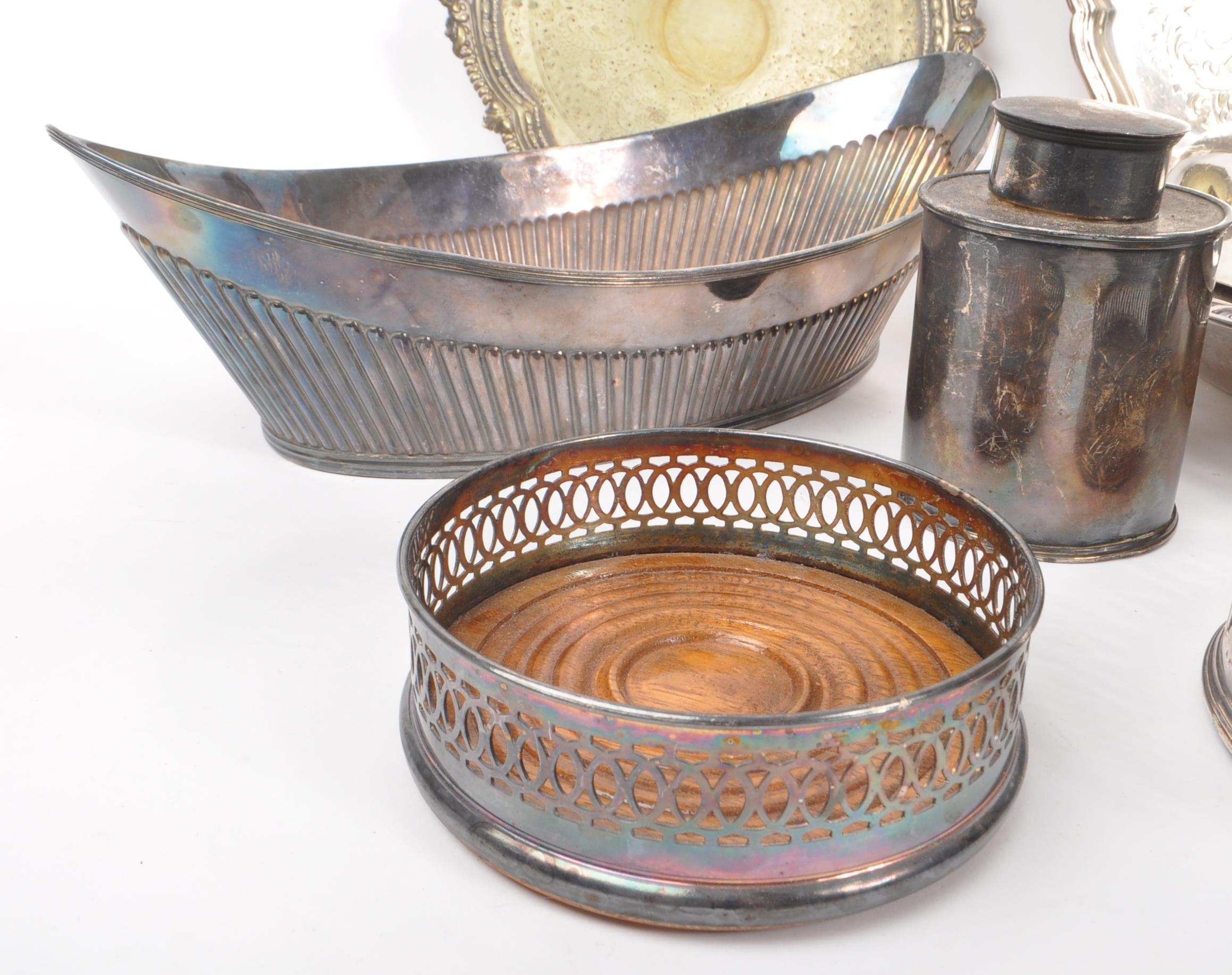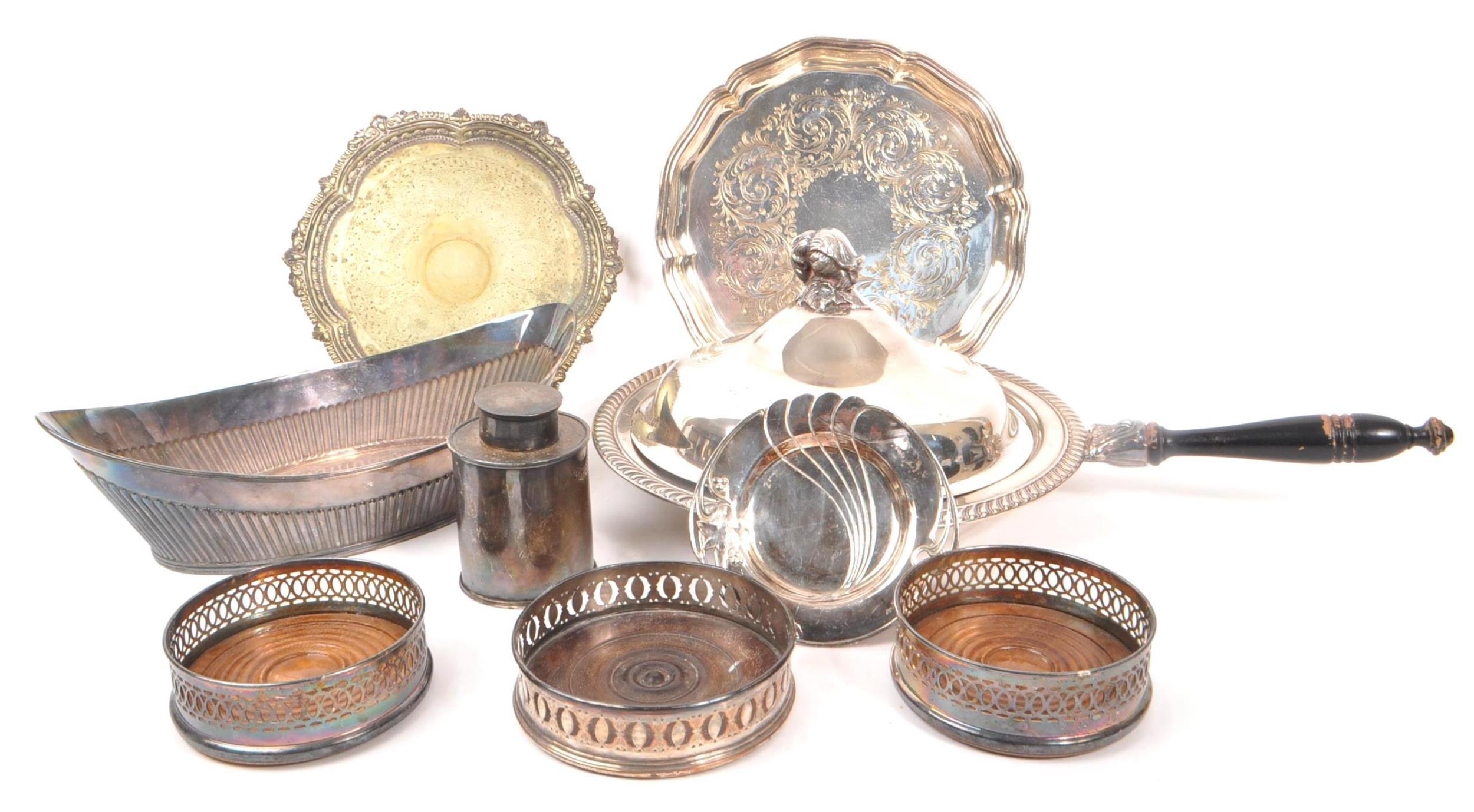 A collection of 19th Century and later silver plated items to include two small raised trays, a lidded saucepan, three circular wooden and silver plate dishes tea caddy and ribbed bowl. Largest measuring approx. 49cm x 29cm.