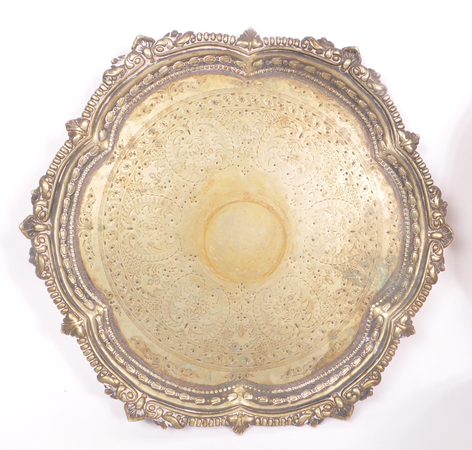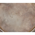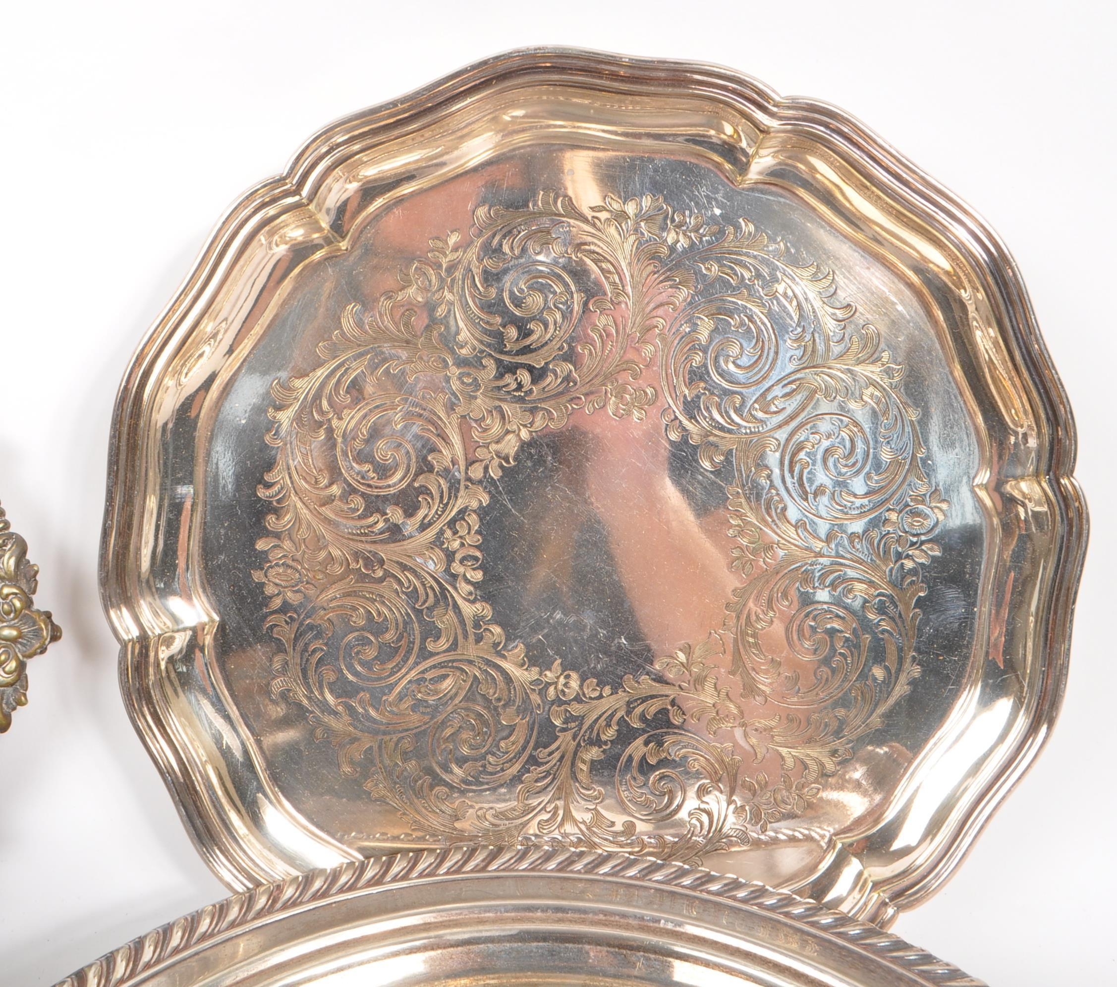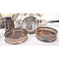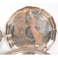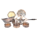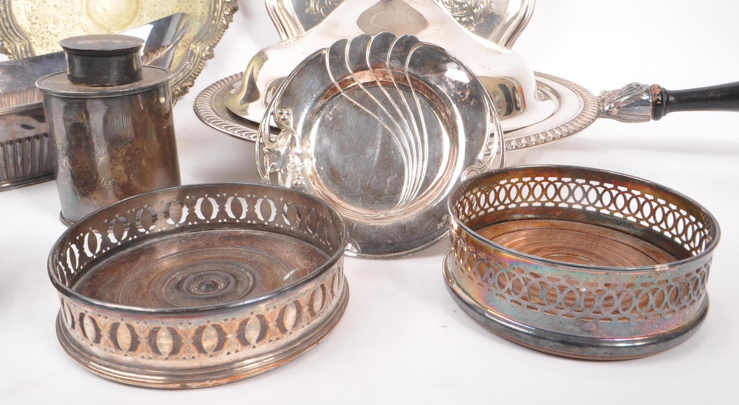 A collection of 19th Century and later silver plated items to include two small raised trays, a lidded saucepan, three circular wooden and silver plate dishes tea caddy and ribbed bowl. Largest measuring approx. 49cm x 29cm.