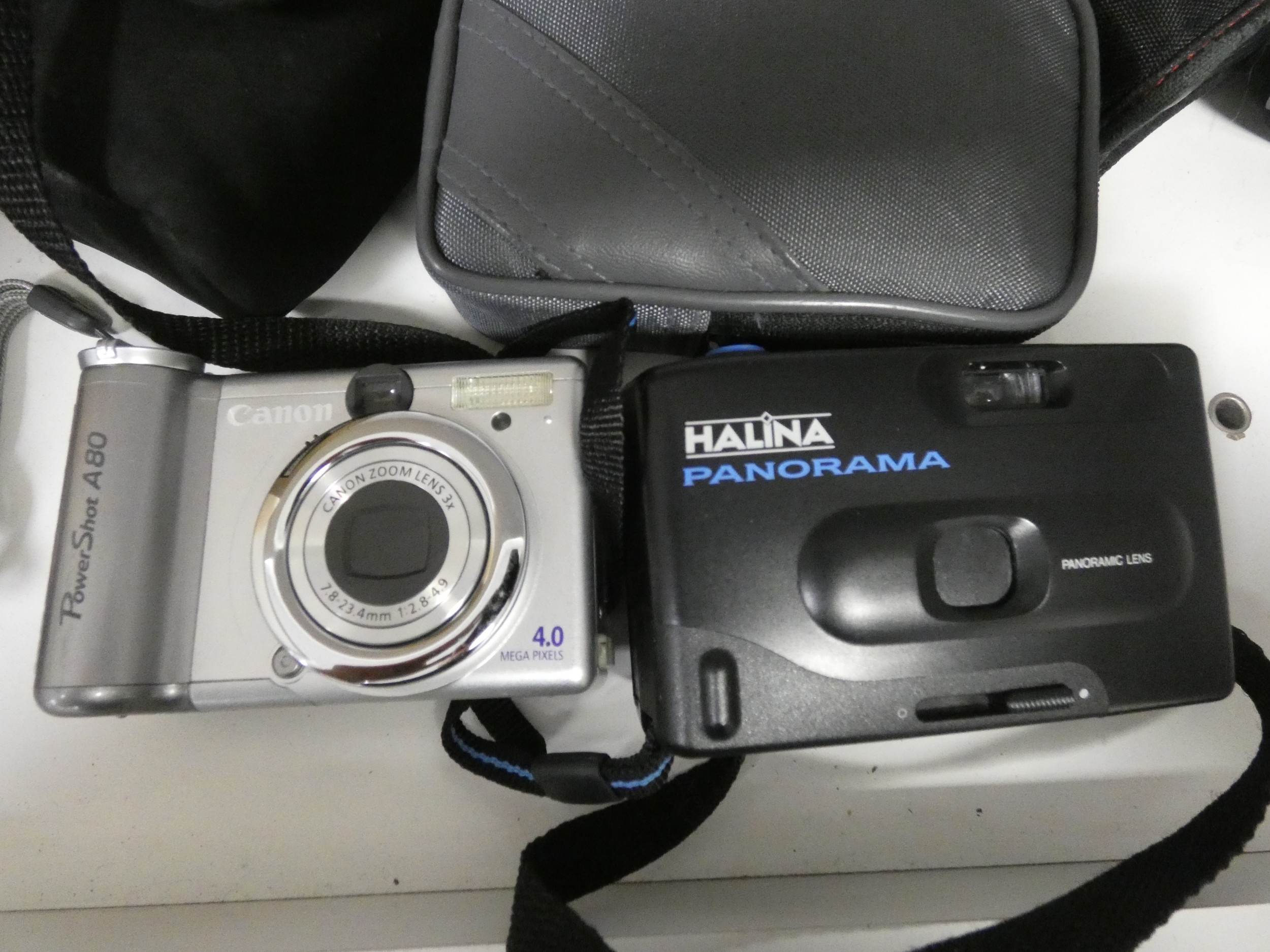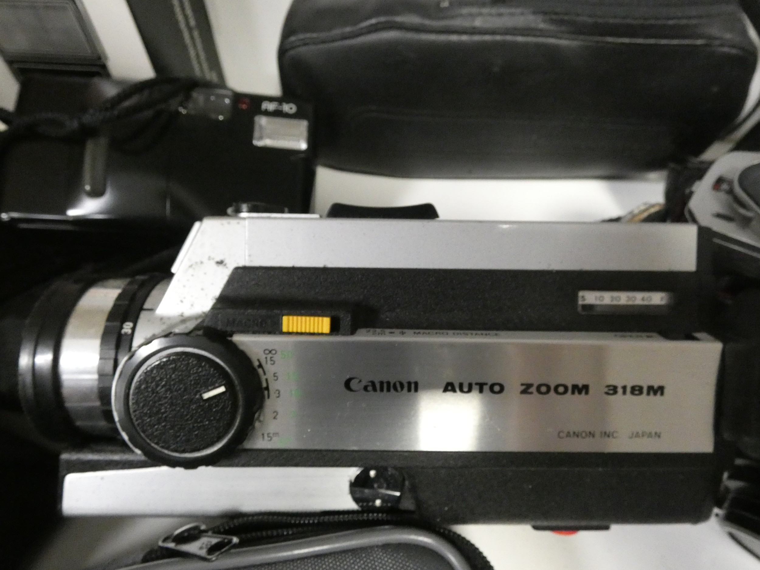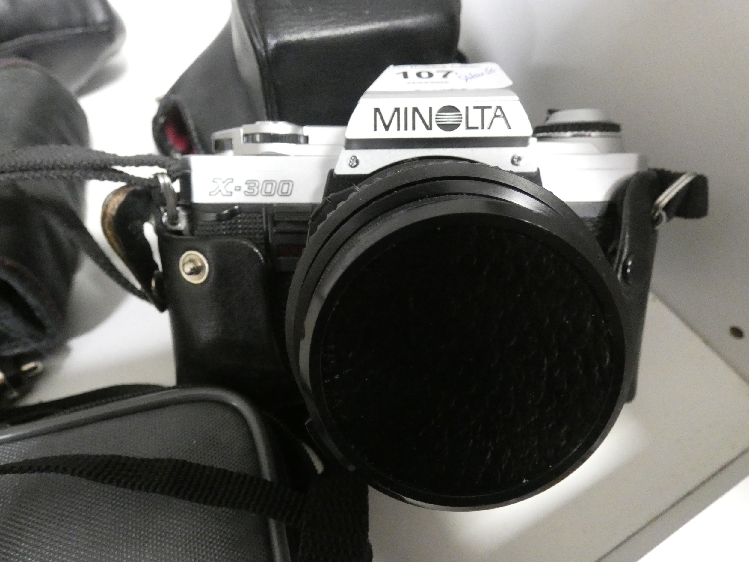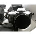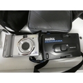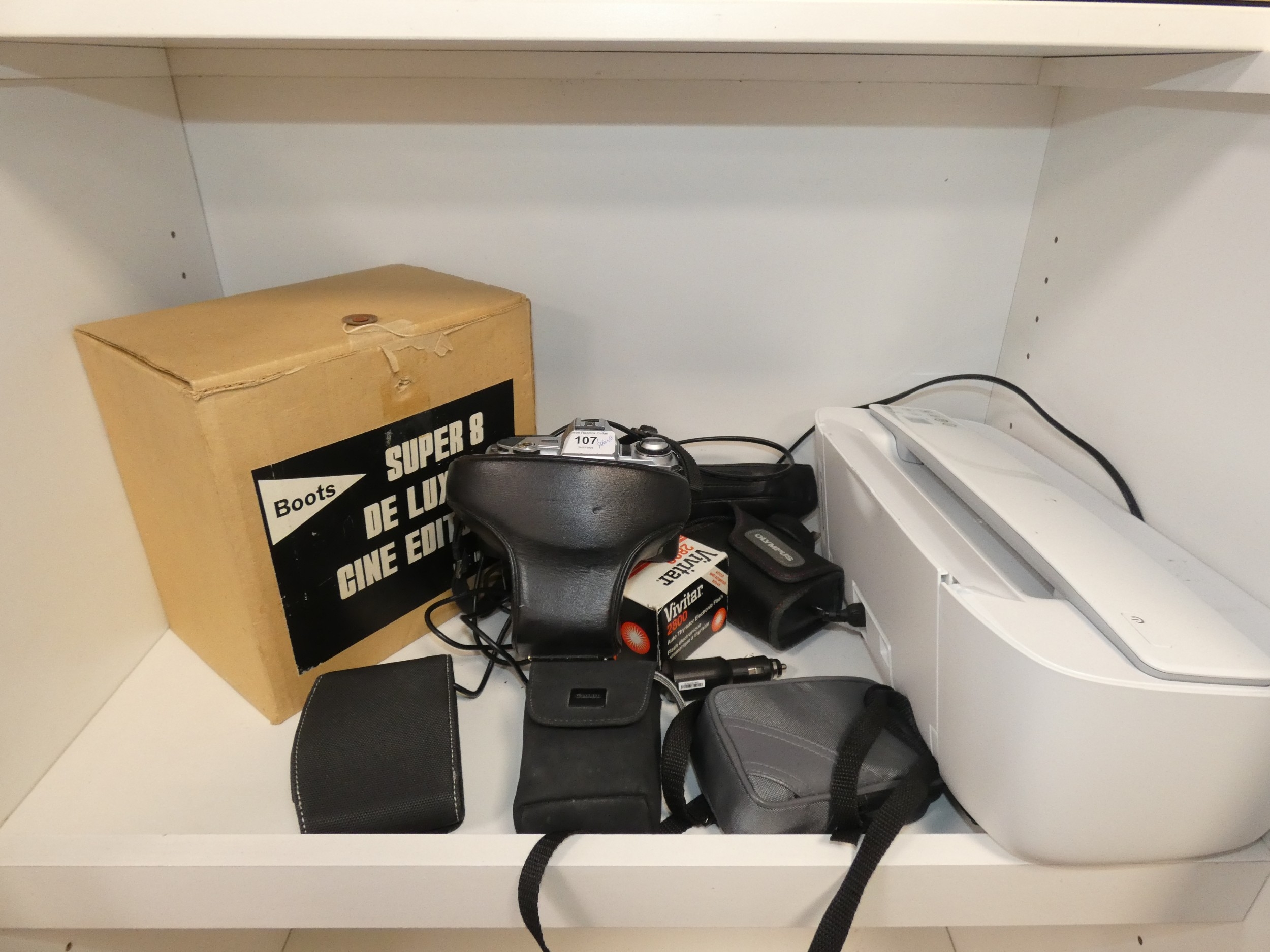 Shelf lot of cameras to include Minolta X-300, digital camera, Super 8 cine camera and HP Deskjet printer etc.