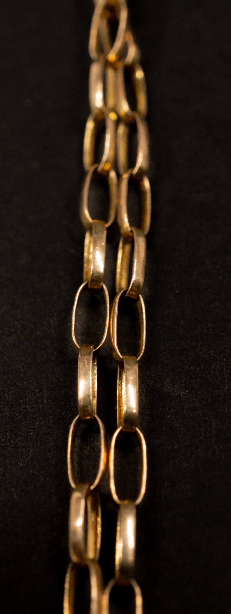 Jewellery: 9ct gold oval belcher link chain, length 100cm, 7.6g.