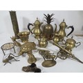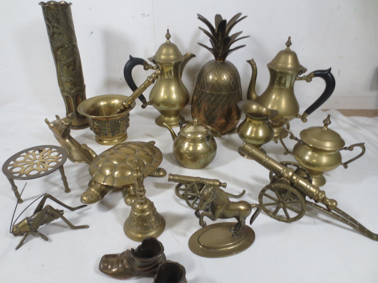 A fantastic selection of Brassware including WW1 trench art shell ,Pineapple Ice bucket ,Horse coat hook ,Coffee and Tea pot , Grass hopper ,Horse and other ornaments as per pictures