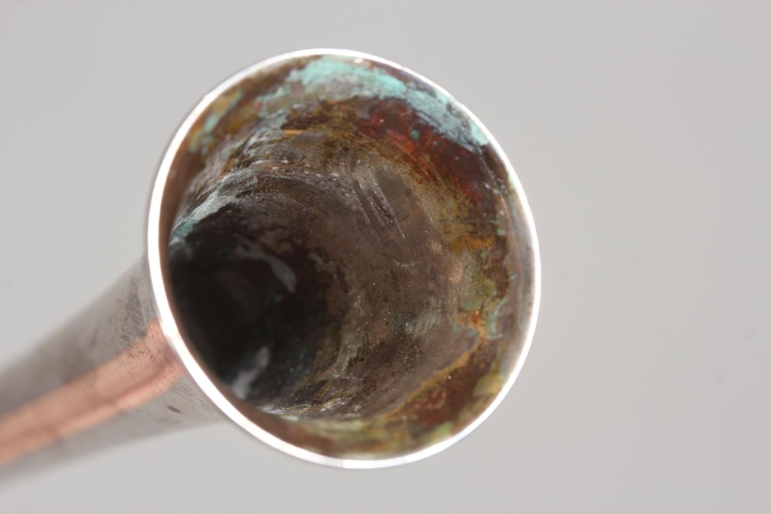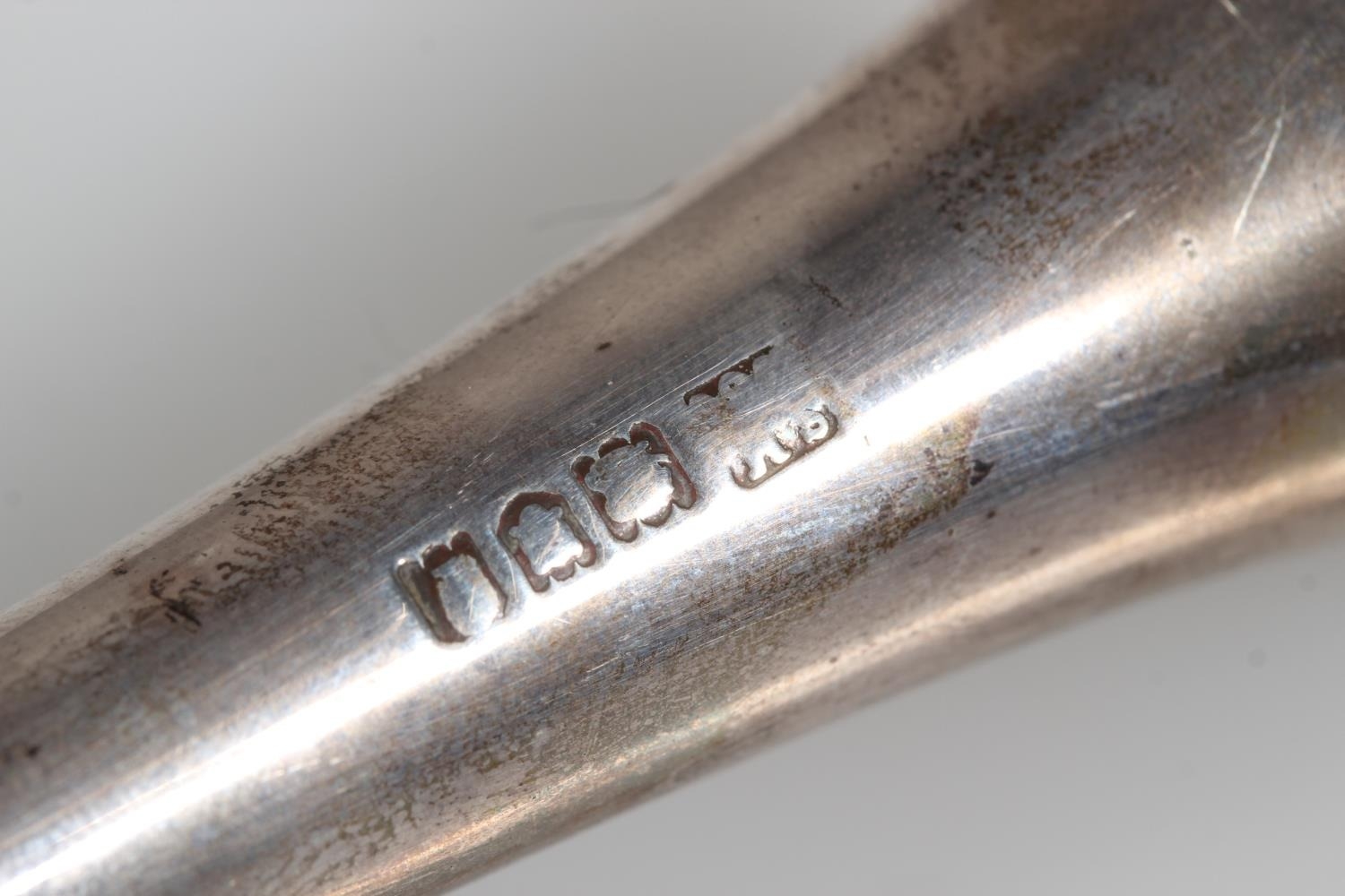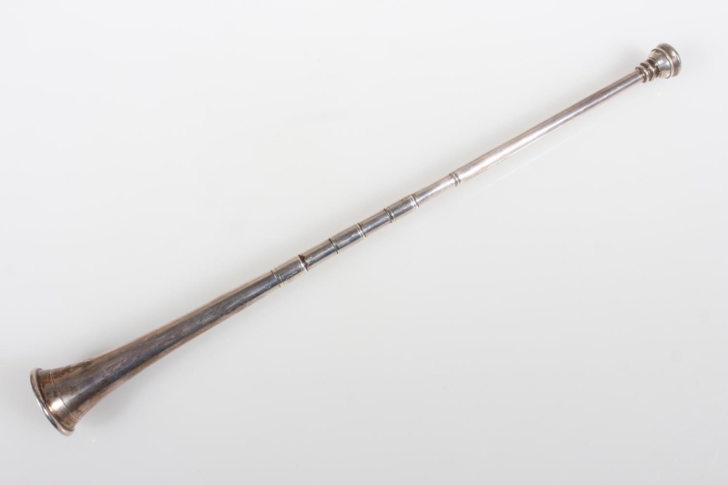 Silver candle snuffer modelled as a hunting horn, Sampson Mordan & Co, London, 47g, 30cm.