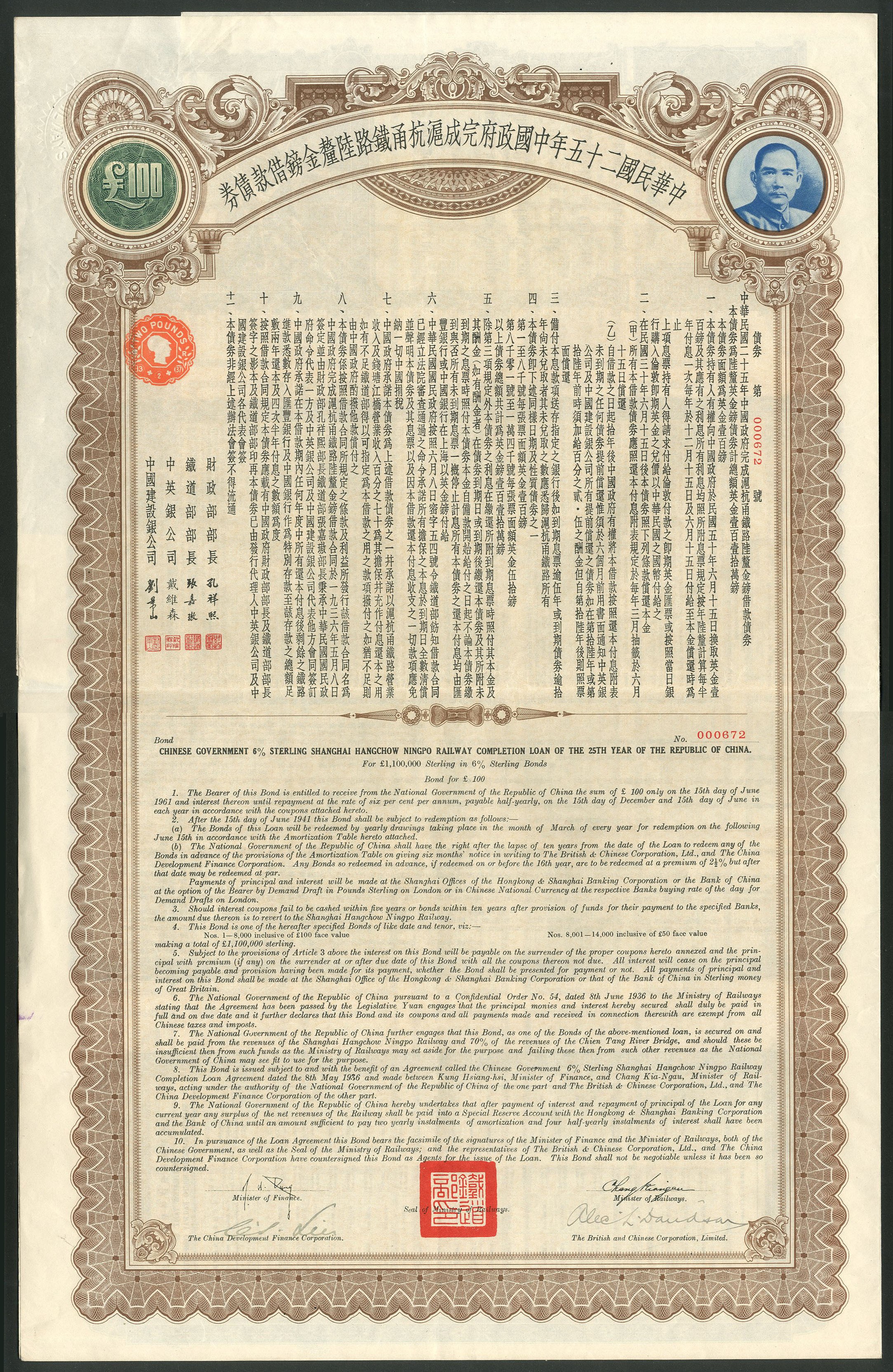 China: 1936 6% Shanghai Hangchow Ningpo Railway Completion Loan, £100, #000672, very large format, brown, blue and green, with coupons. GVF.