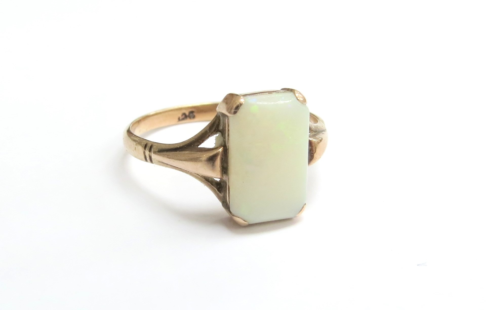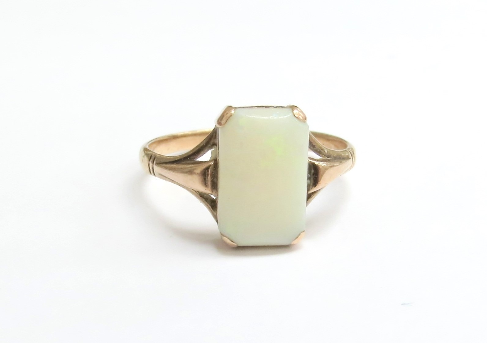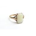 A rectangular opal ring in a gold shank stamped 9ct. Size M, 1.3g