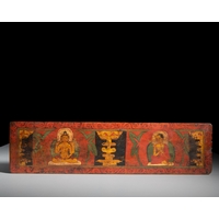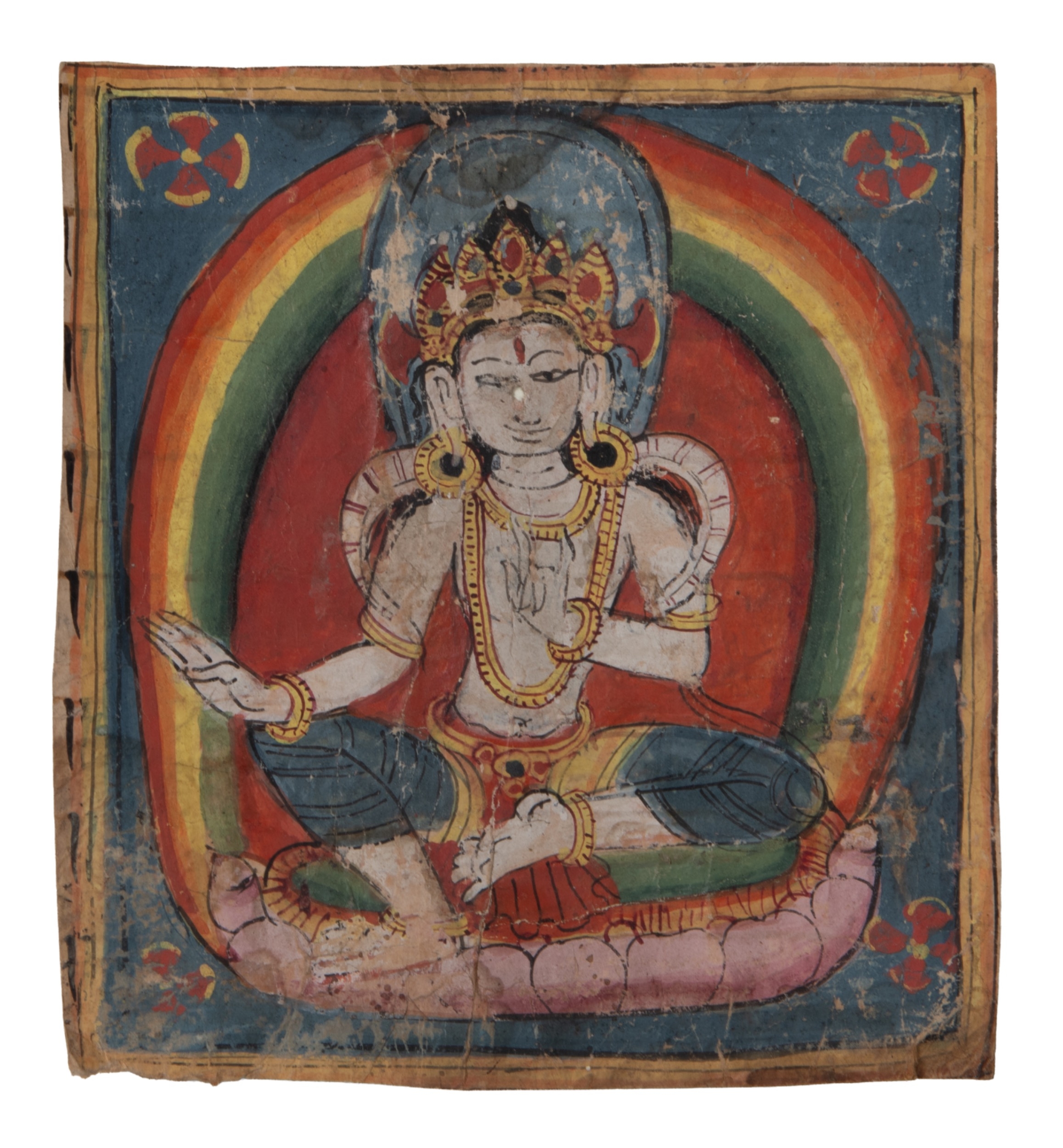 A PORTABLE THANGKA DEPICTING WHITE TARA 西藏 十三世纪 随身白度母唐卡 Tibet, 13th century Size.14x12.7cm Painted in mineral pigments on cloth, this intimate portable thangka depicts White Tara (Sitatara), the female embodiment of compassion and longevity. She is shown seated in lalitasana on a pink lotus pedestal, her right hand in the varada mudra (gesture of granting blessings) and her left hand holding the stem of an unseen lotus. Her body is rendered in pale tones, adorned with jewels and a five-leaf crown, surrounded by a luminous rainbow mandorla symbolizing divine purity and transcendence. 此幅唐卡以天然矿物颜料绘制于布本之上,主尊为白度母端坐于莲台之上,呈半跏趺坐姿,右手施予愿印,左手持莲花茎。白度母为慈悲与长寿的化身,面容宁静,身饰璎珞宝冠,体态柔美,背光为彩虹光环,象征清净无垢与超越凡界。画面色彩柔和古雅,线条细致流畅,显现十三世纪西藏早期绘画的风格特征。