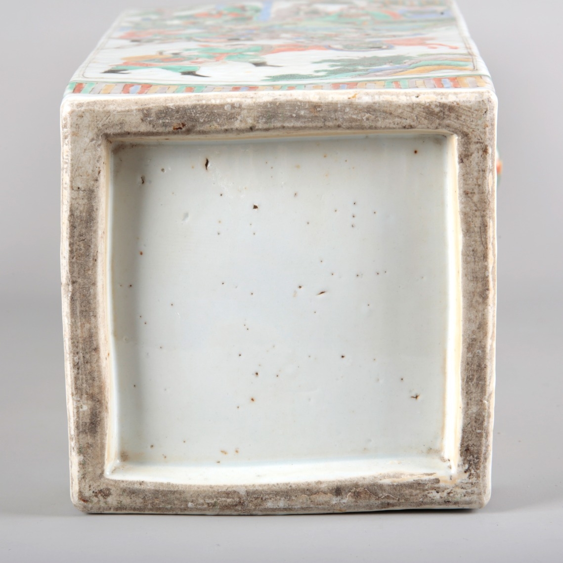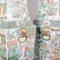 18th century or later, of tapered square section, decorated with a courtyard scene where noble figures sit watching a skirmish below, 58cm high x 19cm wide x 19cm deep (2)