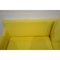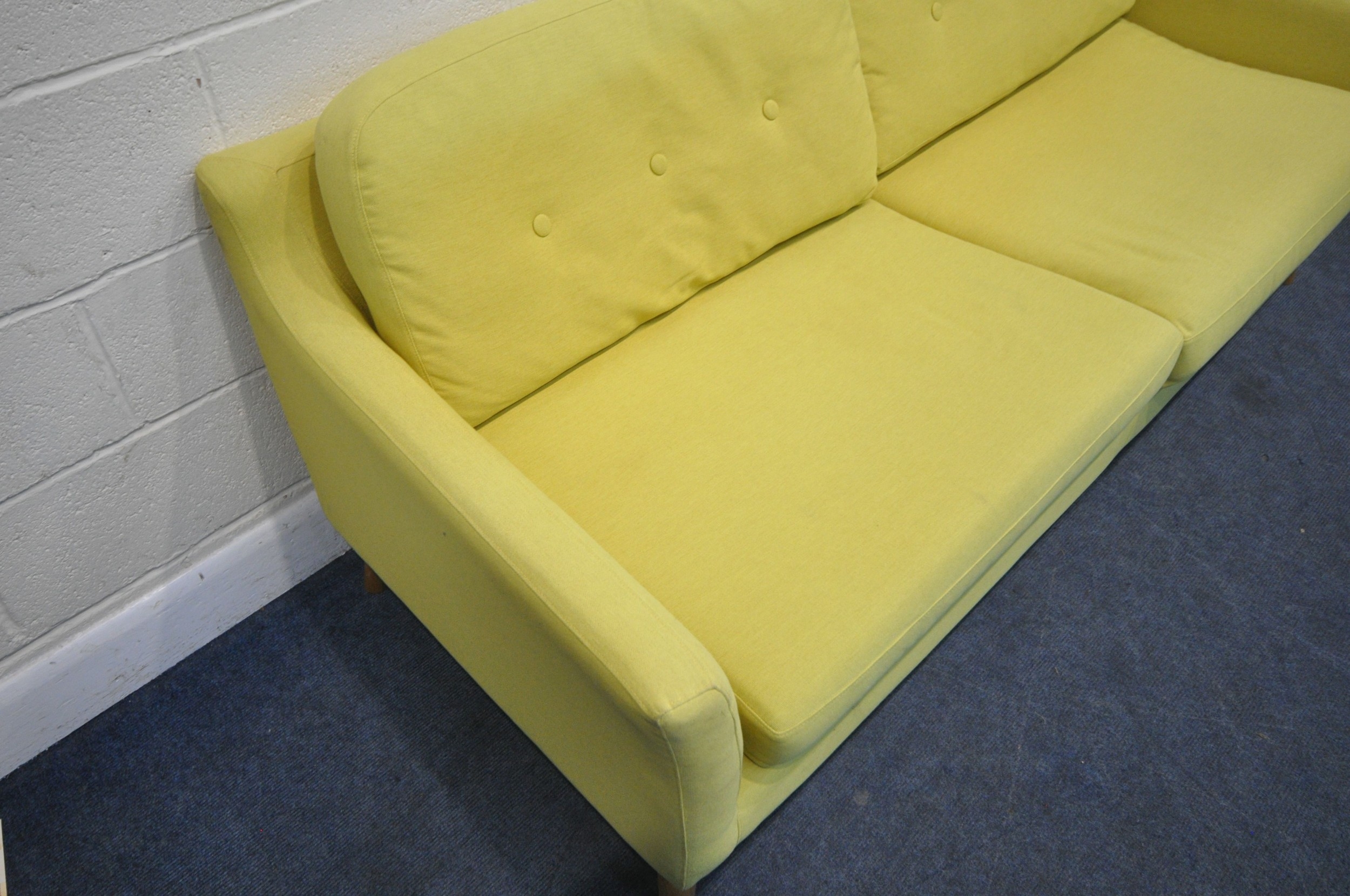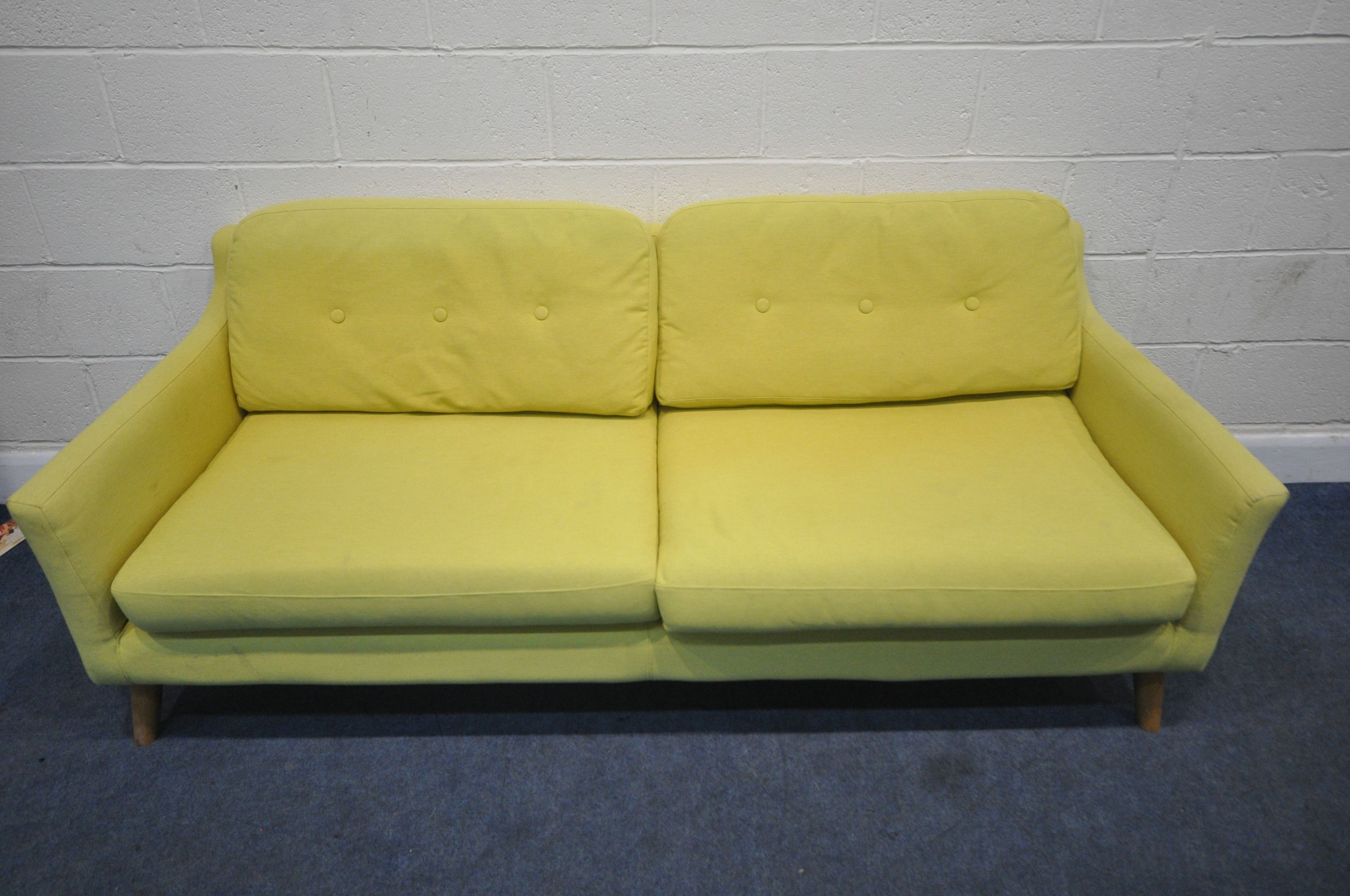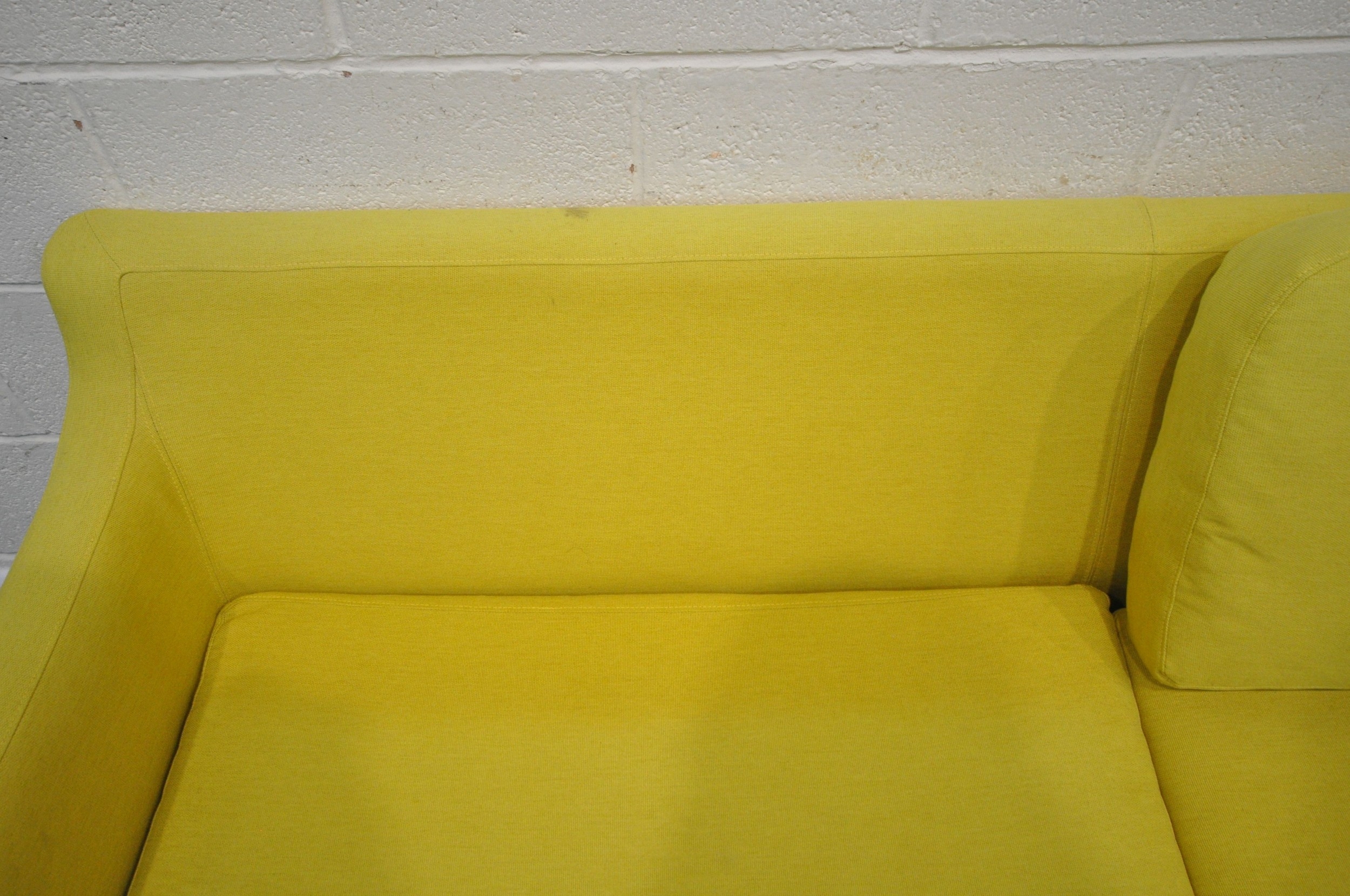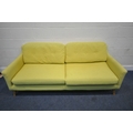A MODERN LIME GREEN UPHOLSTERED SOFA, raised on cylindrical tapered legs, length 202cm x depth 90cm x height 72cm, condition report: upholstery sun bleached, ideal for a clean, other signs of wear and usage