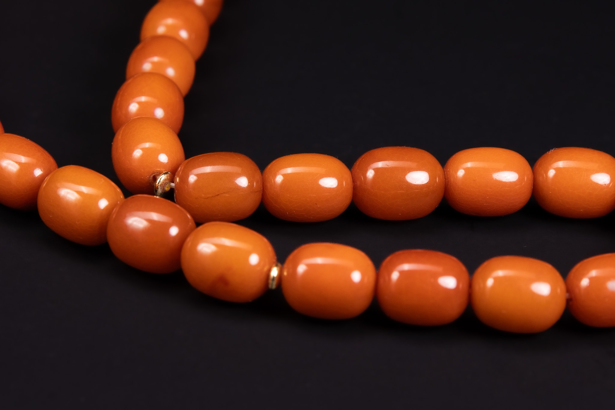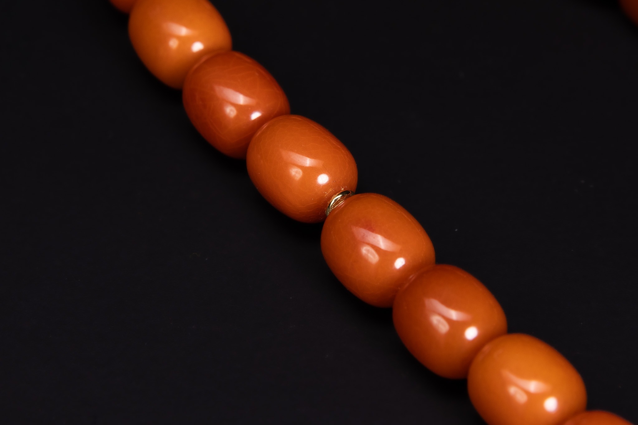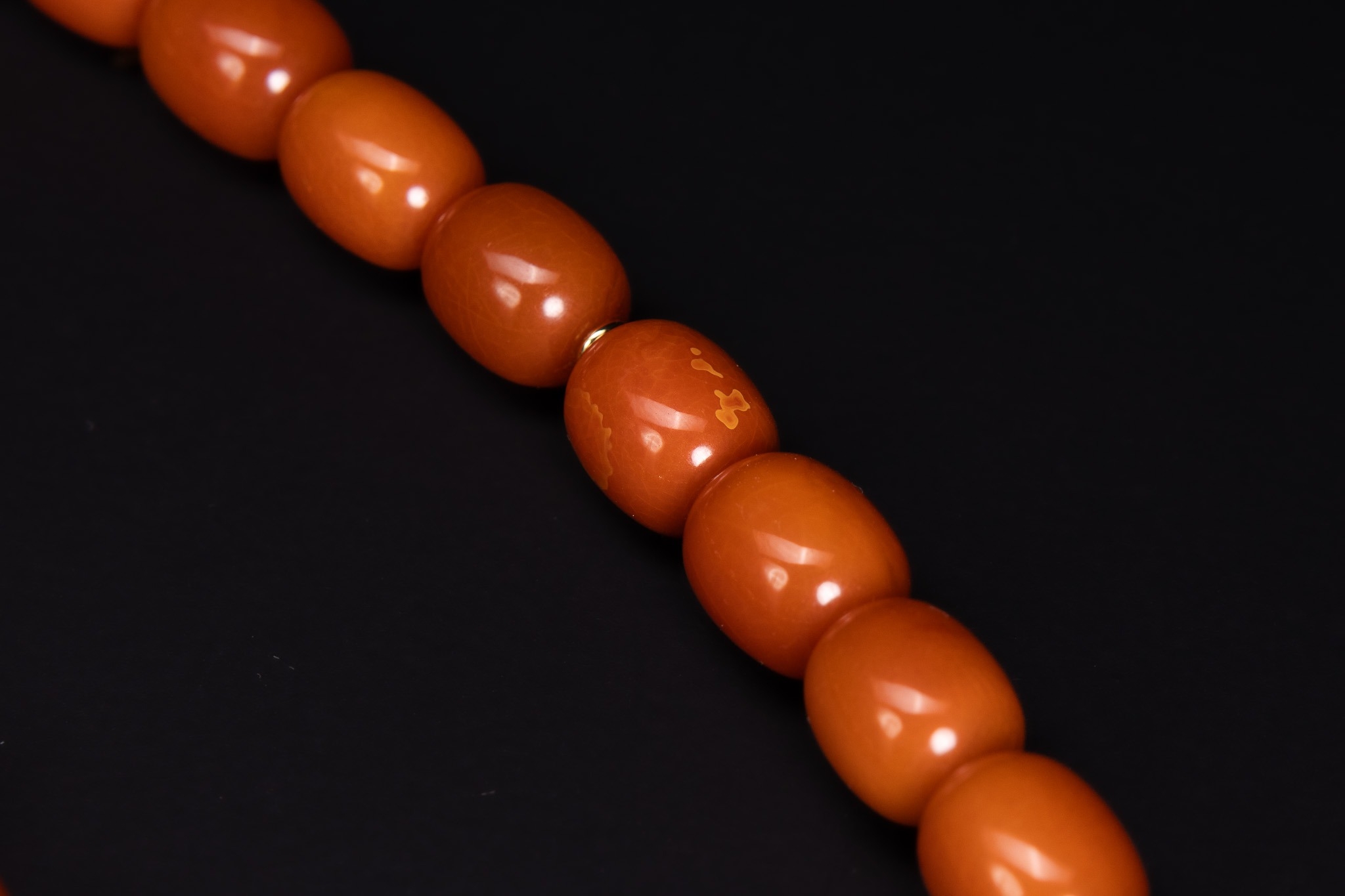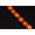 A single-strand bead necklace featuring 33 barrel-shaped beads. The beads are of an opaque butterscotch-orange colour, displaying internal swirls and tonal variations. The strand is accented with small yellow metal spacer rings positioned between several beads; no hallmarks are visible on these spacers. The necklace is currently strung on a white cord and lacks a formal clasp, being finished with a simple knotted end.