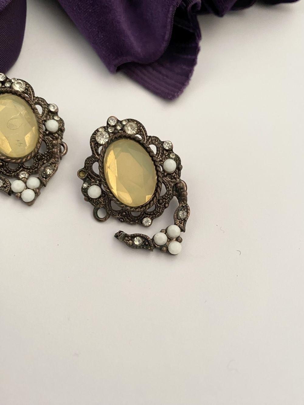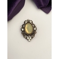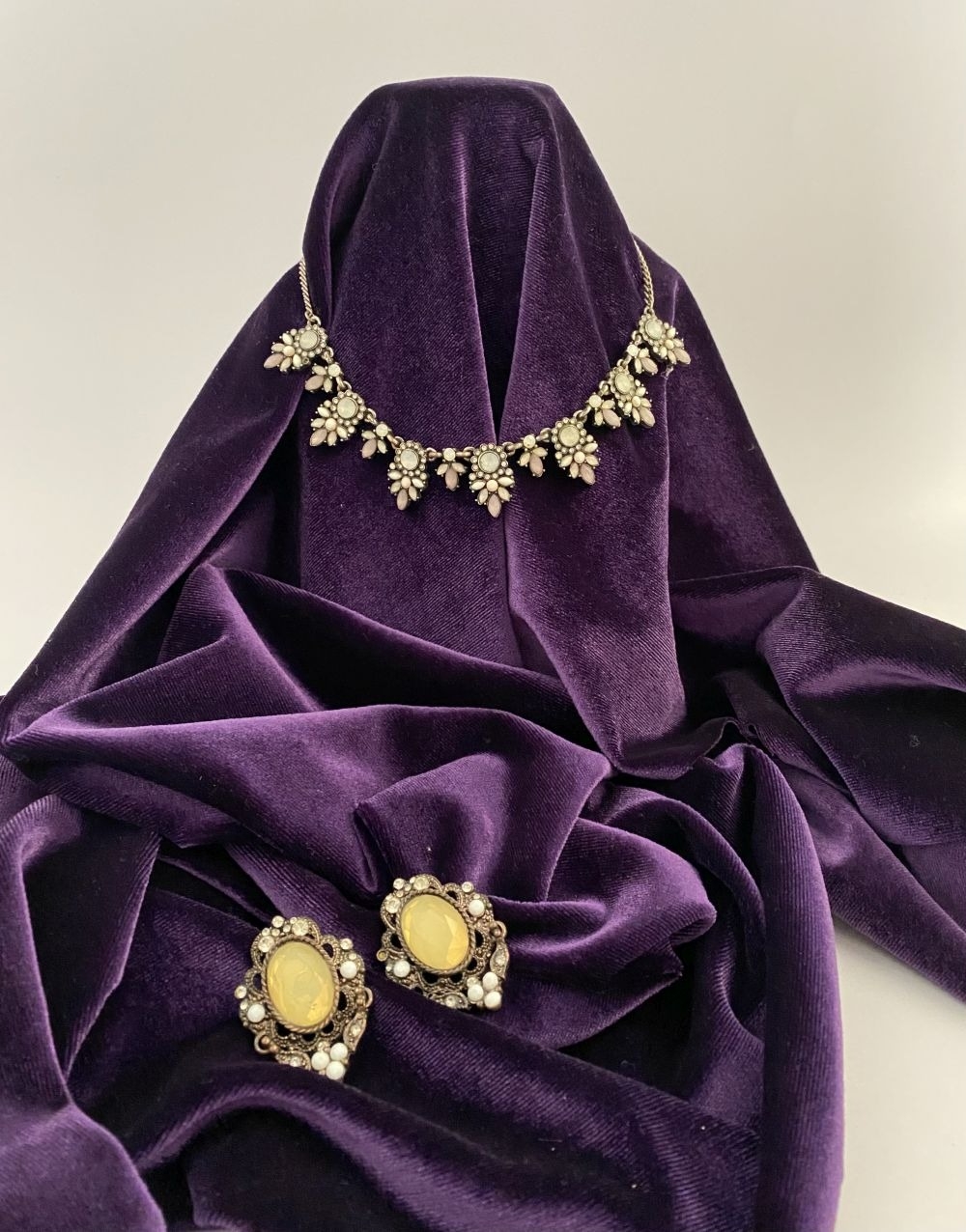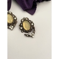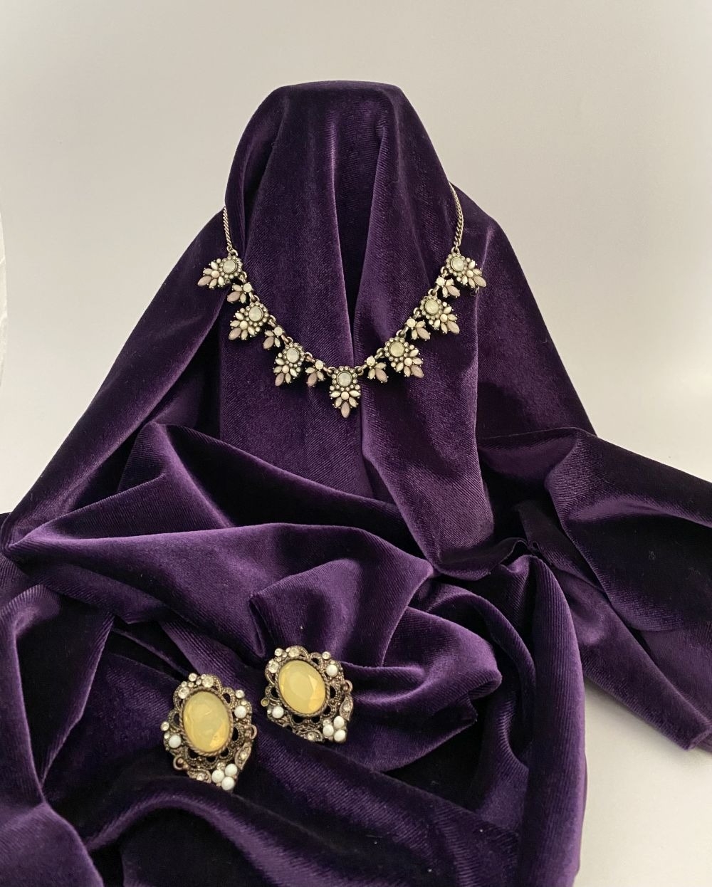 A PRETTY SILVER TONE GEMSET NECKLACE & PAIR OF DROP EARRINGS, the necklace is set with a variety of stones, on silver tone setting and chain. The earrings are set with central yellow oval cut stone surrounded by clear round cut stones and white stones, in decorative setting. Small repair needed to one earring as photographed.