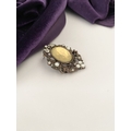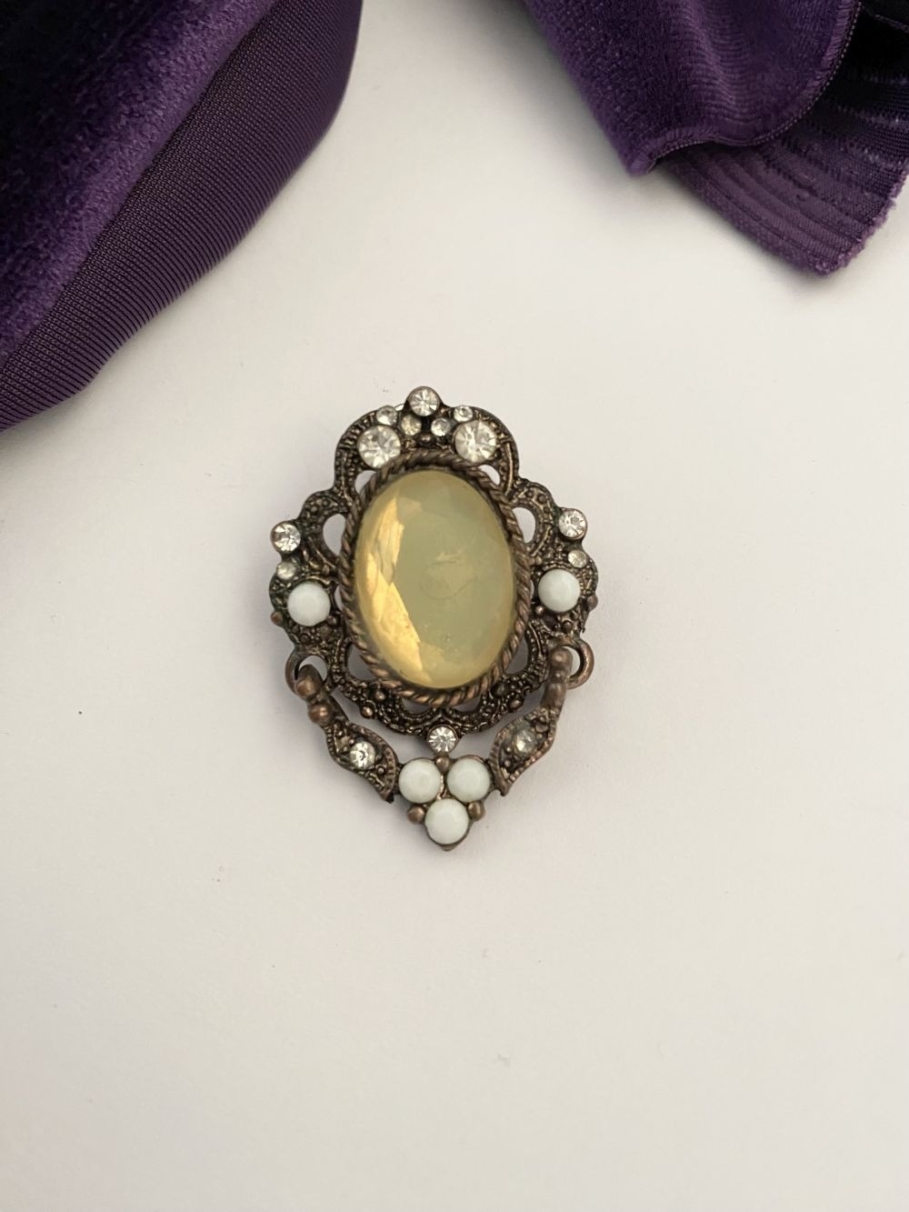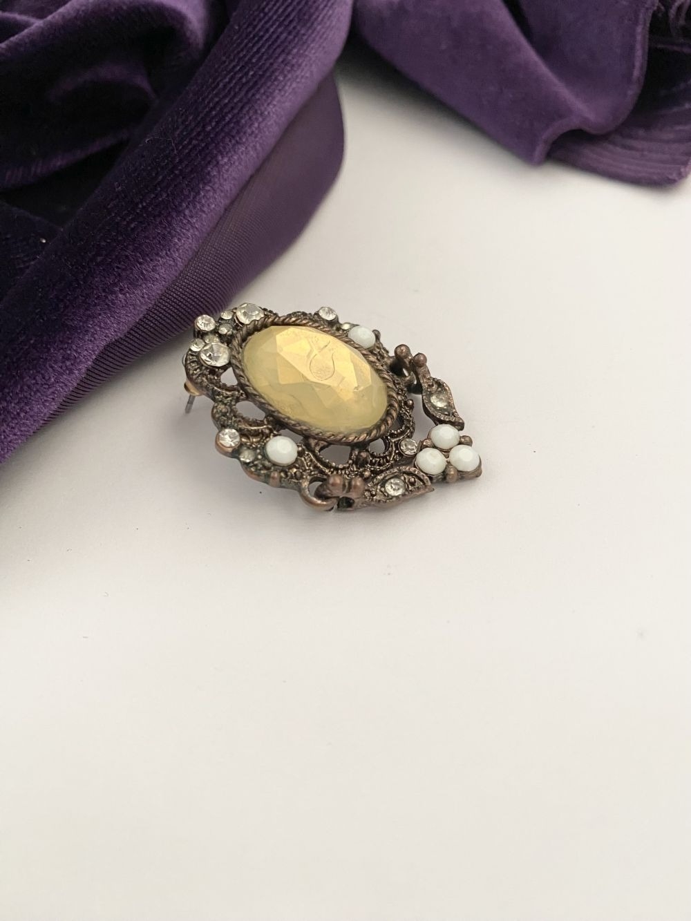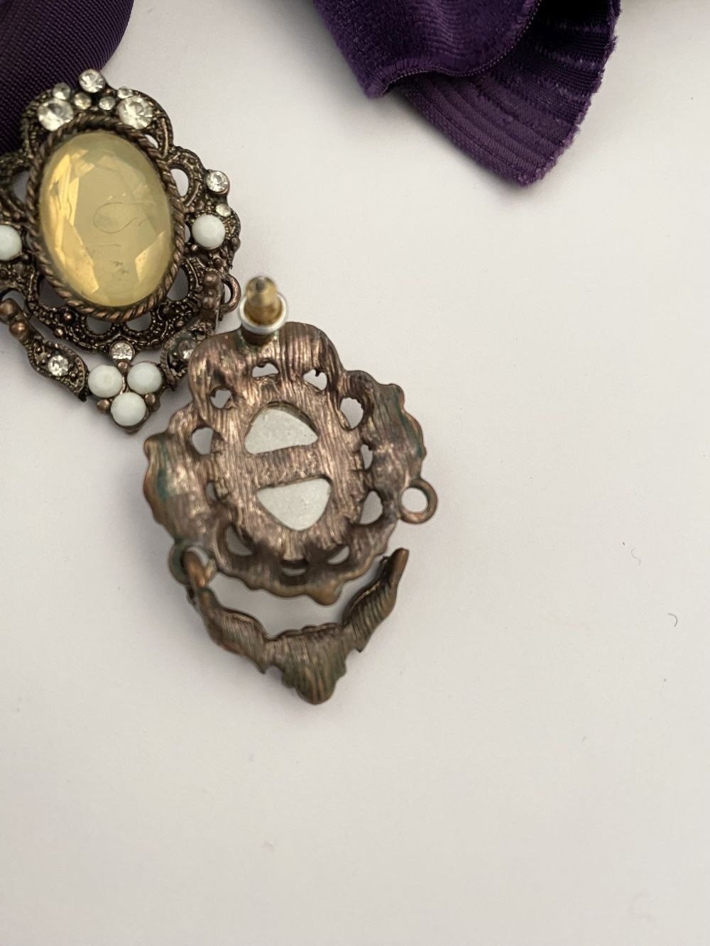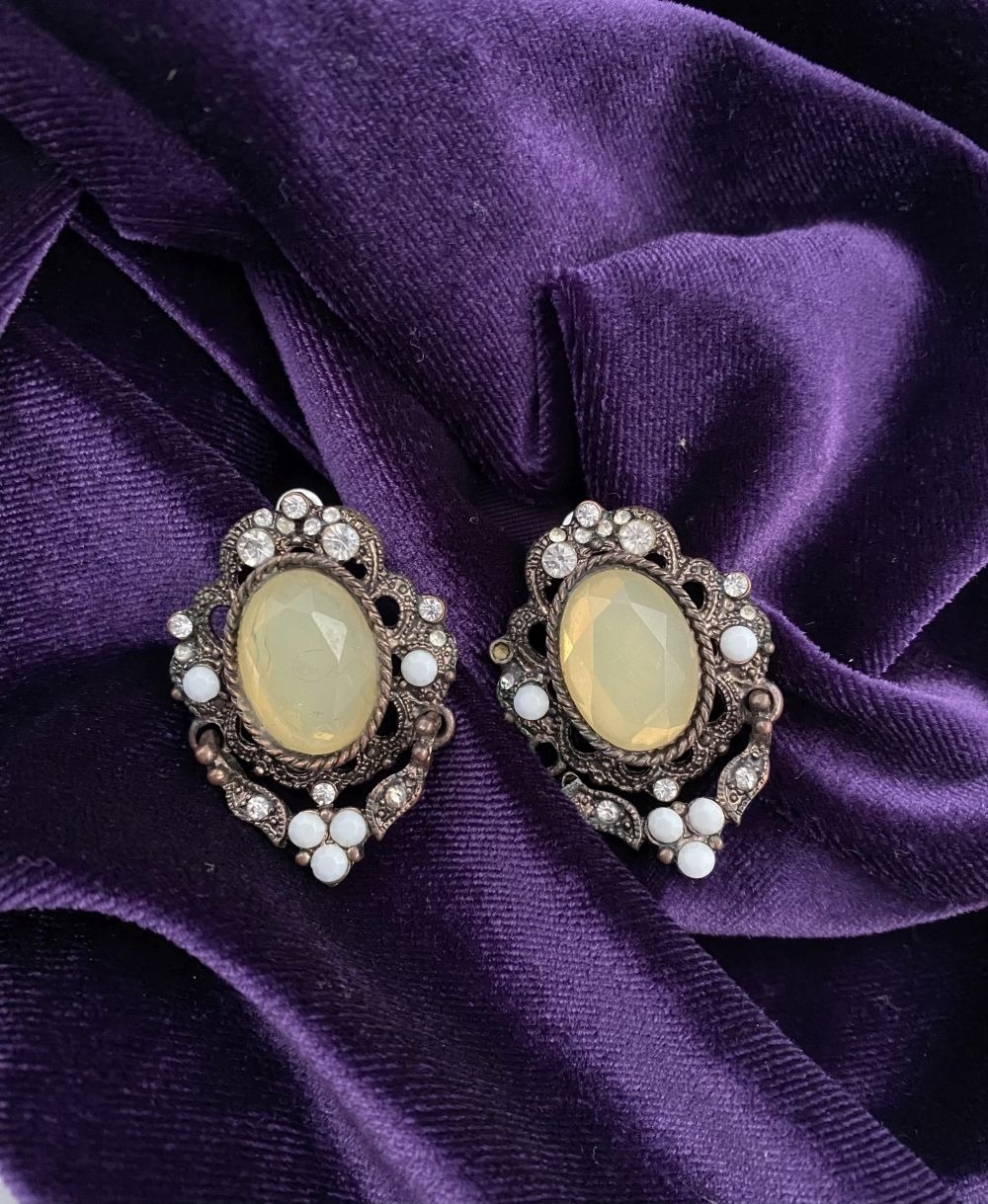 A PRETTY SILVER TONE GEMSET NECKLACE & PAIR OF DROP EARRINGS, the necklace is set with a variety of stones, on silver tone setting and chain. The earrings are set with central yellow oval cut stone surrounded by clear round cut stones and white stones, in decorative setting. Small repair needed to one earring as photographed.