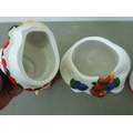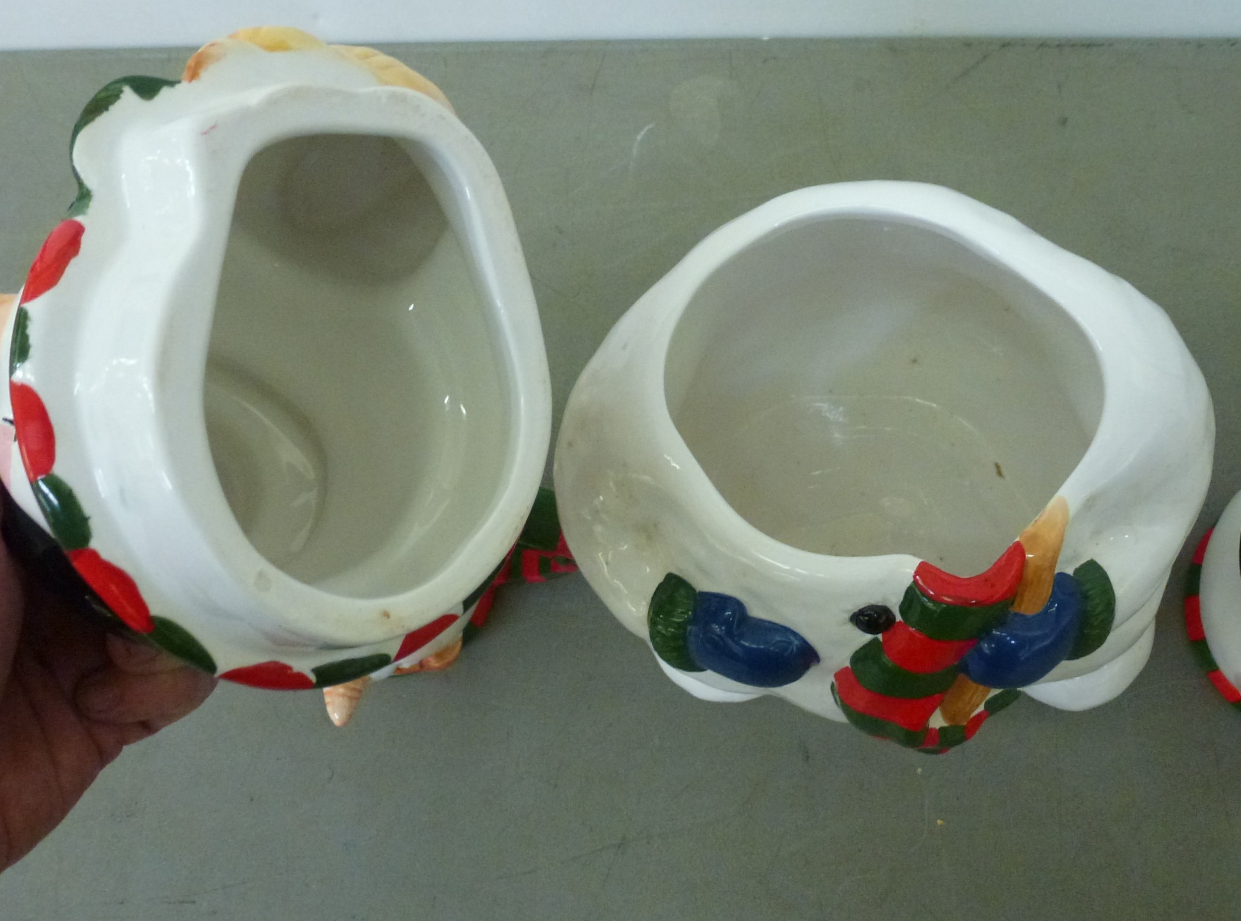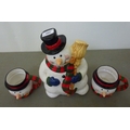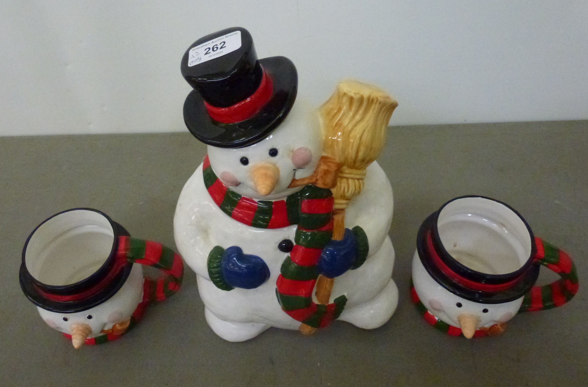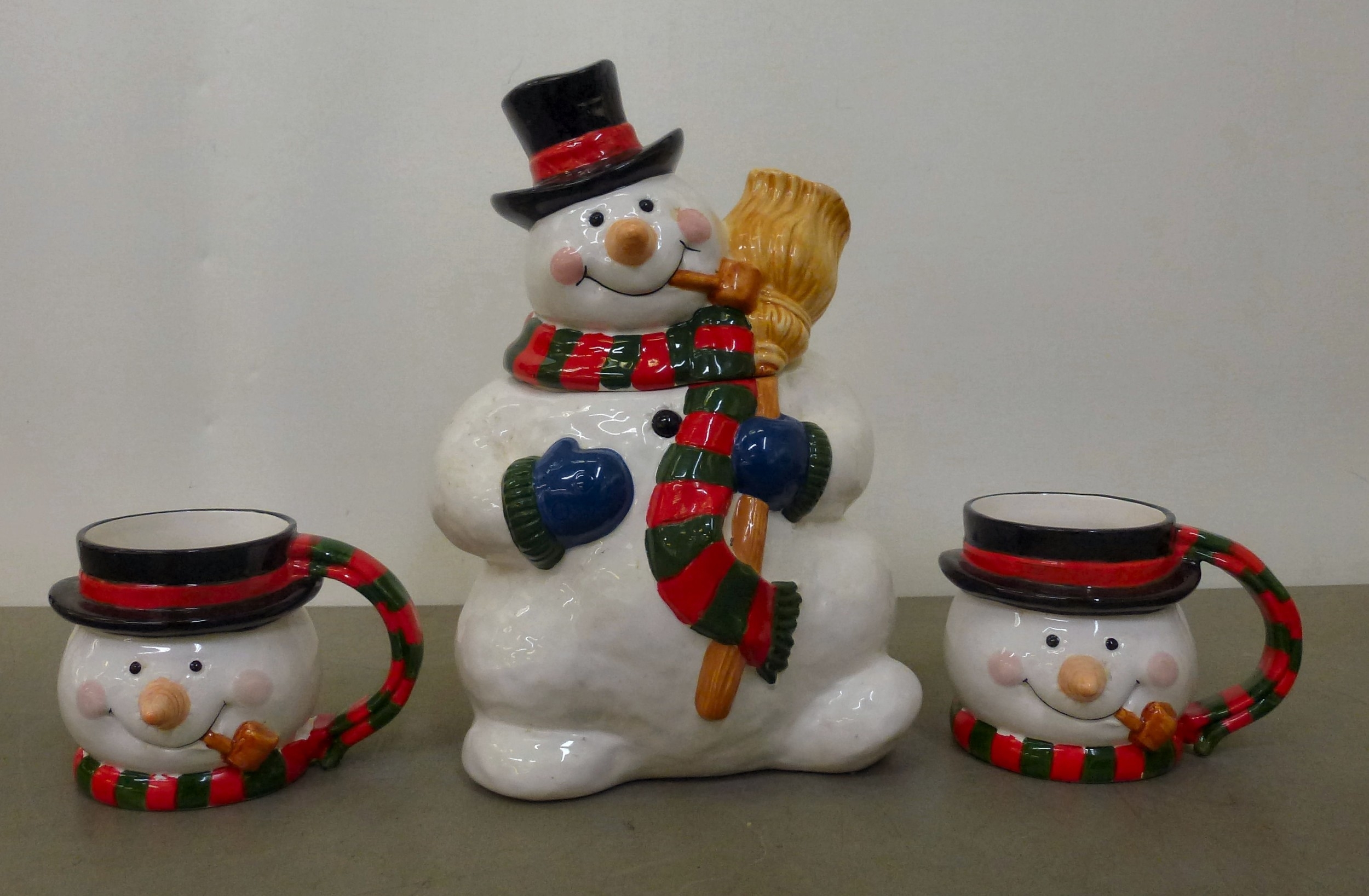 A novelty china lidded cookie jar, fashioned as a snowman; and two mugs