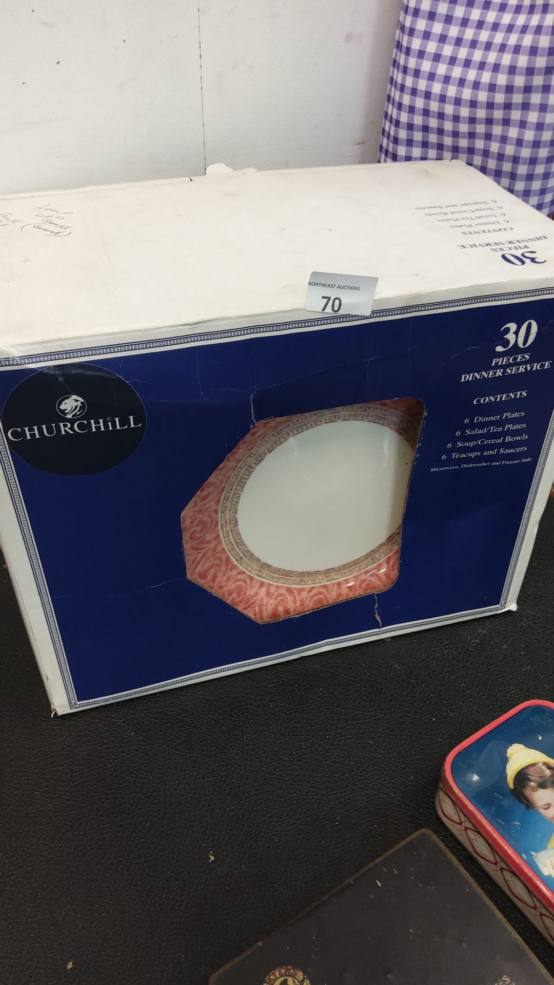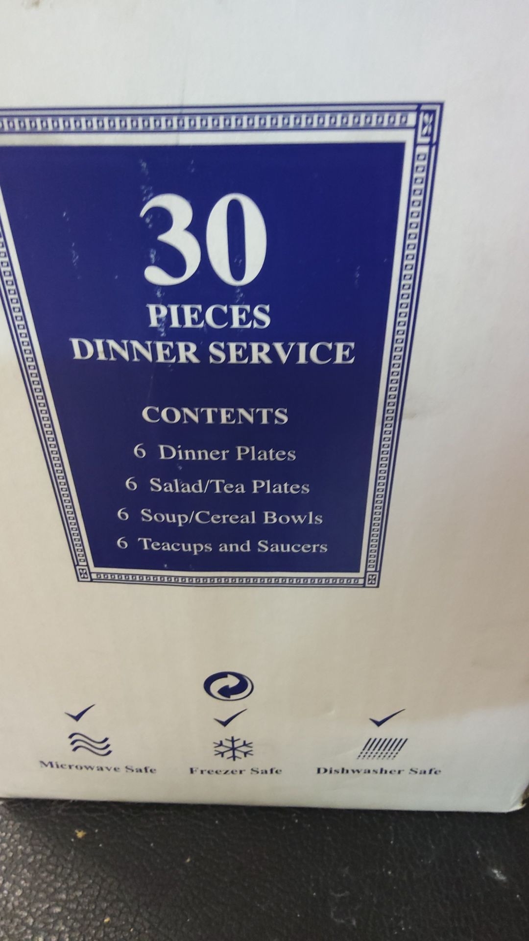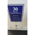 30-piece dinner service includes 6 dinner plates, 6 salad/tea plates, 6 soup/cereal bowls, 6 teacups, and 6 saucers