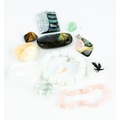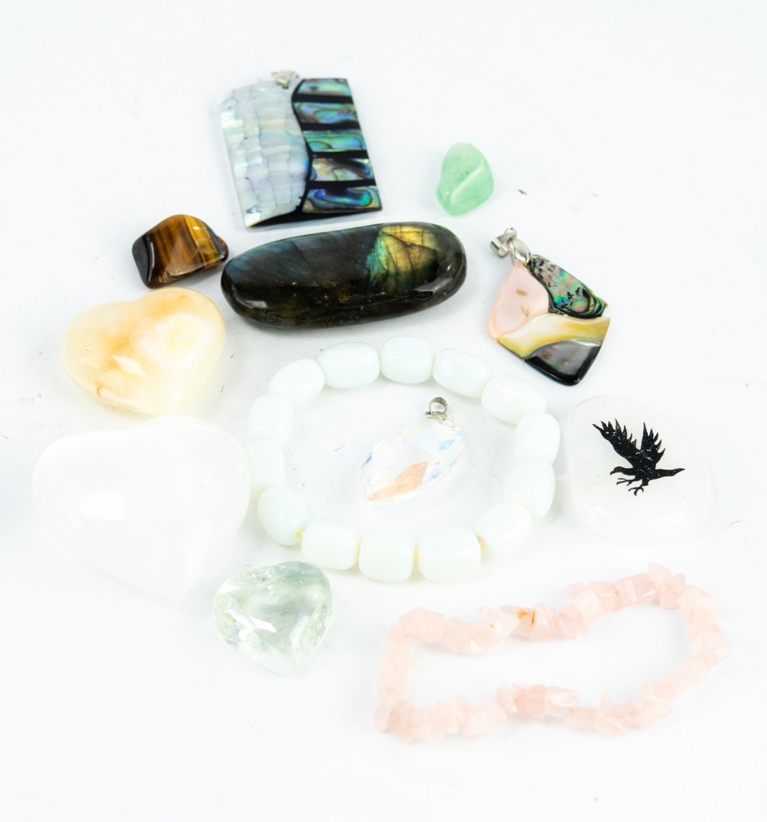 LARGE RECTANGULAR INLAID PENDANT with abalone, onyx and mother of pearl; ANOTHER SIMILAR PENDANT, diamond shaped; large marquise shaped CRYSTAL PENDANT; a milky quartz tumbled bead stretch BRACELET; rose quartz chip stretch BRACELET; selection of LOOSE SEMI-PRECIOUS TUMBLED STONES including heart shaped agates, labradorite, tiger's eye, aventurine, an engraved eagle on agate, snowflake obsidian, carnelian, strawberry quartz, amazonite