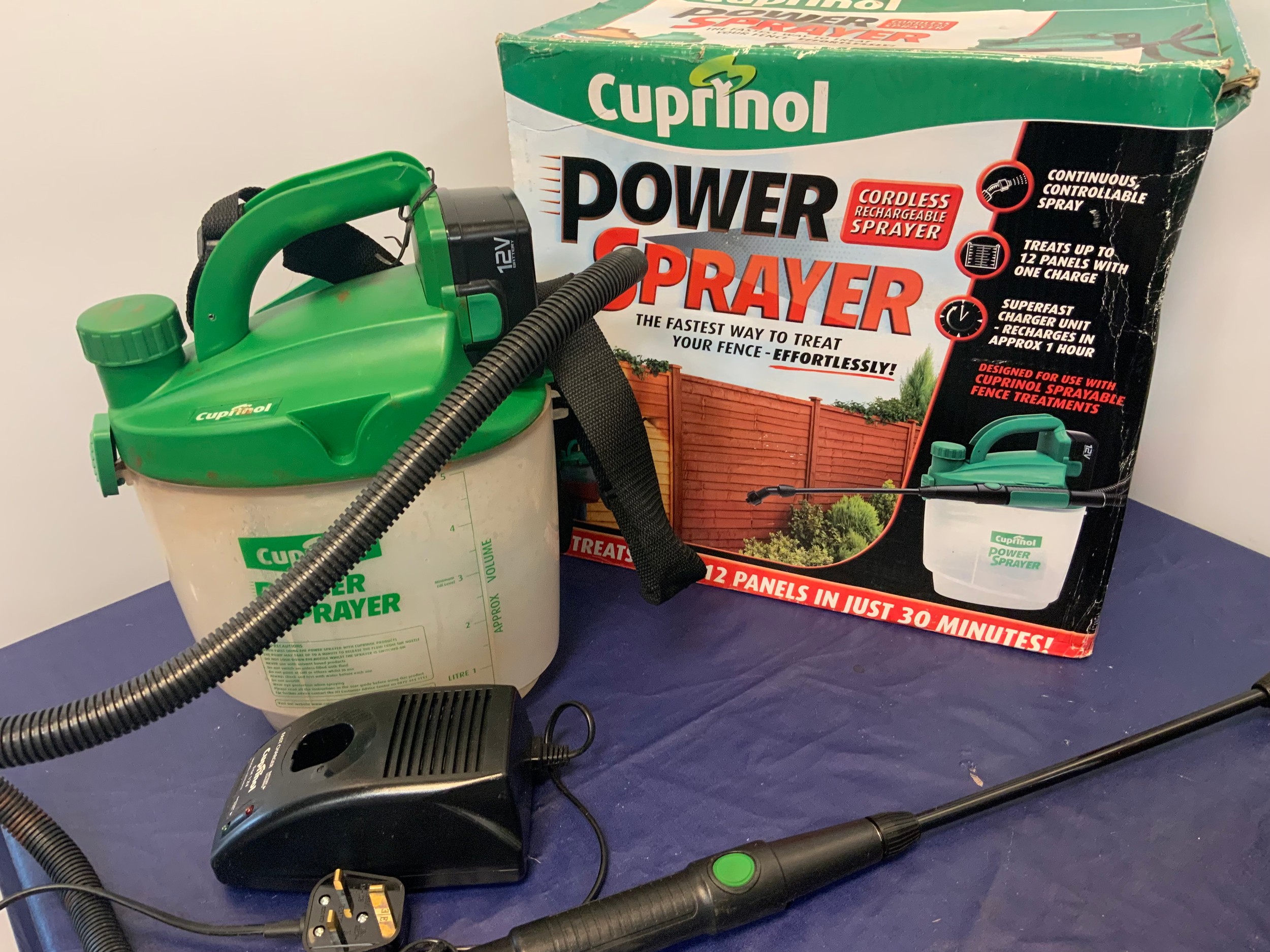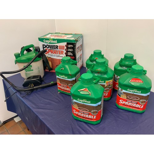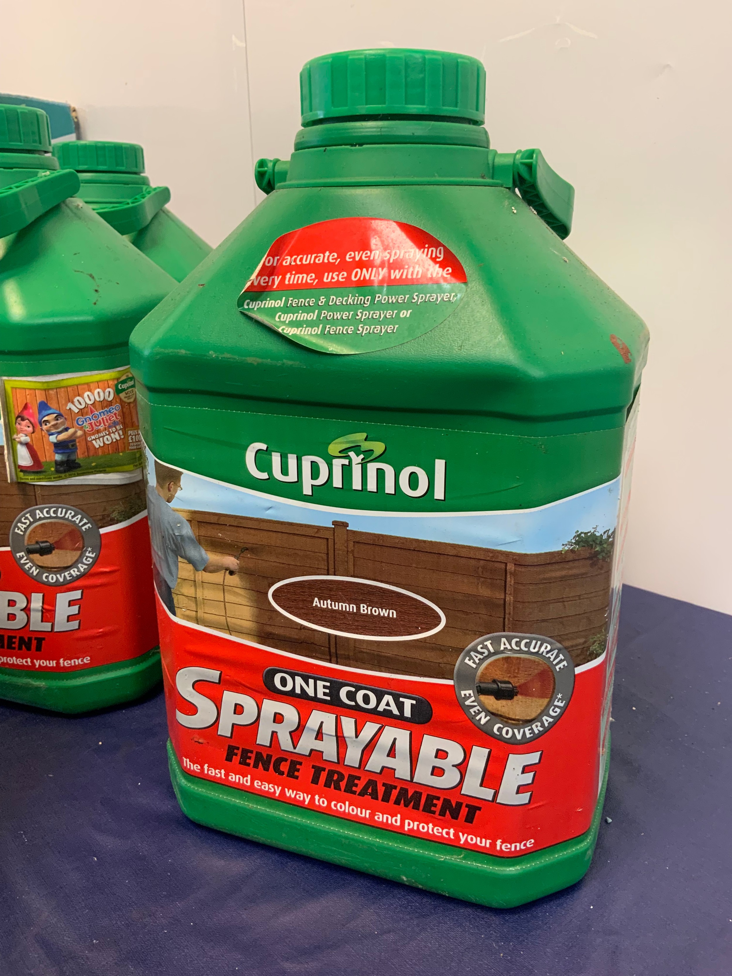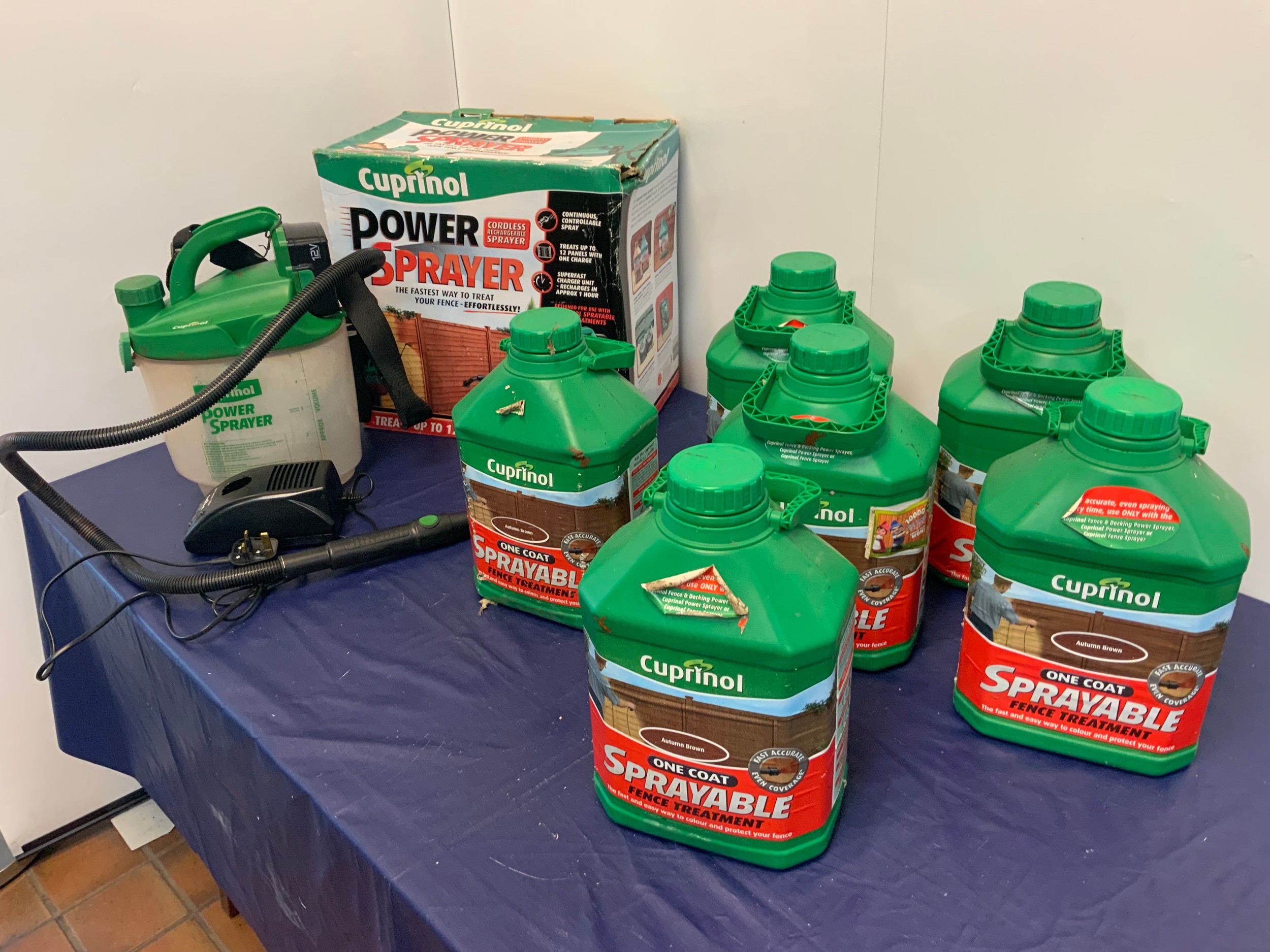 CUPRINOL 12V CORDLESS FENCE SPRAYER RRP £30 & 6 5L TUBS OF AUTUMN BROWN SPRAYABLE TIMBER PRESERVE £22 EACH TOTAL RRP £162