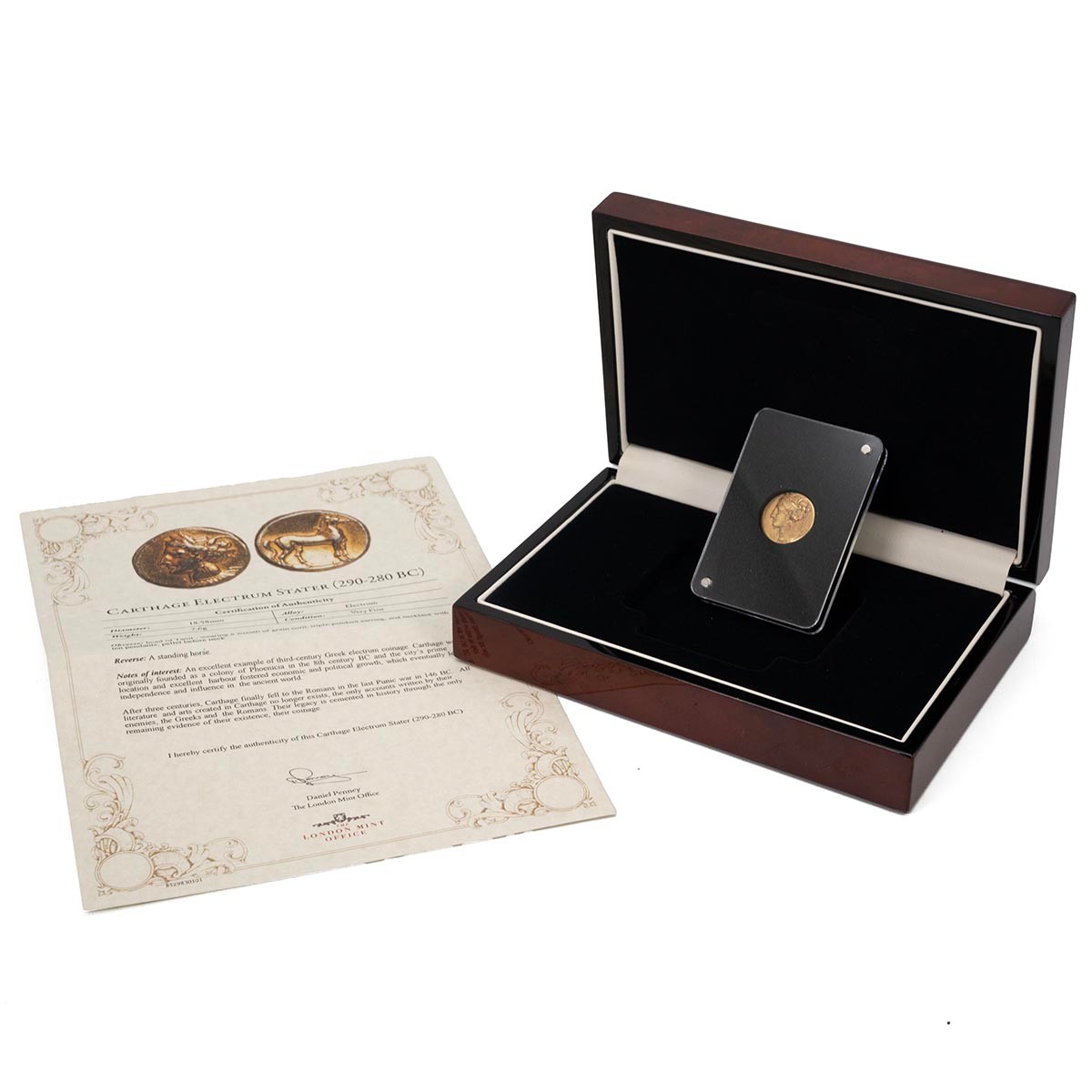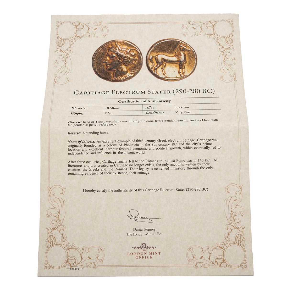 Zeugitana, Carthage electrum Stater (290-280 BC), head of Tanit, revs. horse standing. 7.6 grams, 18.5mm, F.