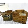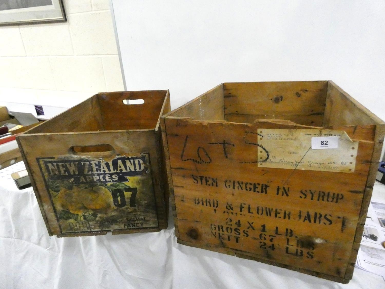 Two vintage pine boxes to include stem ginger also New Zealand apples.