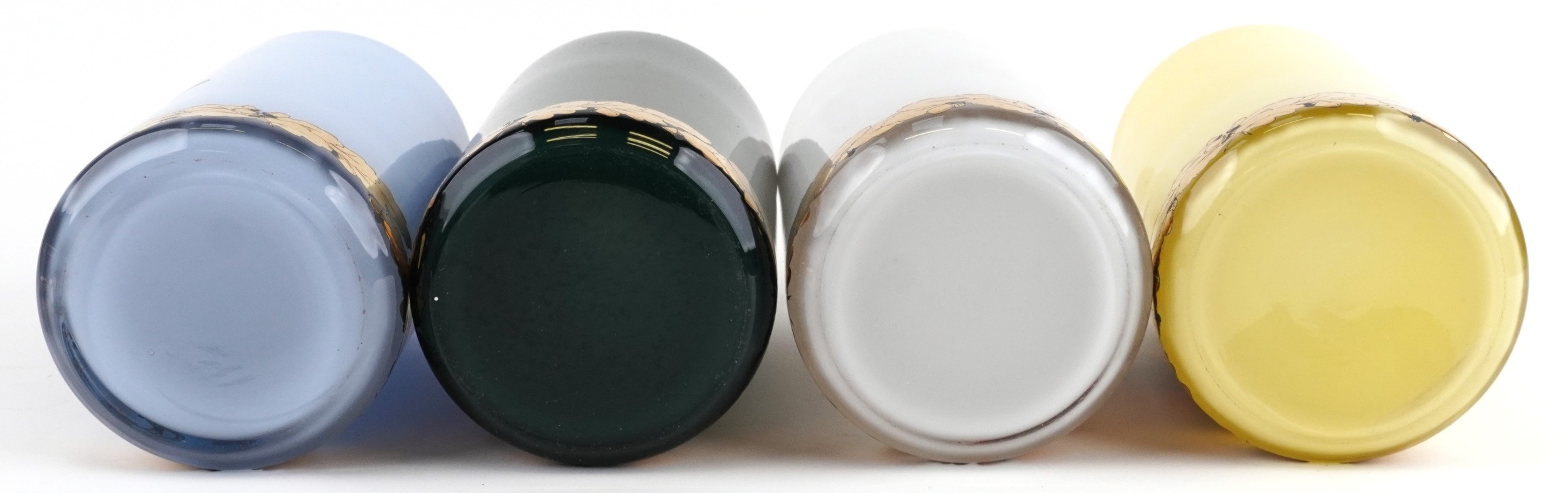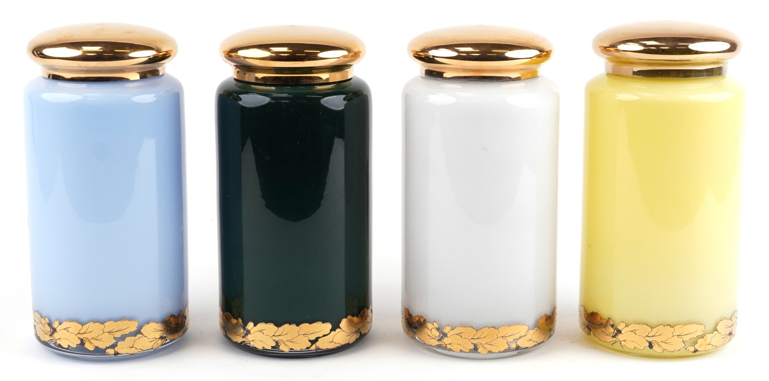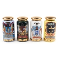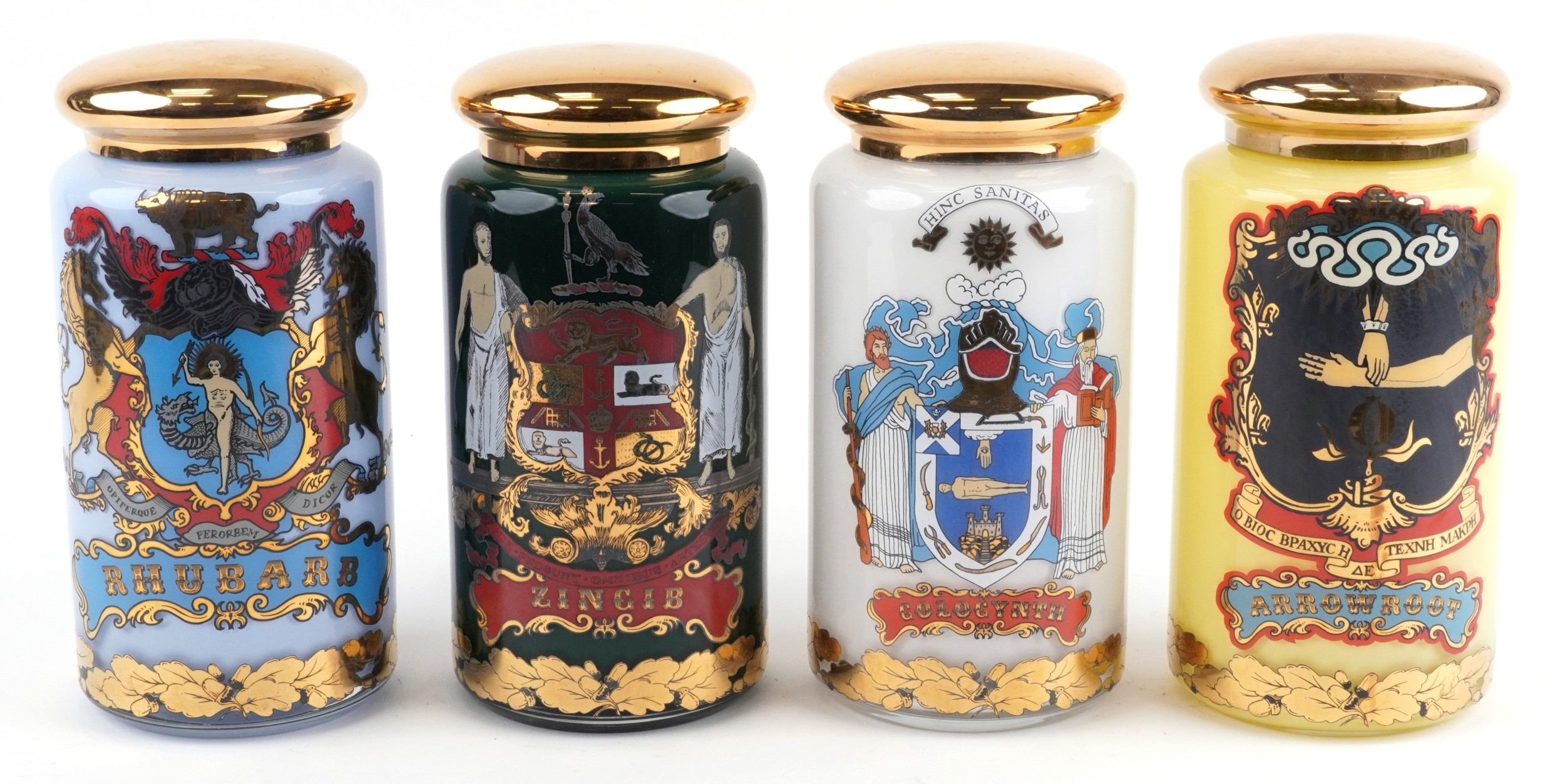 A set of four Royal Pharmaceutical Society enamelled and 22ct gold gilt glass apothecary/spice jars, designed by S Wheaton and manufactured by Carlisle Collections to commemorate the 150th anniversary of the society comprising Rhubarb, Zincib, Arrowroot and Colocynth, 33cm high.