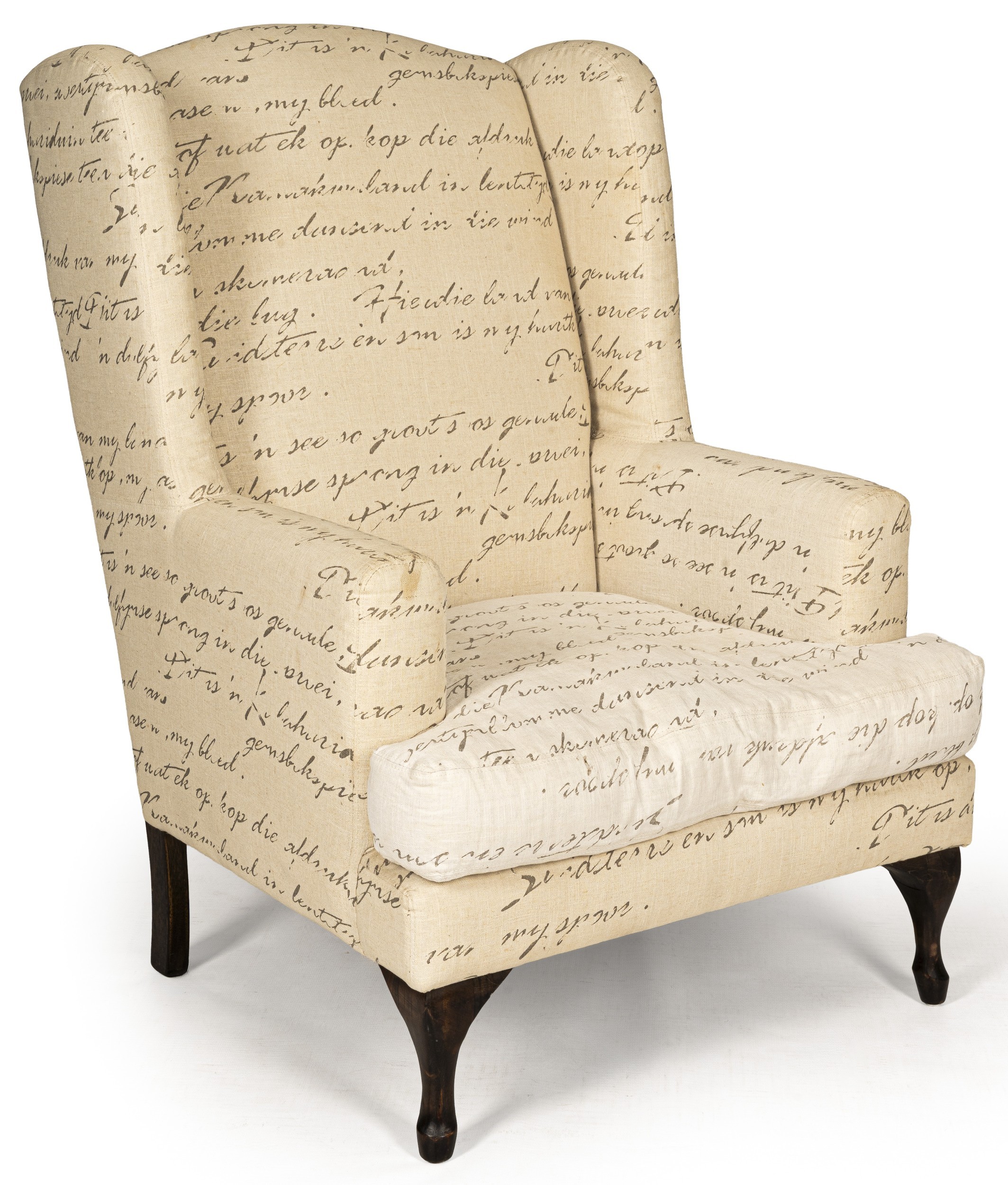 The high back with gently rolled wings, padded arms, and a loose seat cushion, all raised on dark-stained cabriole legs