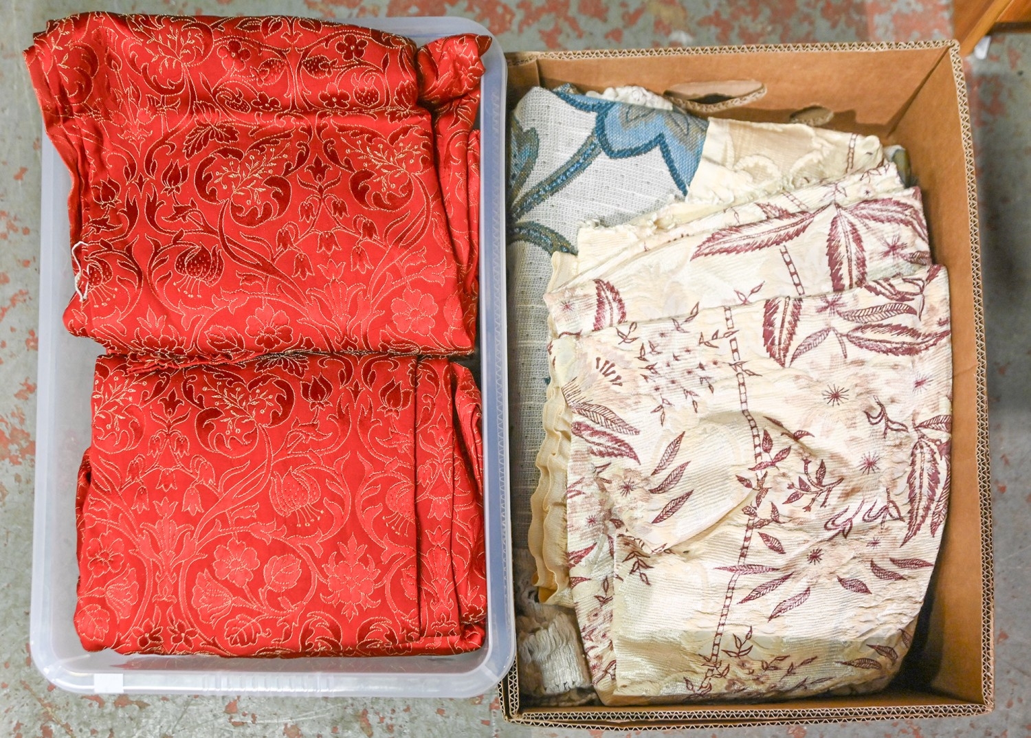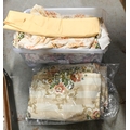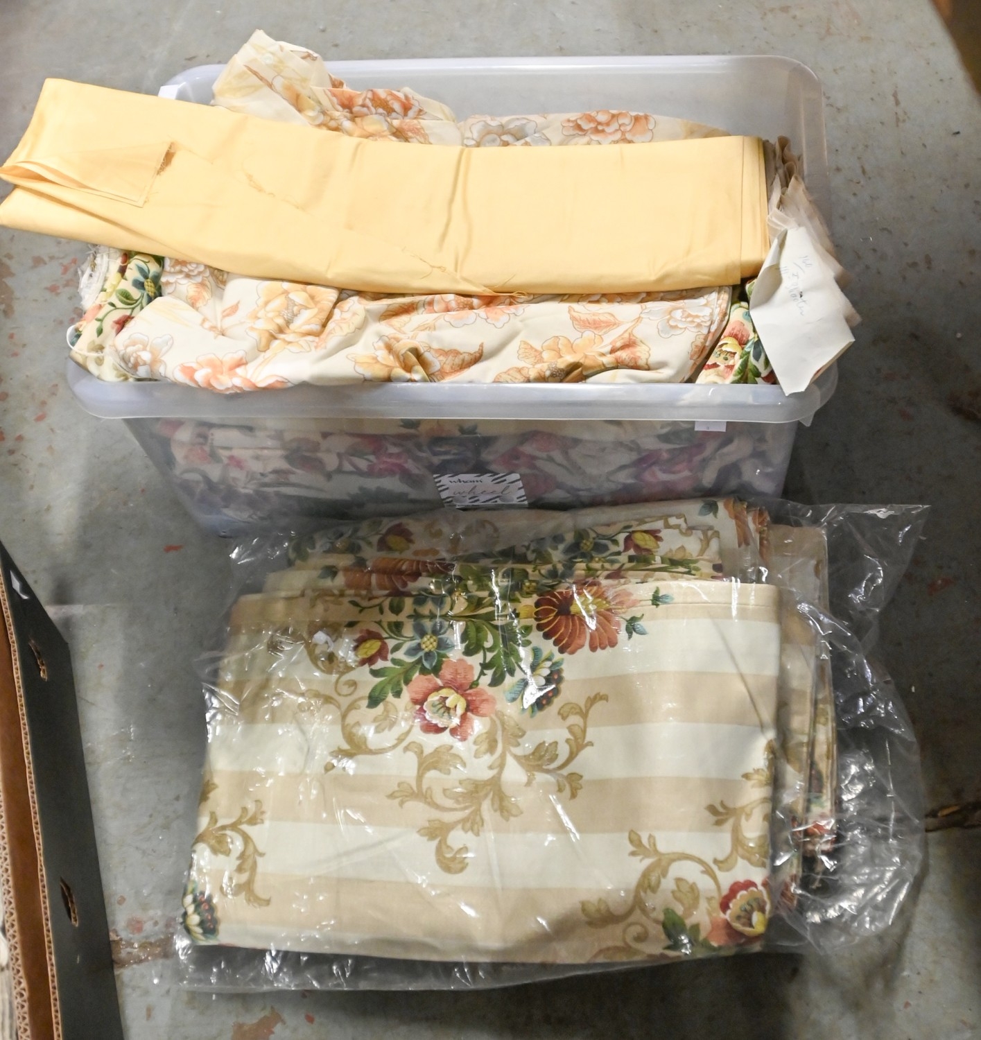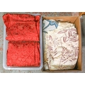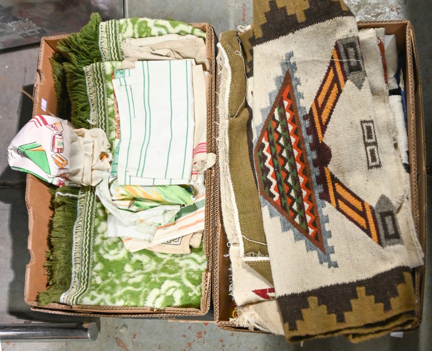 Miscellaneous linens and fabric, to include flat weave rugs and curtains, etc