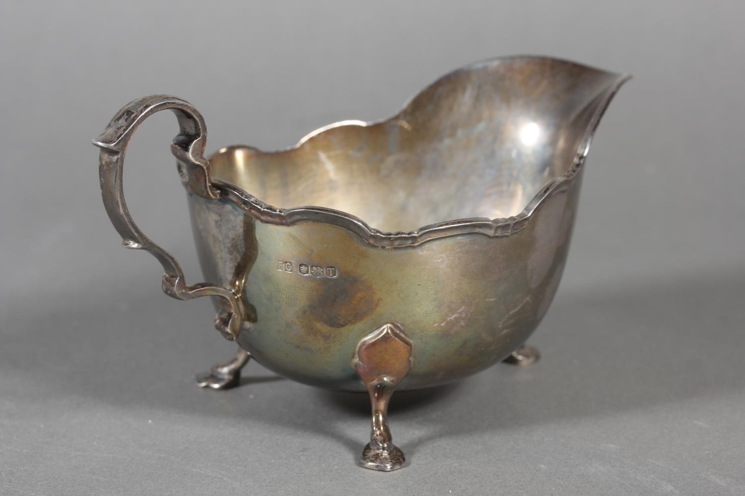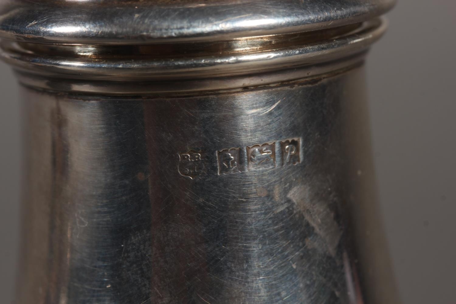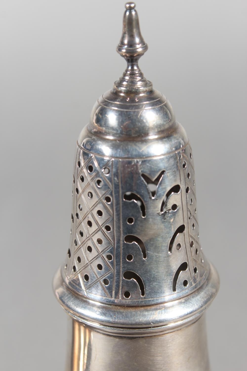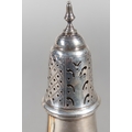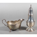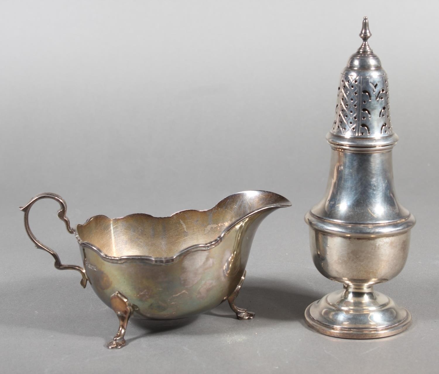 Silver sugar castor, Barker Brothers Silver Ltd, Birmingham, 1964, 114g and a silver sauce boat, Frank Cobb & Co Ltd, Sheffield, 1961, 158g.