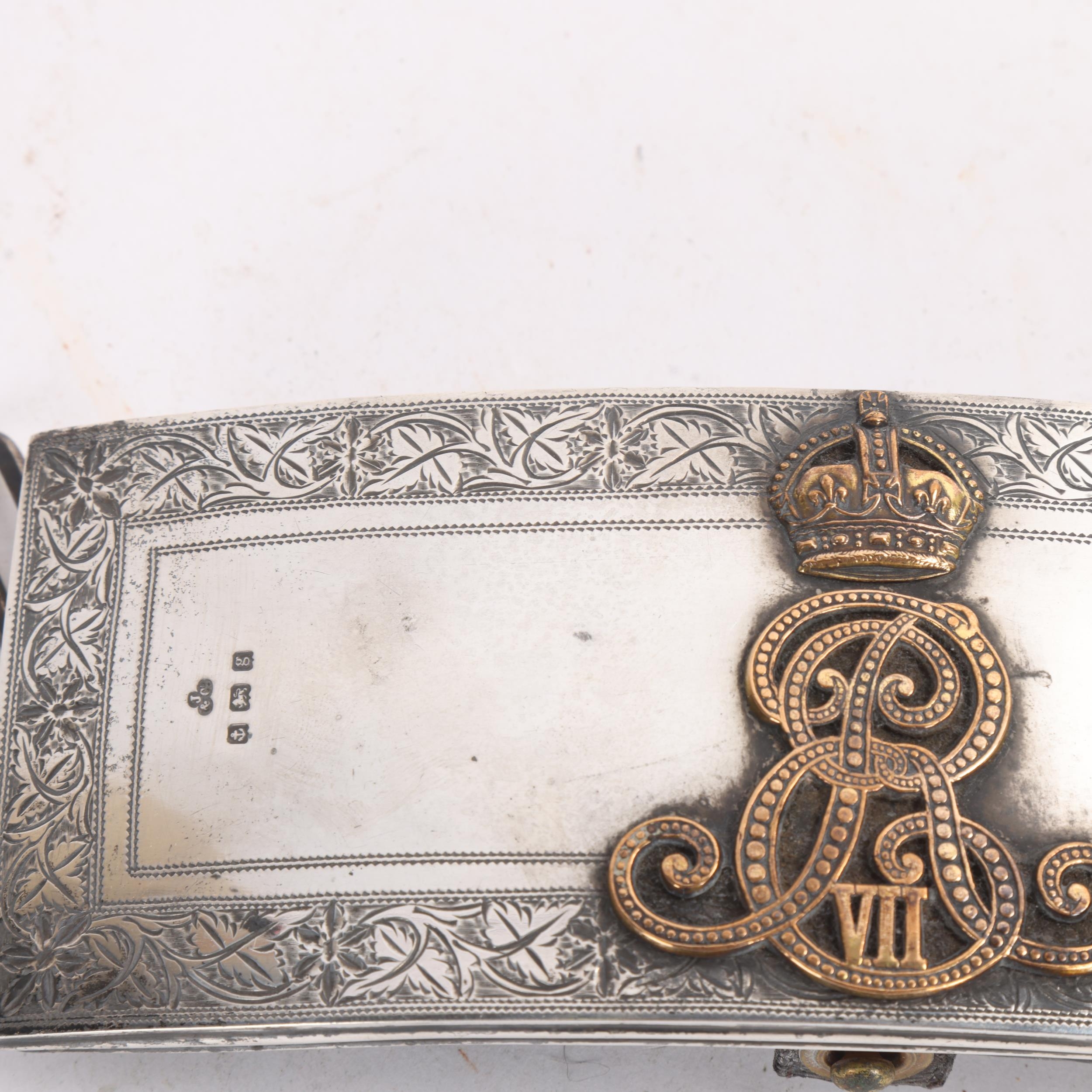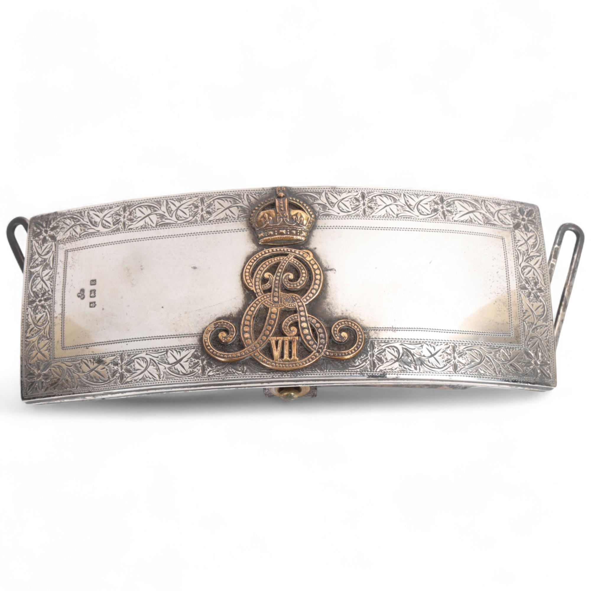 An Edward VII silver-mounted Cavalry Officer's pouch with Royal cypher, hallmarks Birmingham 1906, 18cm x 7cm